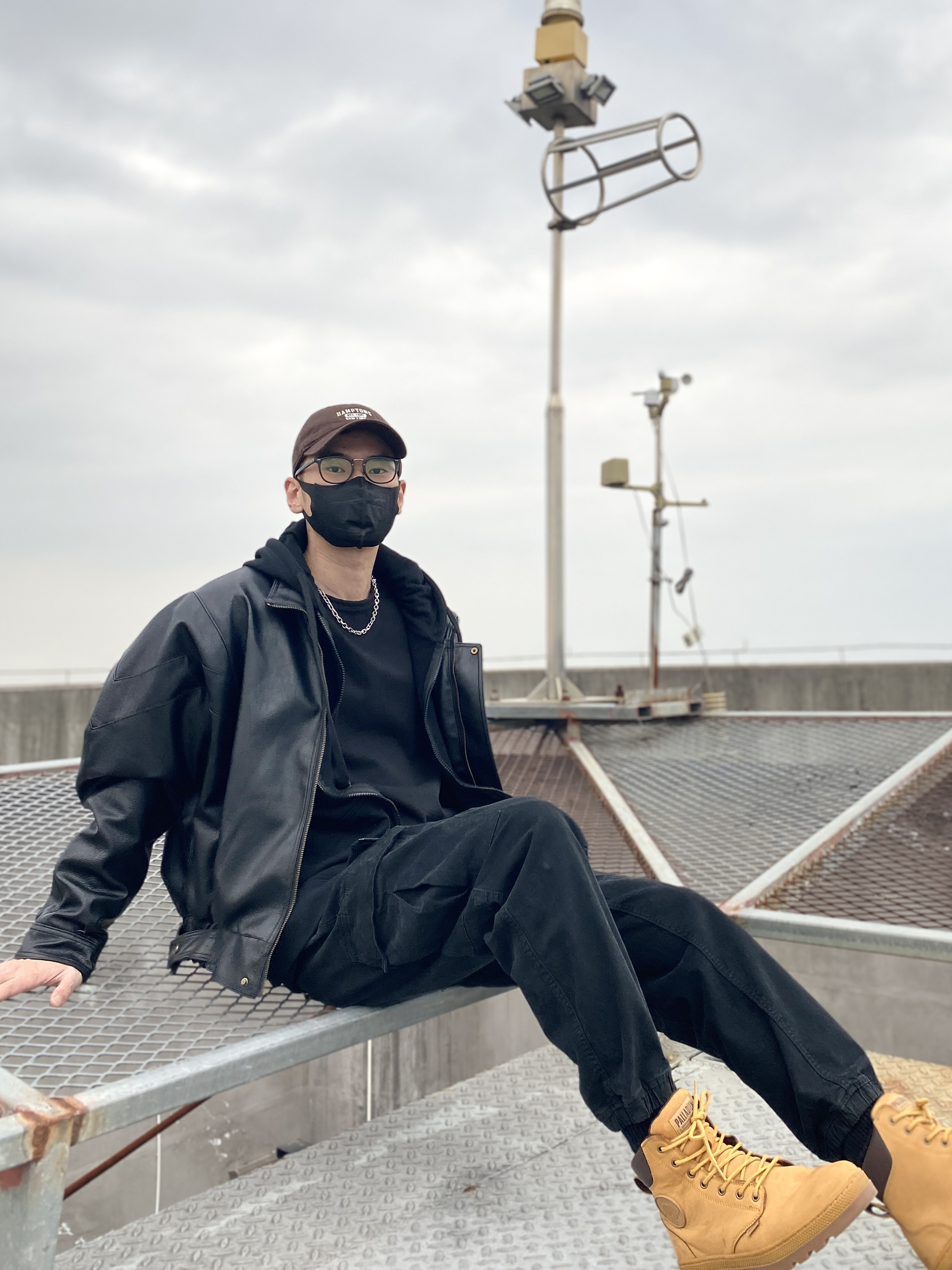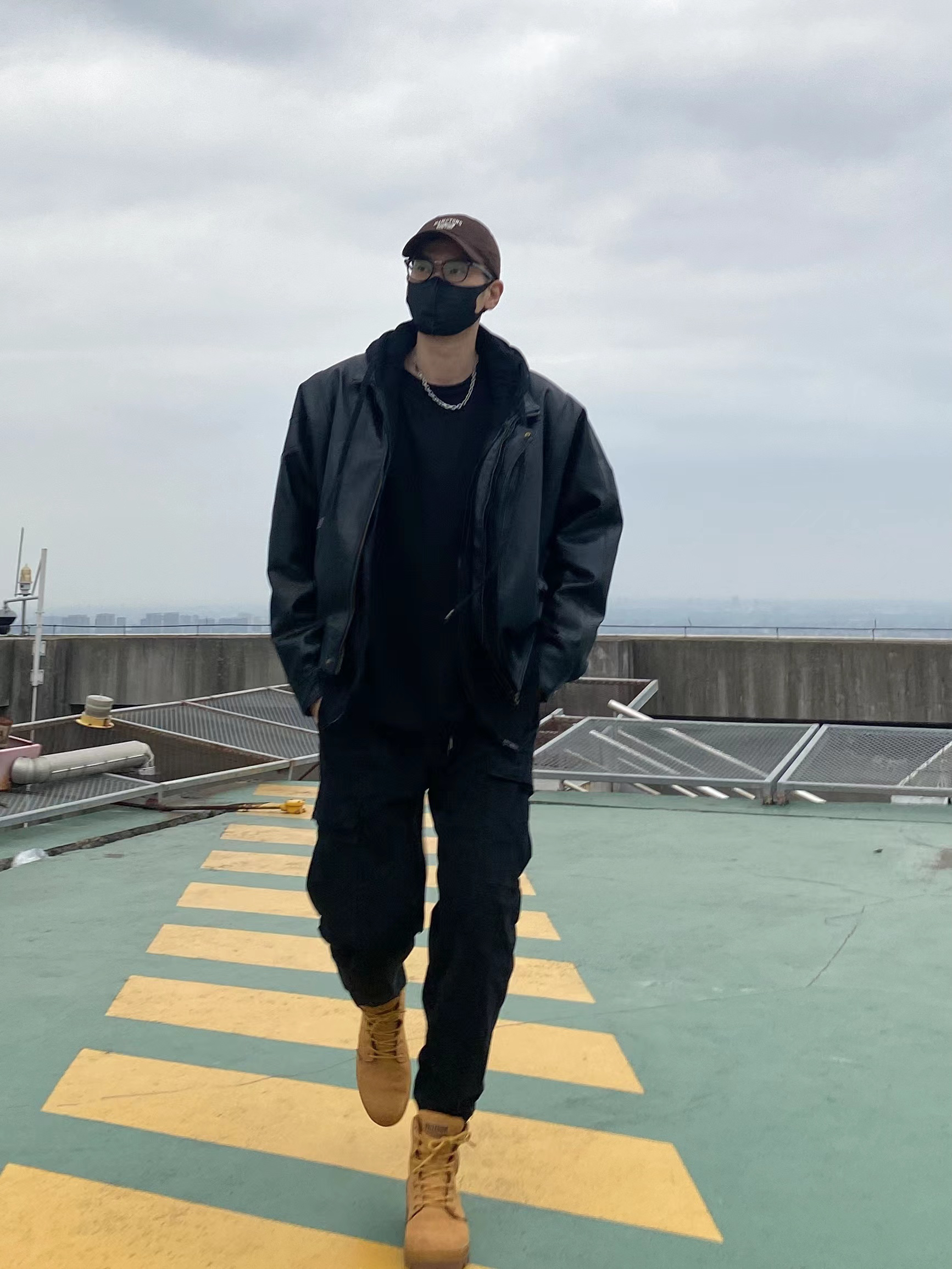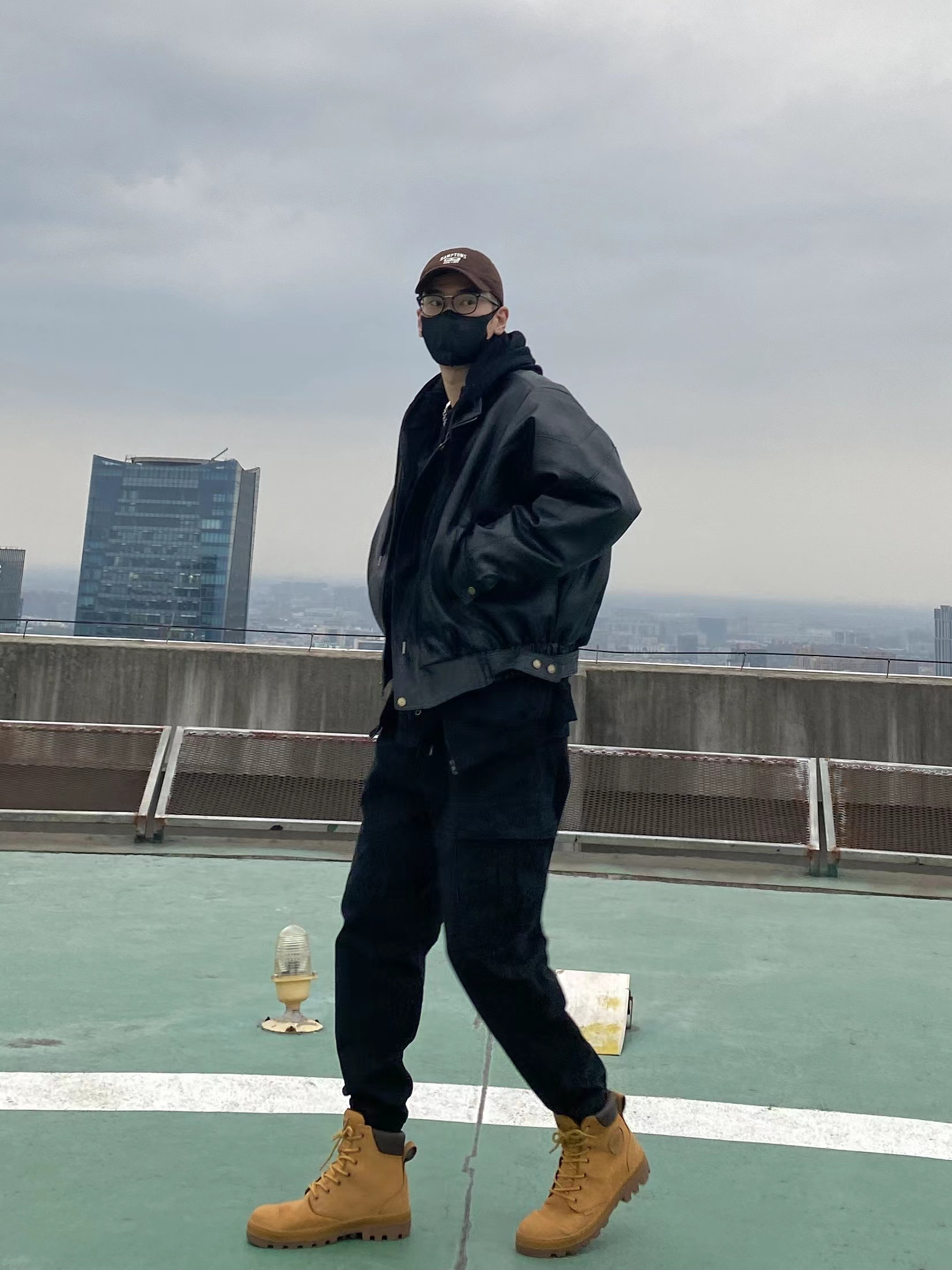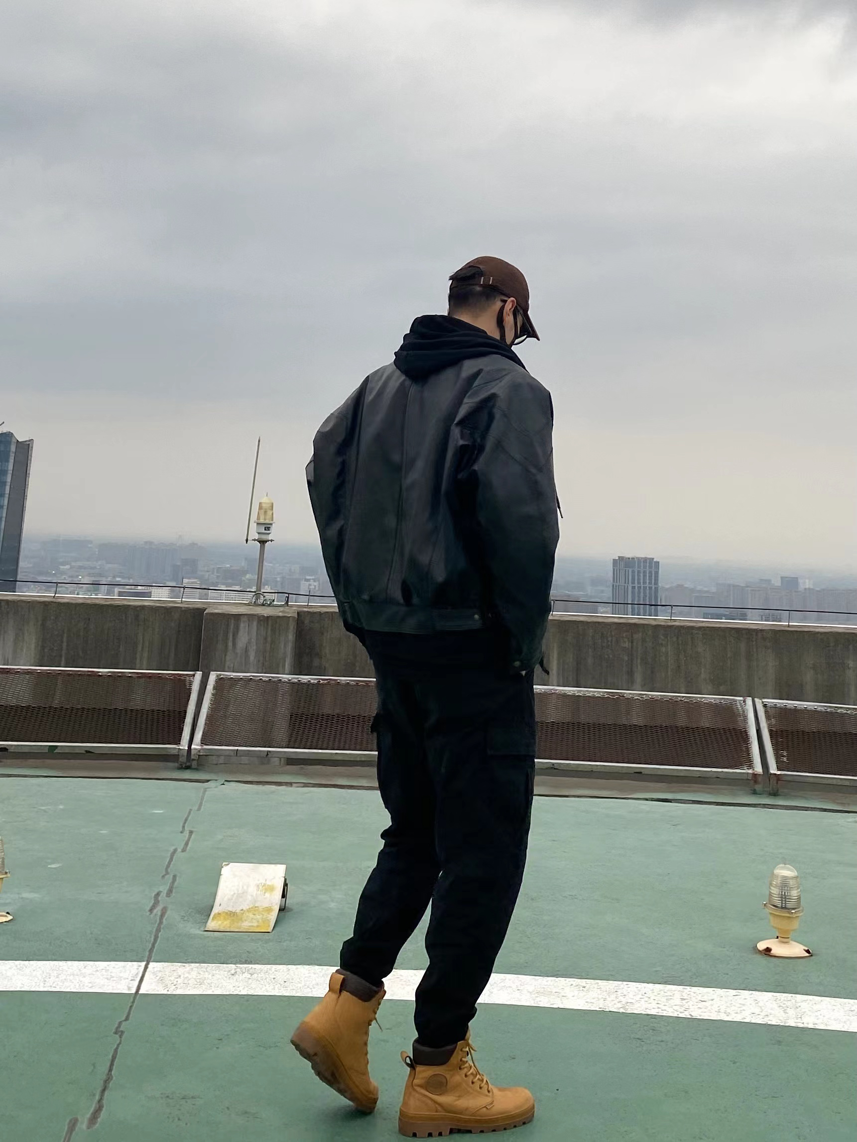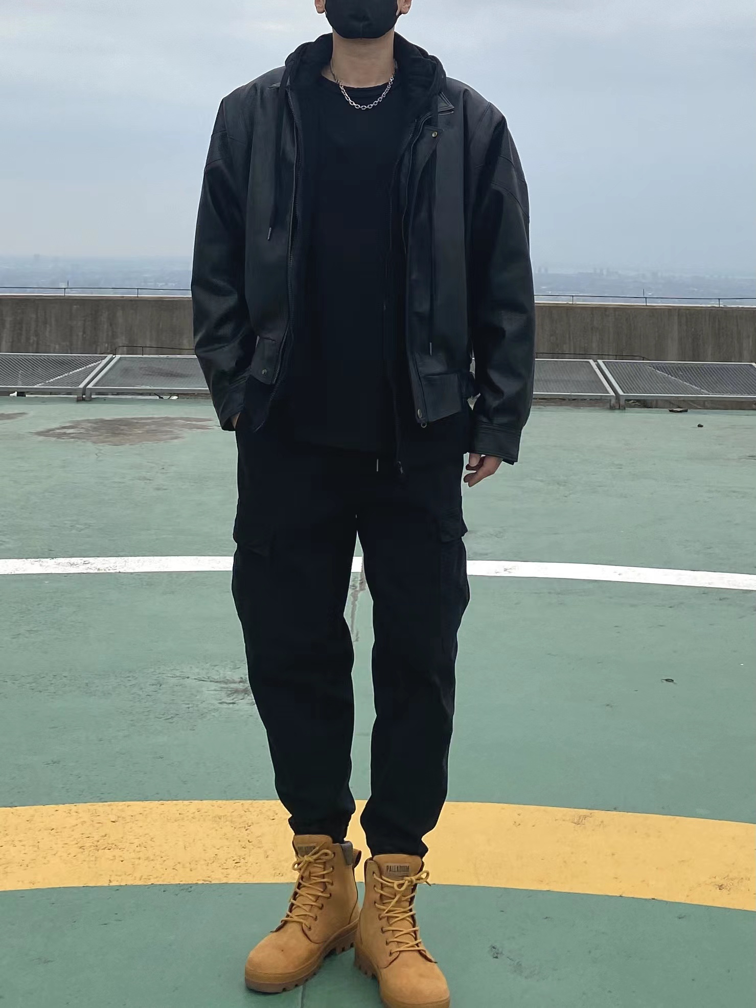 今天这套先用圆领黑T做打底,内搭穿一件拉链开衫连帽卫衣,裤子选择不挑腿型的直筒多口袋束脚工装裤,鞋子上脚硬汉必备的帕拉丁大黄靴,接着套上宽松阔版立体剪裁机车皮衣棉服夹克,最后戴一顶咖啡色棒球帽,OK,出门看看搭配效果吧! - 今日穿搭 衣服裤子:NICE LILI 鞋子:帕拉丁