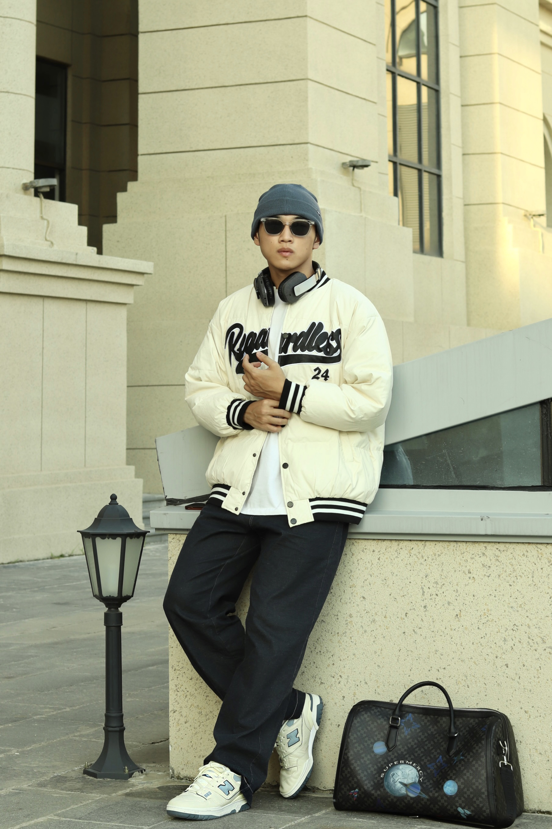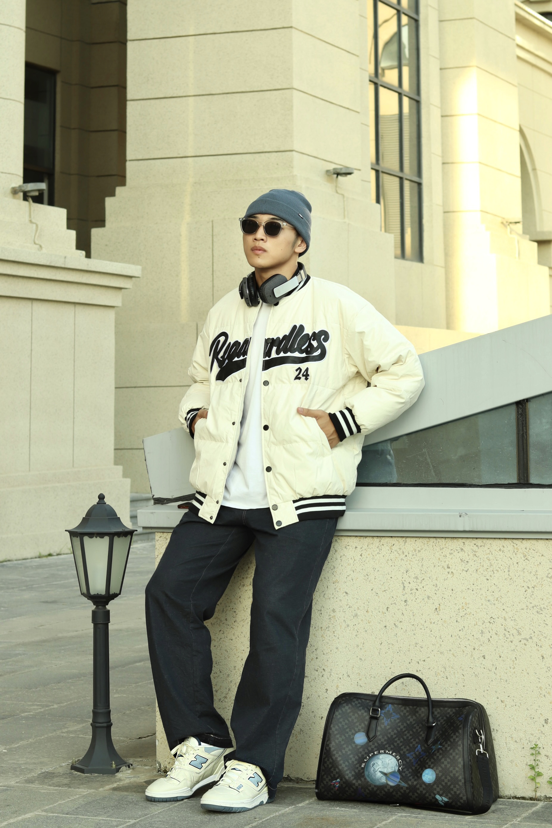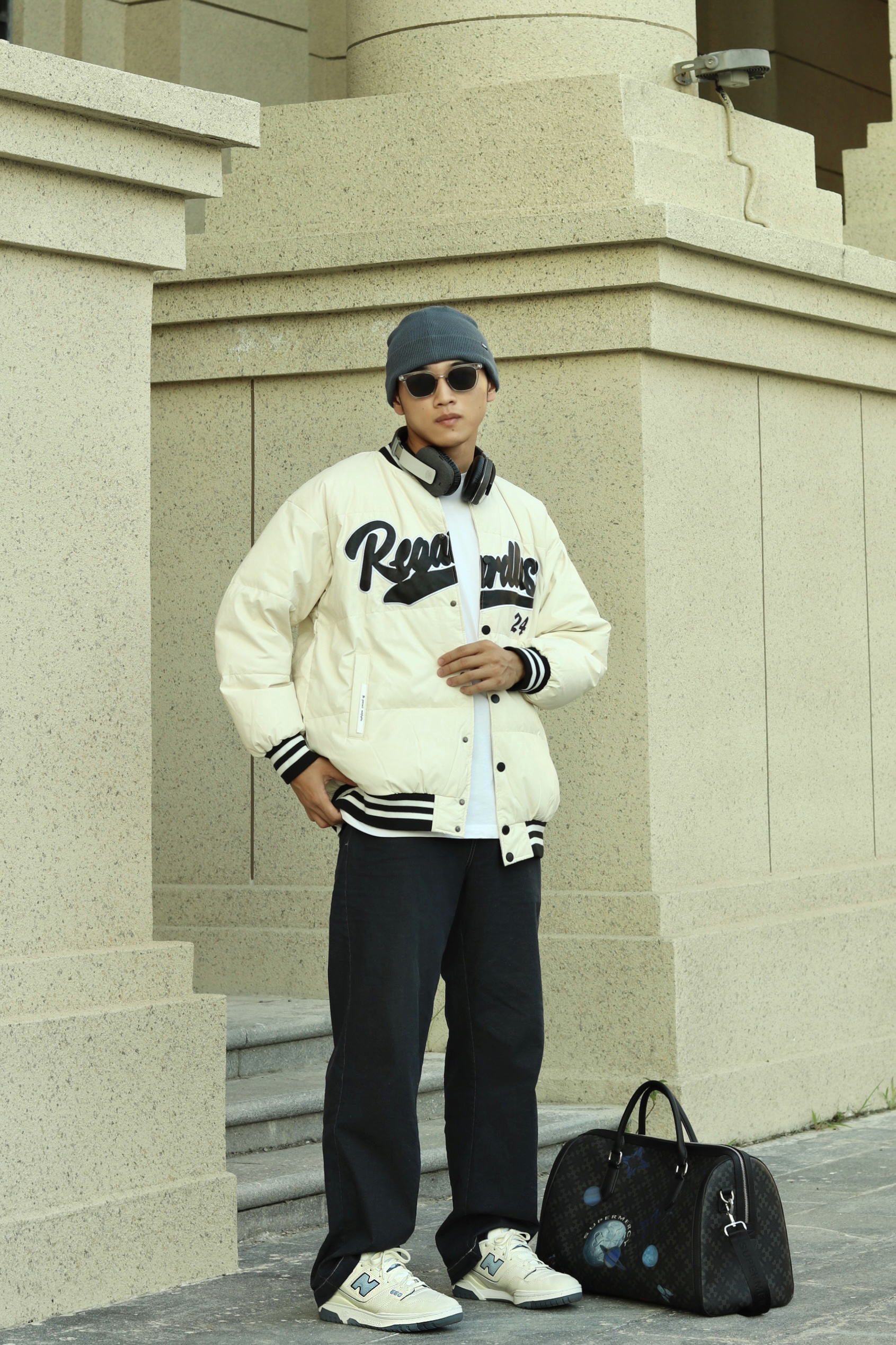 halo大家 这里是不会唱歌的章鱼章鱼哥 最近天气穿棒球服正合适 那么今天章鱼就给大家分享一下 章鱼的复古棒球服穿搭 上身一件白色T恤打底 外穿一件白色拼接棒球服 裤子选择一条深蓝色直筒牛仔裤 搭配一双nb550复古蓝精灵配色 最后再戴一顶同色系冷帽 穿搭小tips 整体以米白色为主 用点饱和度较低的蓝色增加复古感 最后再戴上耳机整体感觉就出来了