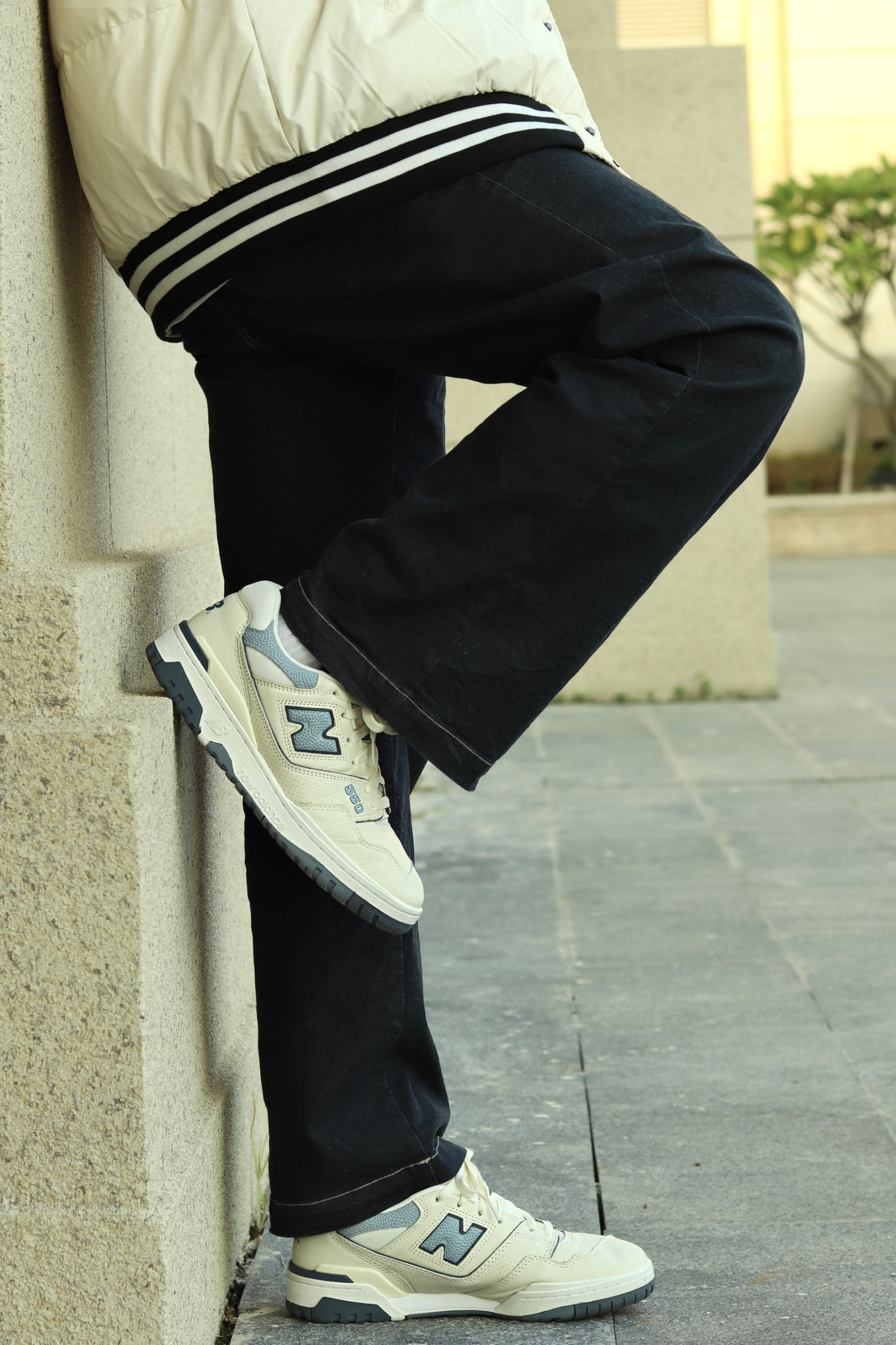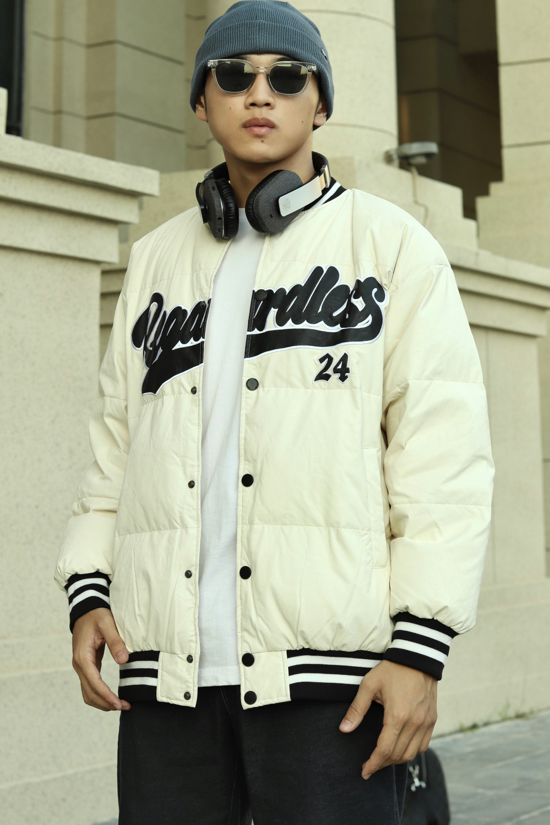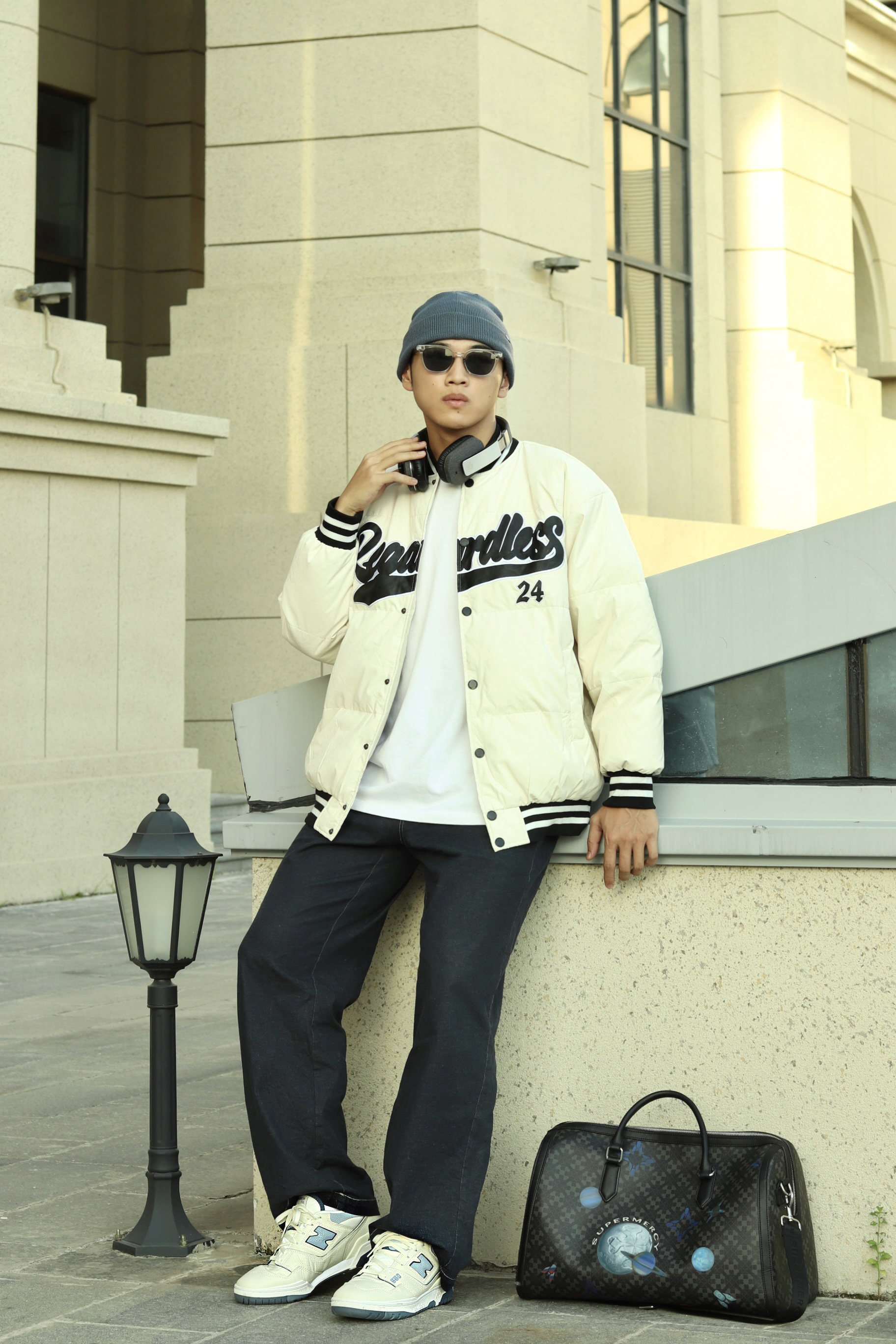 halo大家 这里是不会唱歌的章鱼章鱼哥 最近天气穿棒球服正合适 那么今天章鱼就给大家分享一下 章鱼的复古棒球服穿搭 上身一件白色T恤打底 外穿一件白色拼接棒球服 裤子选择一条深蓝色直筒牛仔裤 搭配一双nb550复古蓝精灵配色 最后再戴一顶同色系冷帽 穿搭小tips 整体以米白色为主 用点饱和度较低的蓝色增加复古感 最后再戴上耳机整体感觉就出来了