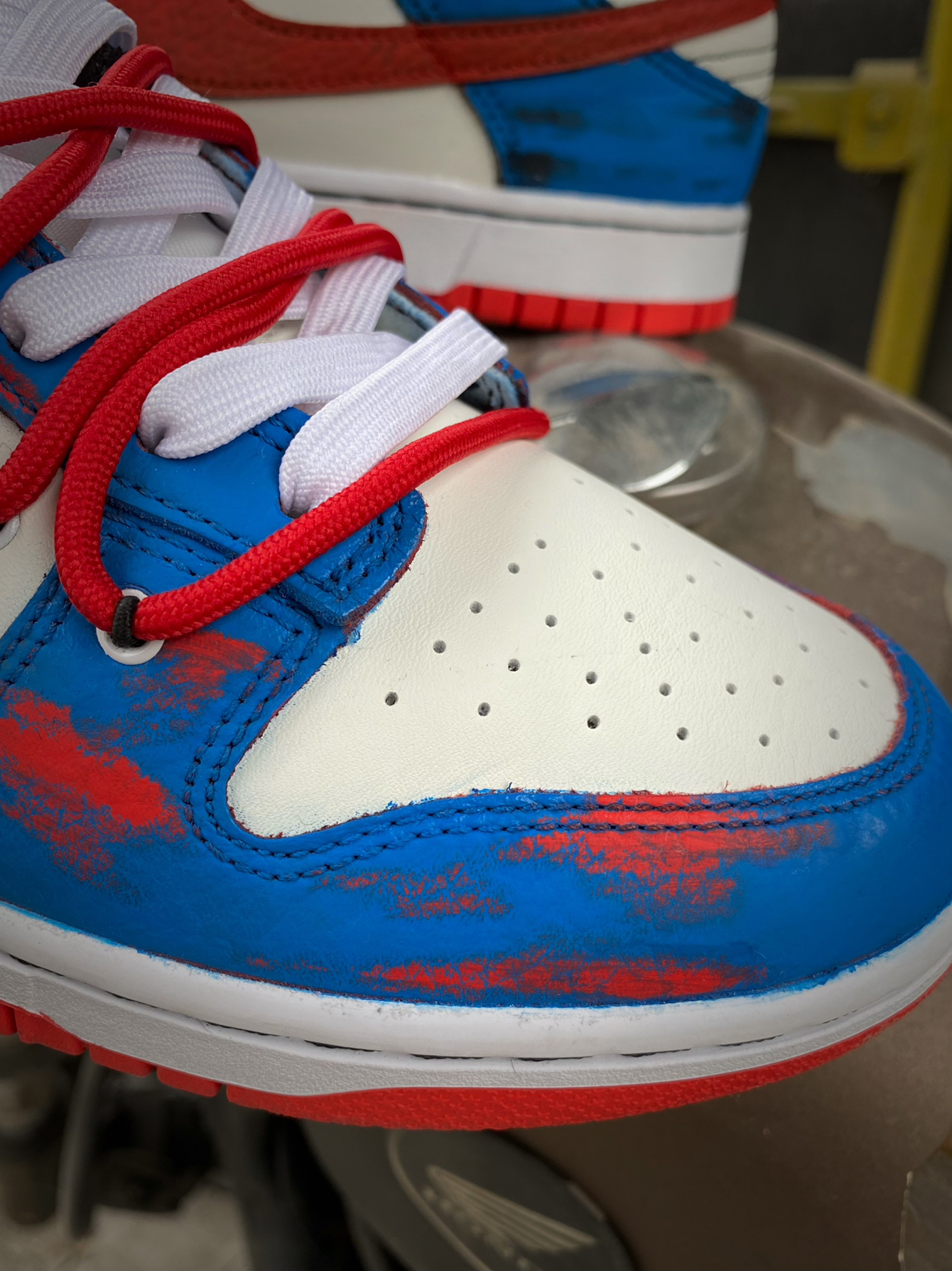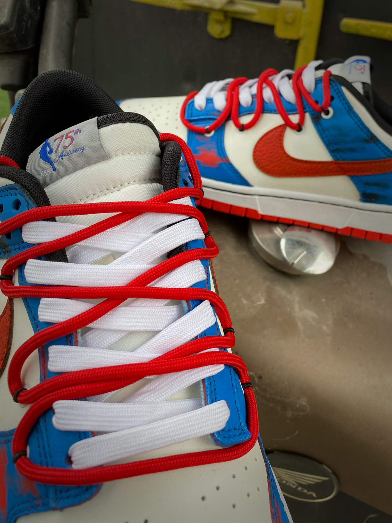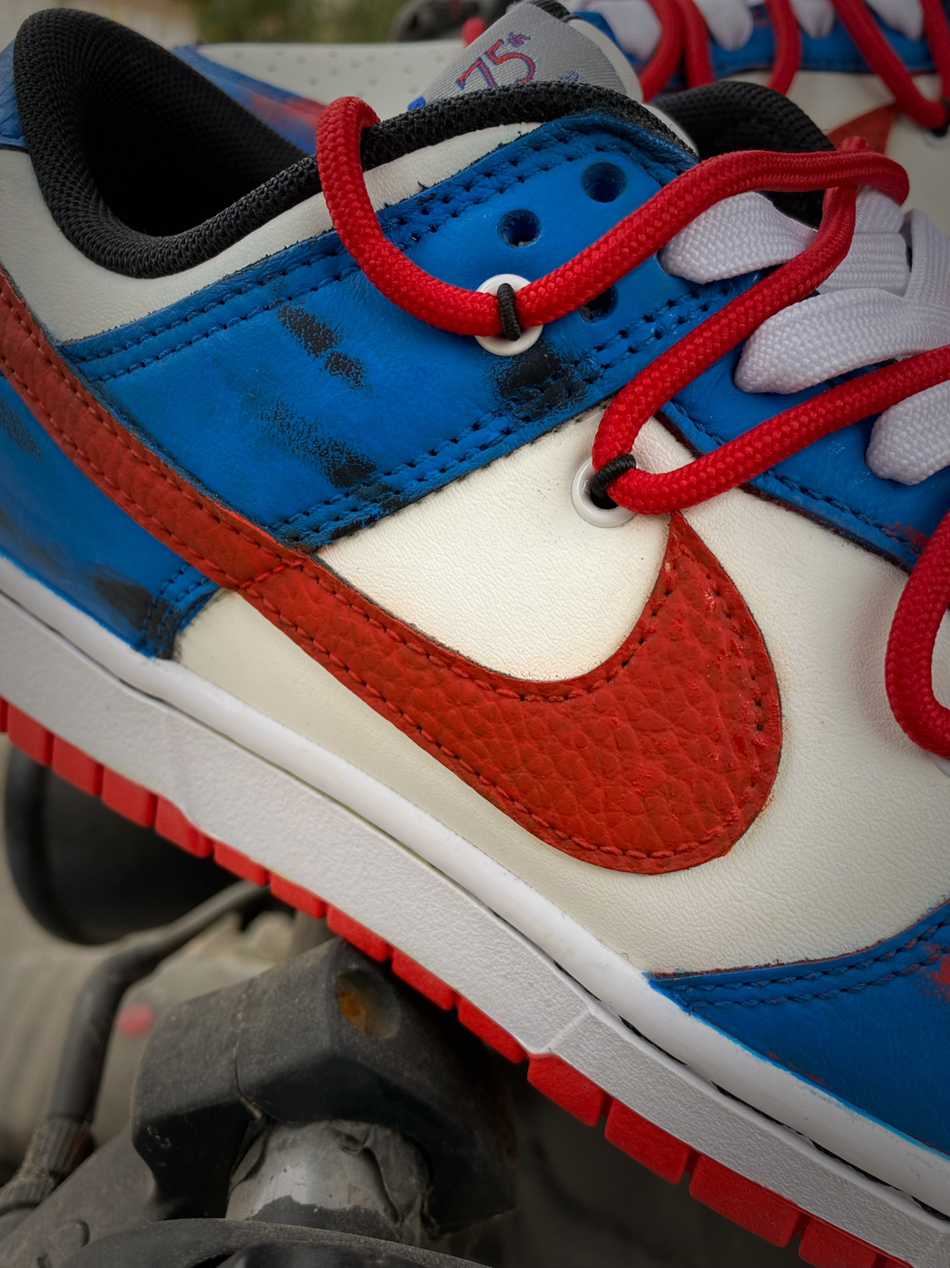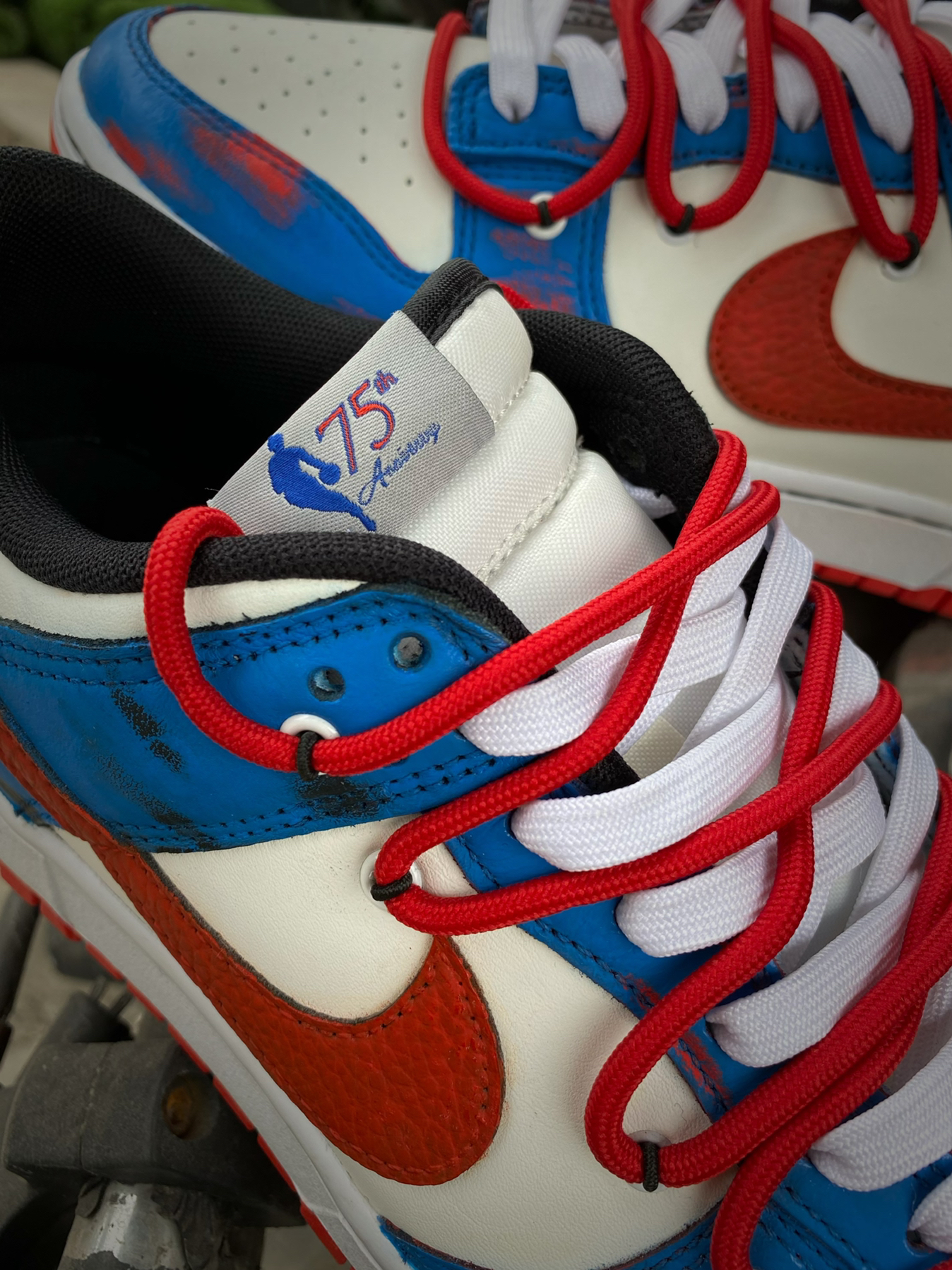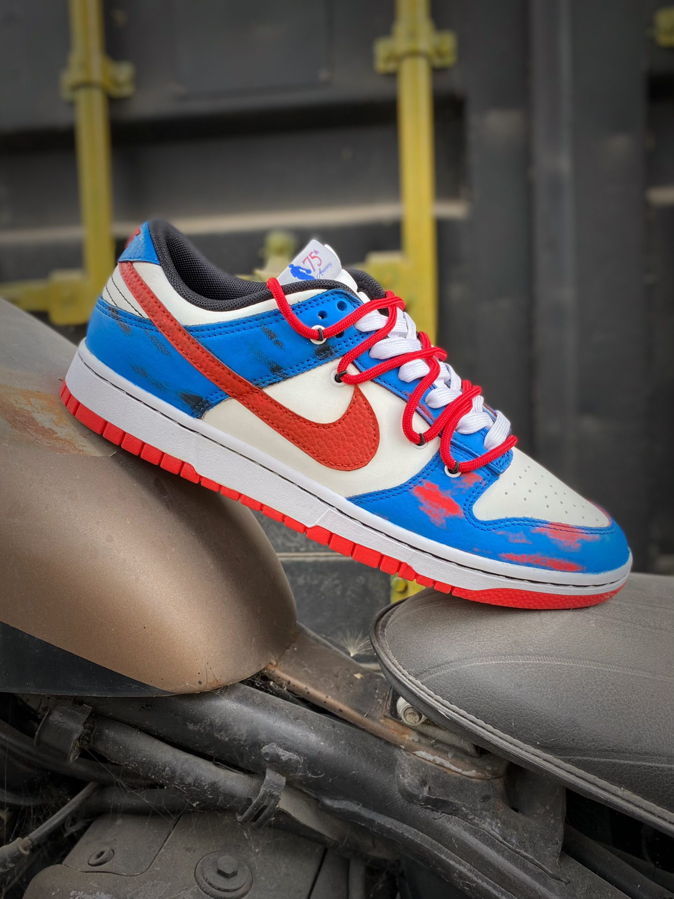 不会还有人没穿过定制版球鞋吧?非常独特有个性的设计风格真的让人太爱啦!今天为大家带来这款定制版Dunk Low! 鞋身以经典的Dunk Low公牛队为蓝本进行改造,在鞋身辅以蓝色的涂鸦,Swoosh也改成了红色,整体视觉效果很赞!满满的街头气息真的是令人心动不已!双层鞋带设计非常有特色!鞋面立体感直接拉满,十分吸引眼球! 颜值超高又很有创意的一款板鞋,又非常百搭,日常出街搭配运动裤或是牛仔裤都...