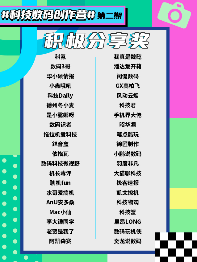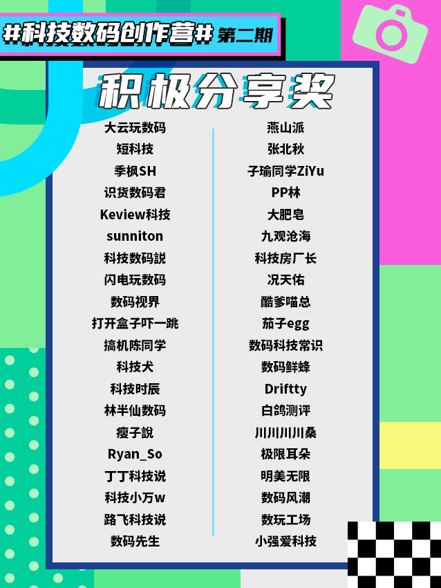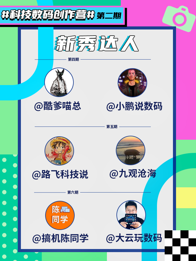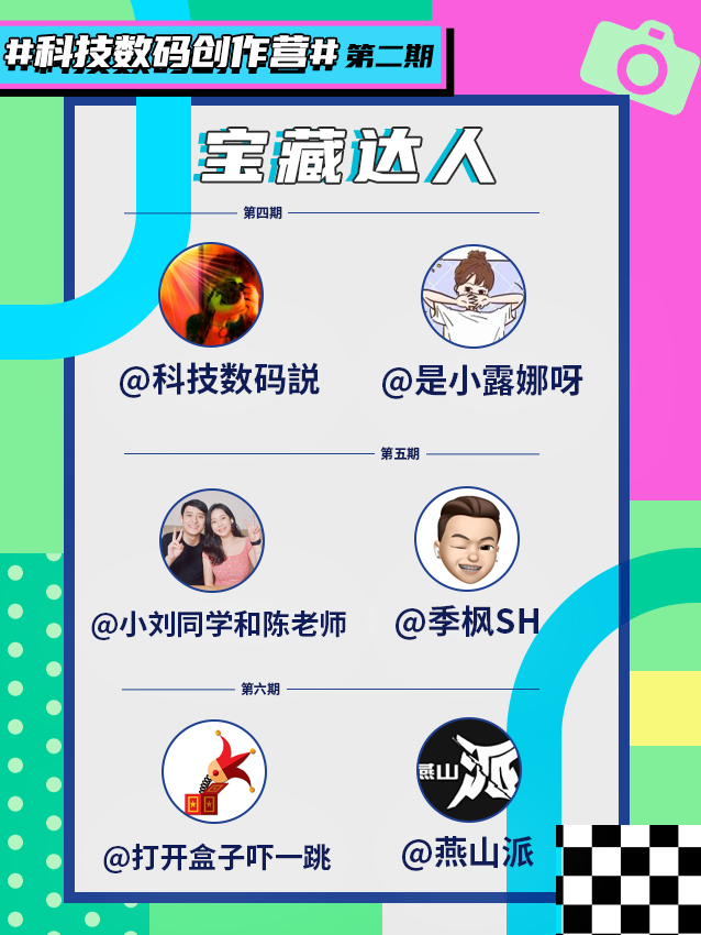 一个半月的时光飞快,识货社区#科技数码创作营#第二期迎来收官之日! 数码君收到好几千篇笔记,感谢大家的热情投稿和对识货社区的大力支持! 本次活动共评选了24位社区优秀达人,其中有12位【宝藏达人】、12位【新秀达人】,他们分别是: 🥇宝藏达人:@科技Daily、@依格瓦、@科技君、@Mac小仙、@阿凯森赛、@PP林、@科技数码説、@是小露娜呀、@小刘同学和陈老师、@季枫SH、@燕山派、@打开盒...