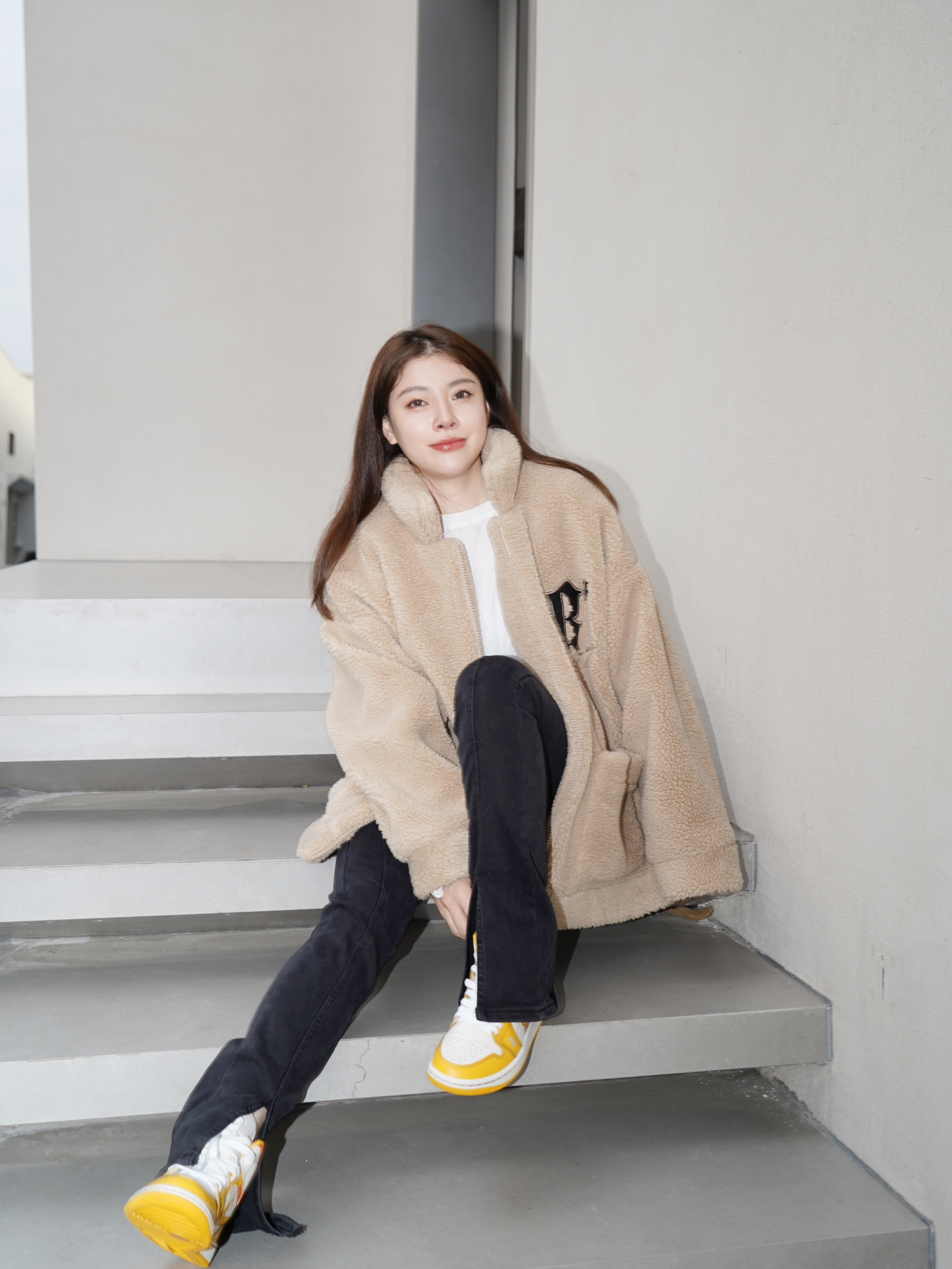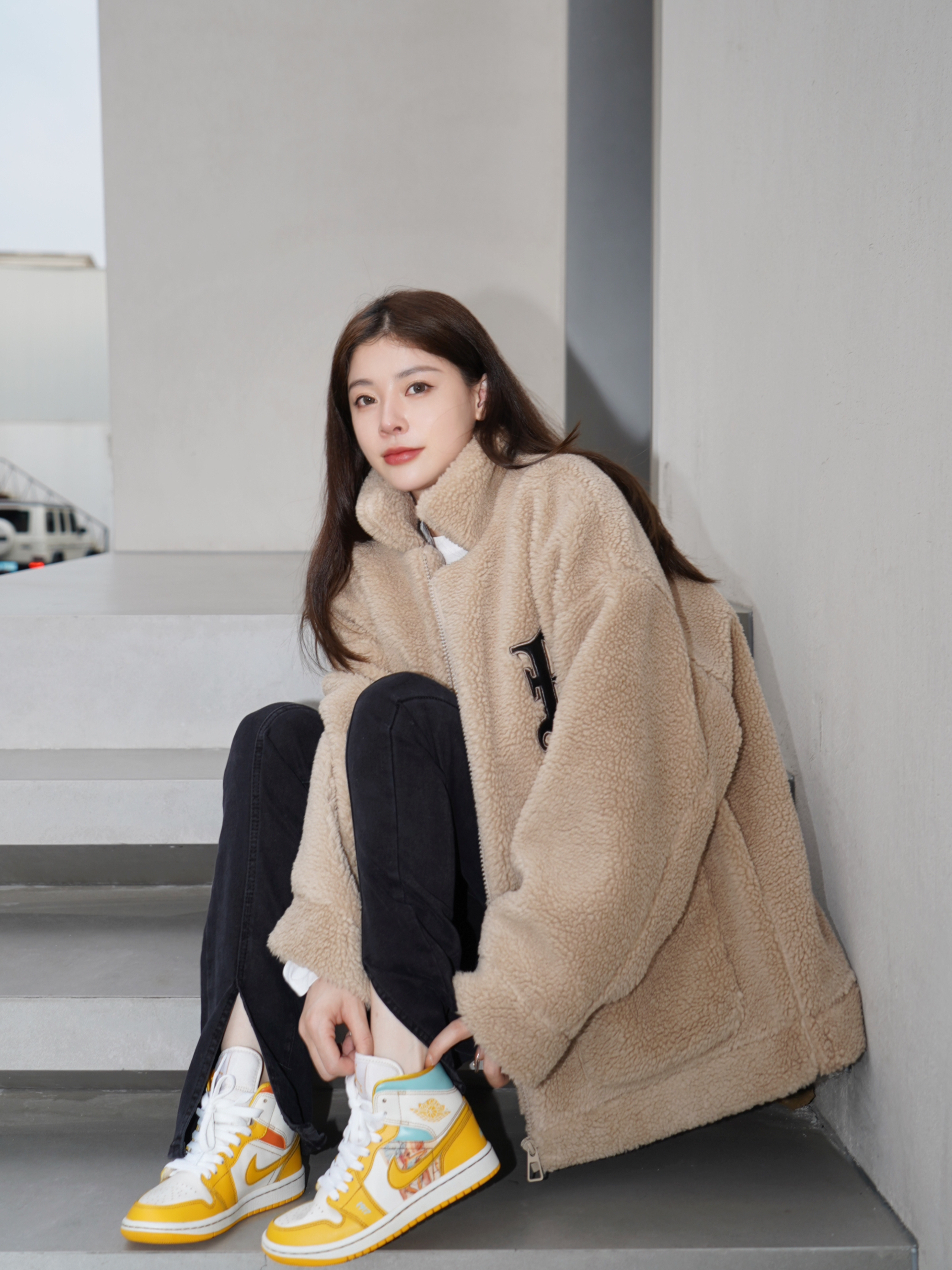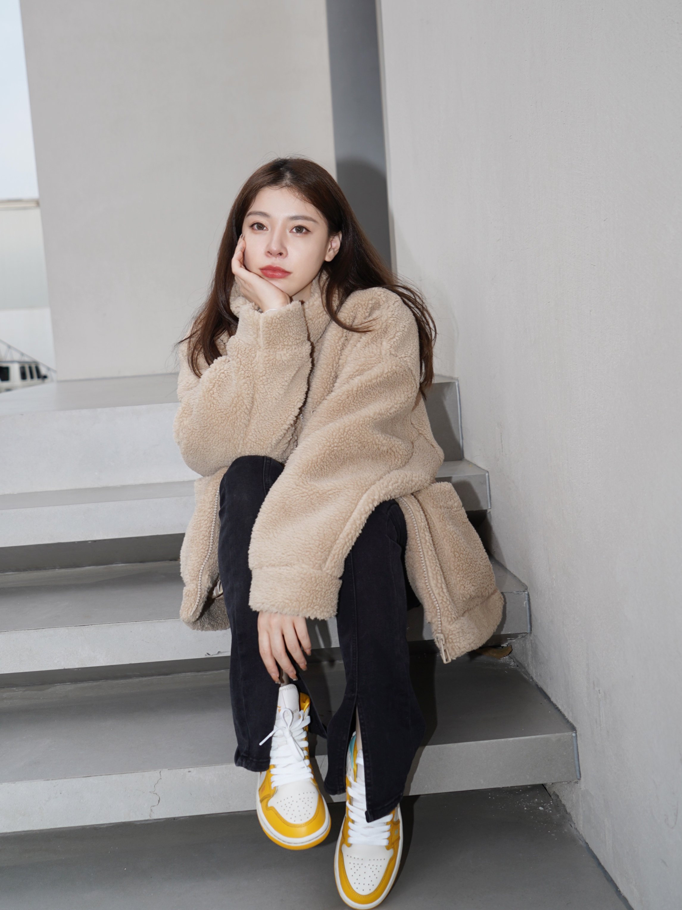 嘻嘻嘻!暖棕色的羊羔毛不常见耶 同色系的运动鞋 zun的好看