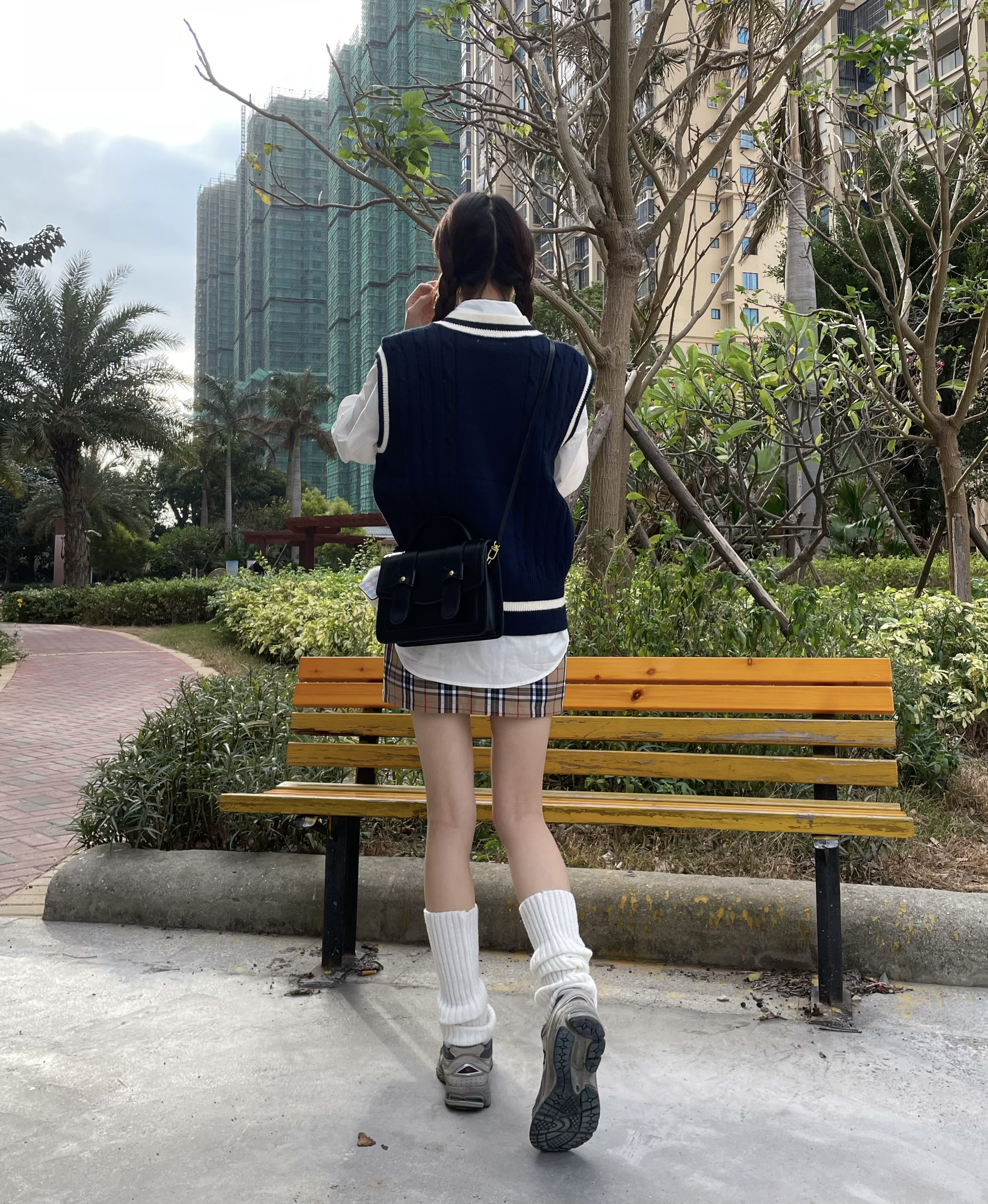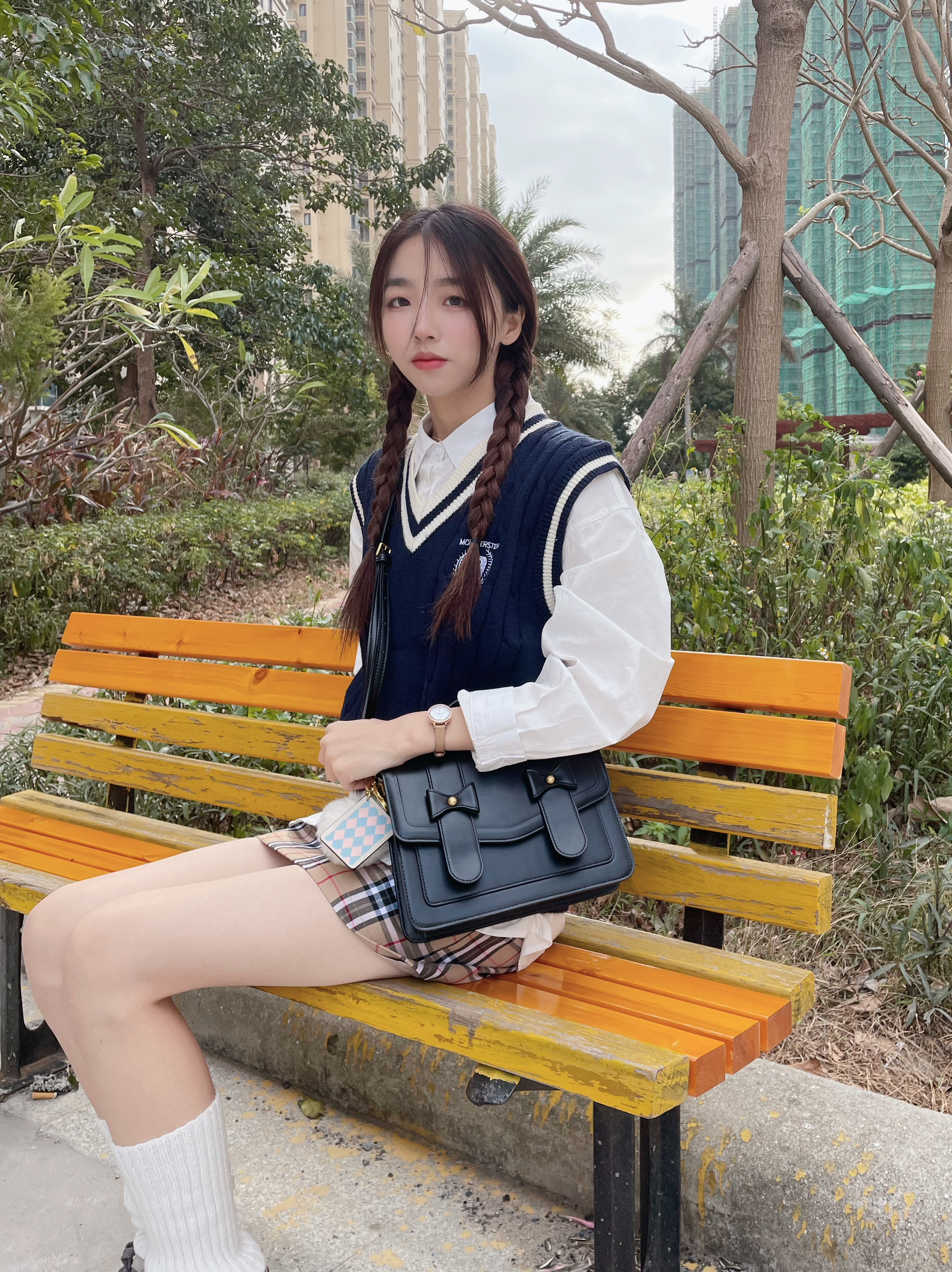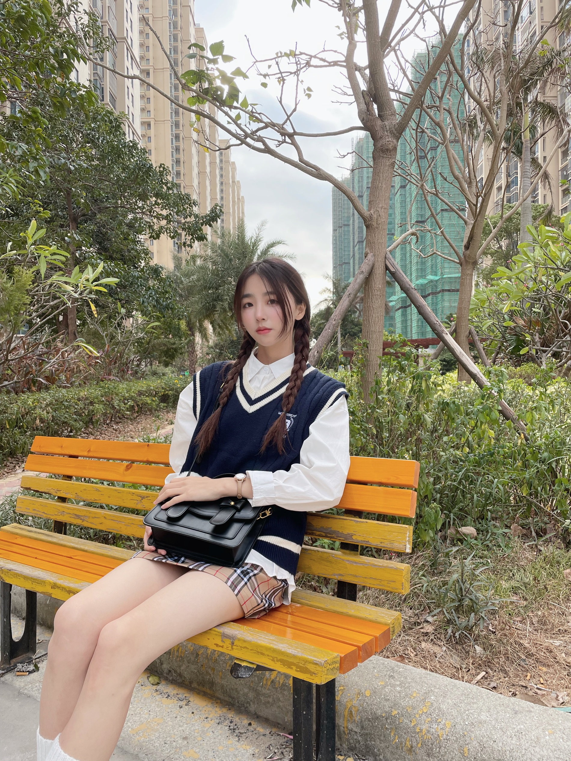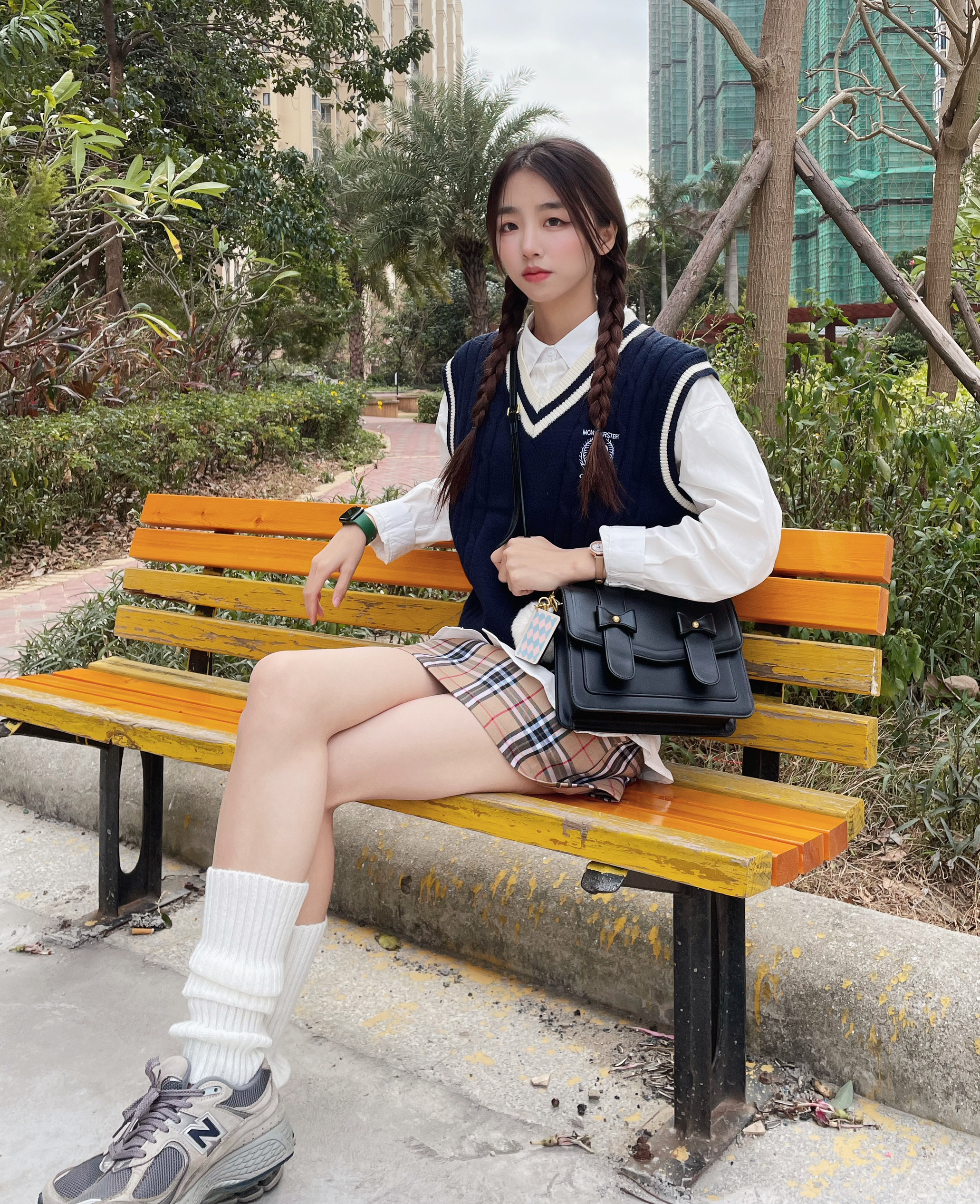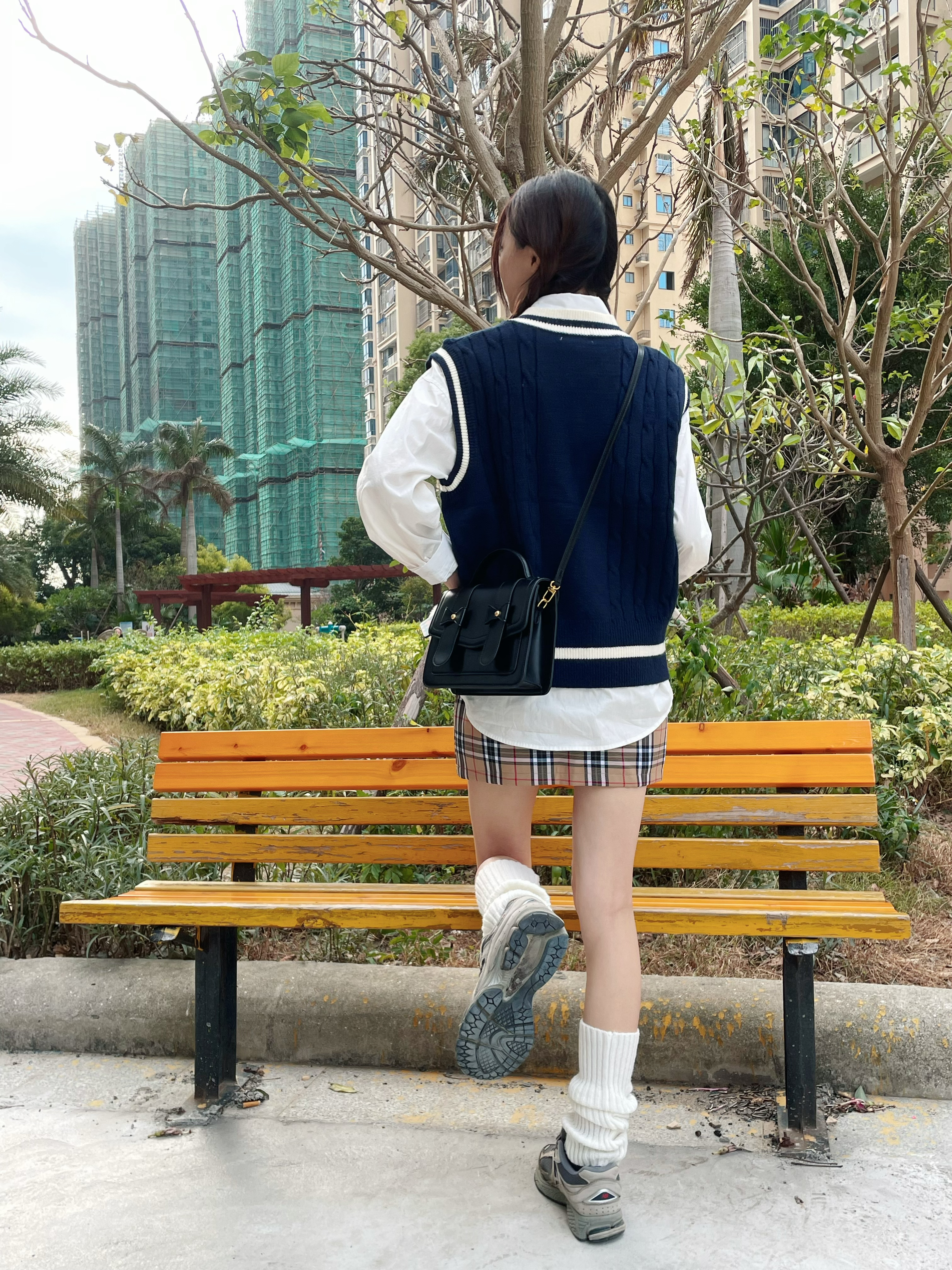 Halo!这里是小铭同学的穿搭分享频道📺 身高:168 体重:44 风格:日系/街头/潮流 今天走的是学院风啦 叠穿也太适合秋天了 白色衬衫搭配深蓝色毛衣马甲☑️ 选了一个和这套很搭的剑桥包 百搭又好看! 韩系小姐姐的穿搭俺拿捏住了⚾️ 搭配了一条卡其色格子拼接的短裙 NB的2002R这双真的百搭神器了🌟 这一套很适合日常在学校里穿~减龄穿搭!