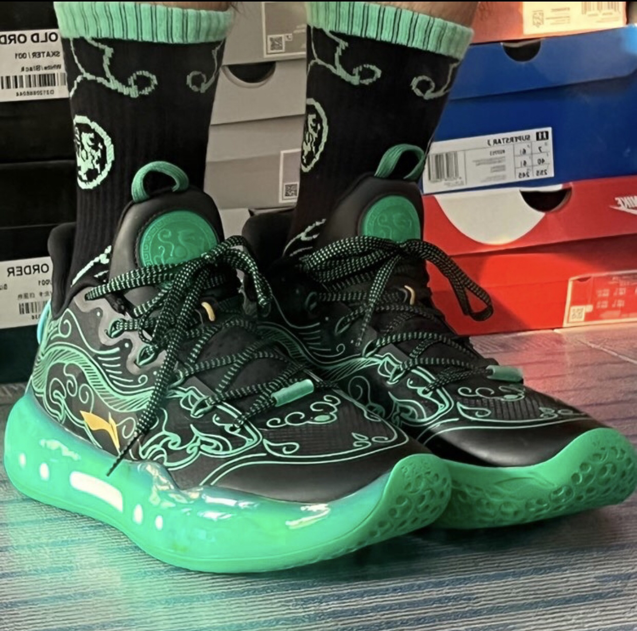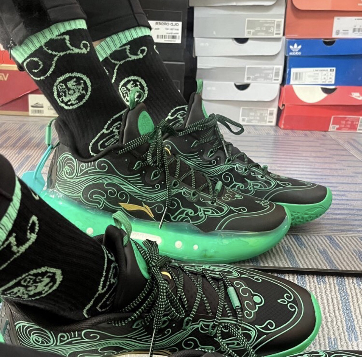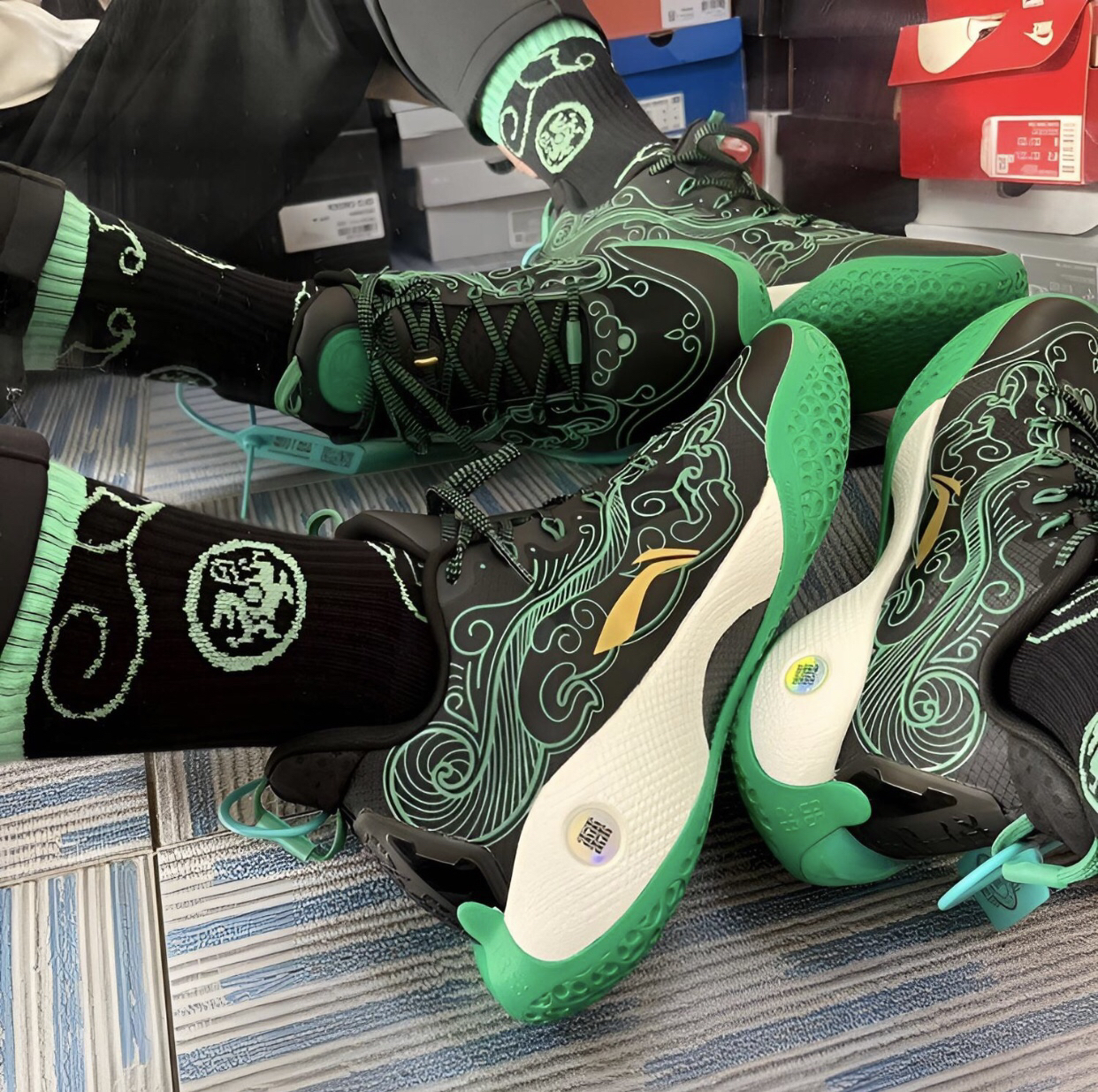 黑色鞋面印有荧光材质的绿色虎符印花,鞋舌的圆 形虎符也采用荧光材质。最美的当厲外侧的绿色流 痕韵染般的TPU,也是这双鞋最大的卖点之一。内 侧暴露的需材料可以直观感受到非常之软弹。外底 也采用绿色橡胶材质,可以适应任何场地且抓地强 悍。 相比一同推出的白虎符,这款黑虎符更耐脏实用, 可以适用更多场合。你会选择白虎符还是黑虎符?