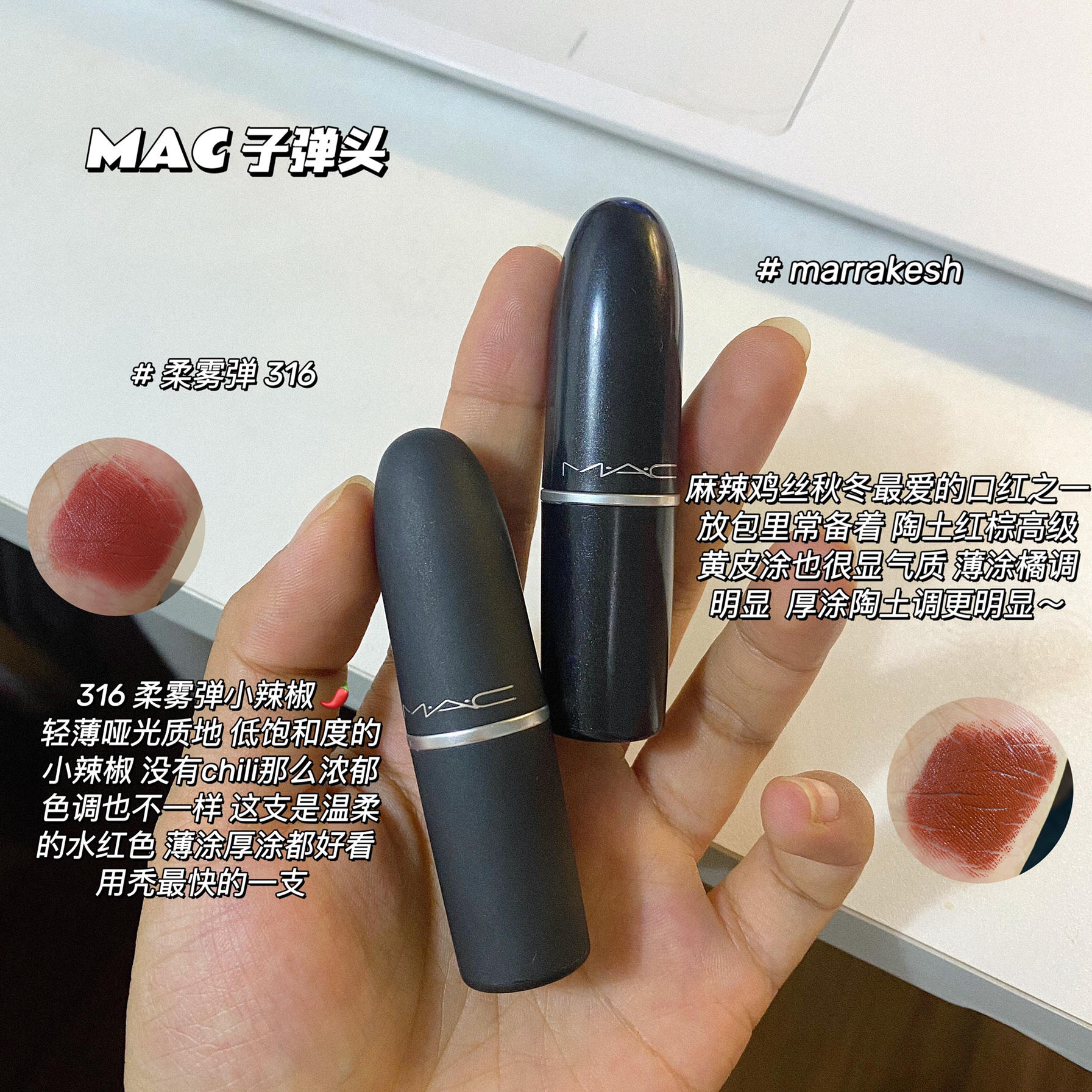 本篇笔记关联了MAC/魅可 尤雾弹丝缎柔雾子弹头口红 雾面显白哑光 3g 316柔雾小辣椒DEVOTED TO CHILI、花知晓 泰迪熊口红 显白复古 3.8g 可可熊、花知晓 泰迪熊口红 显白复古 3.8g 姜饼熊等商品,为用户提供真实的使用体验和购买参考。
