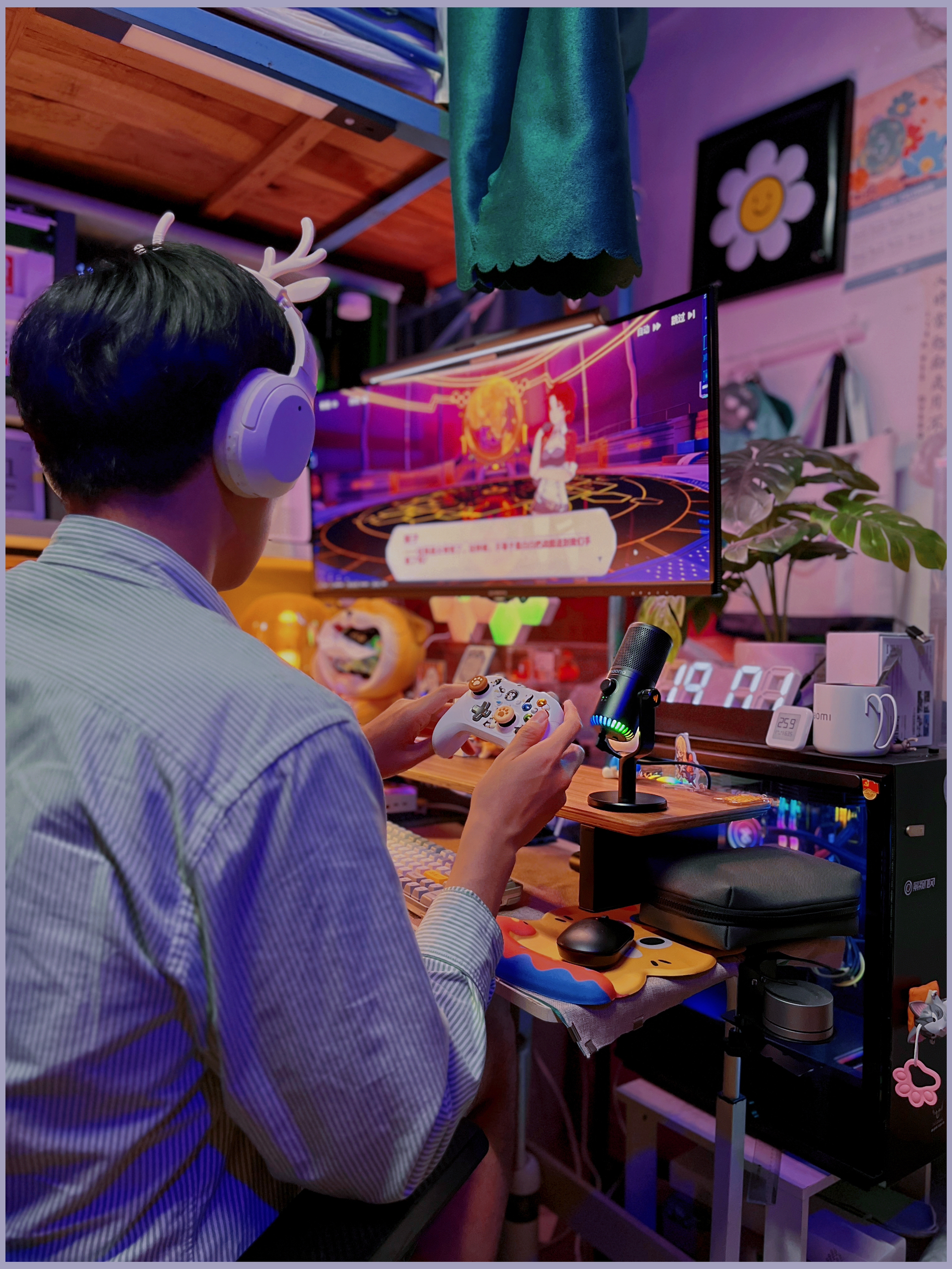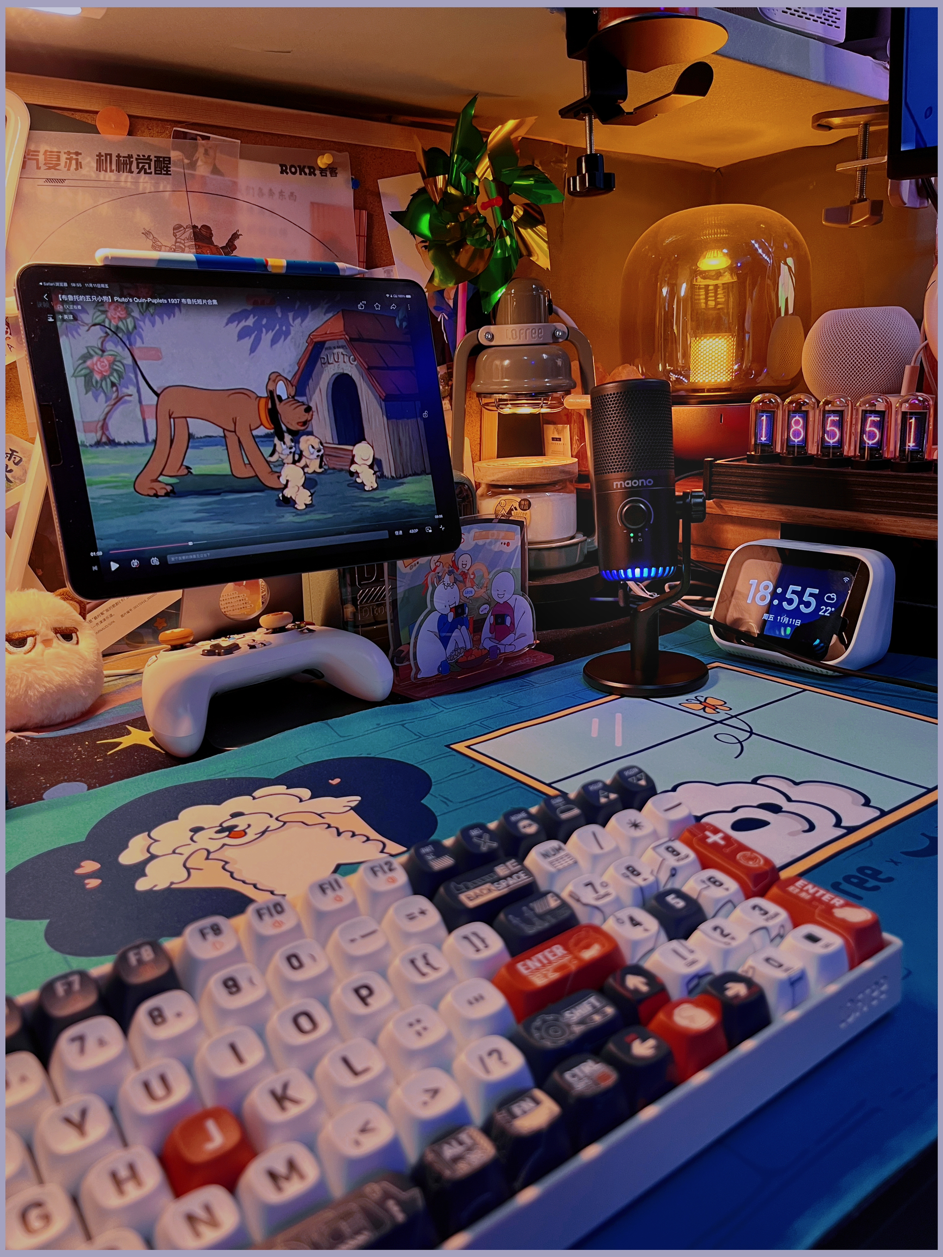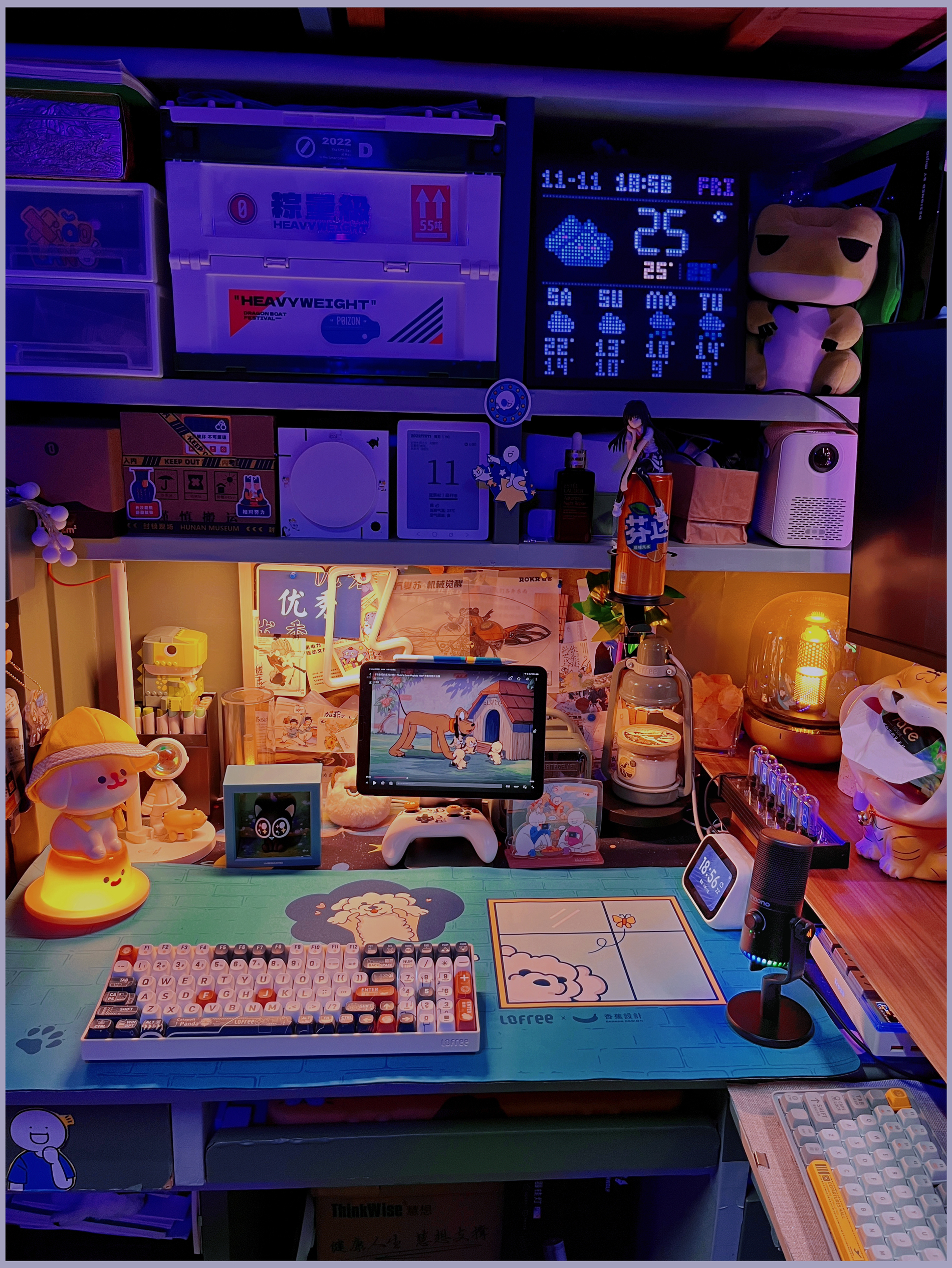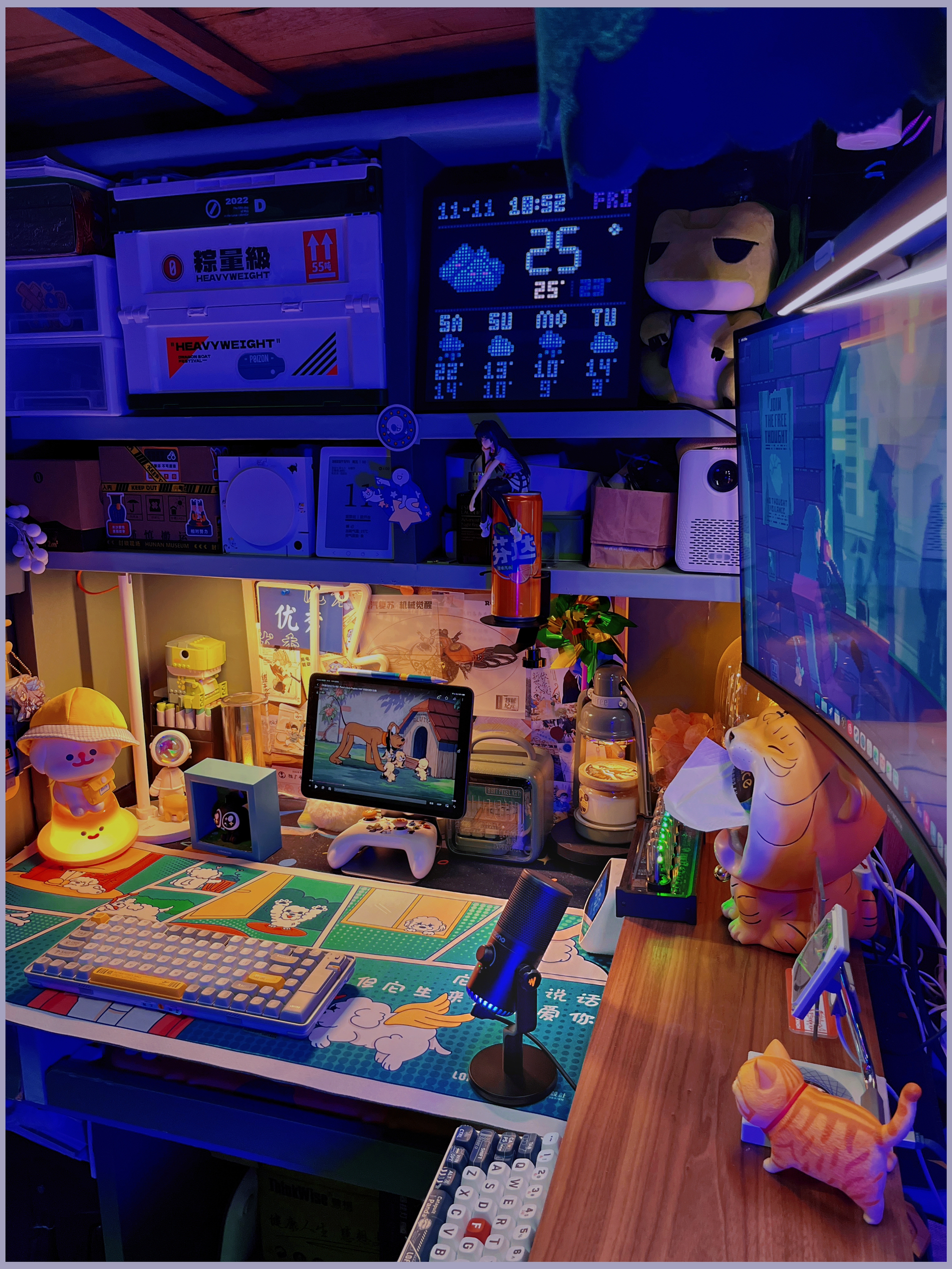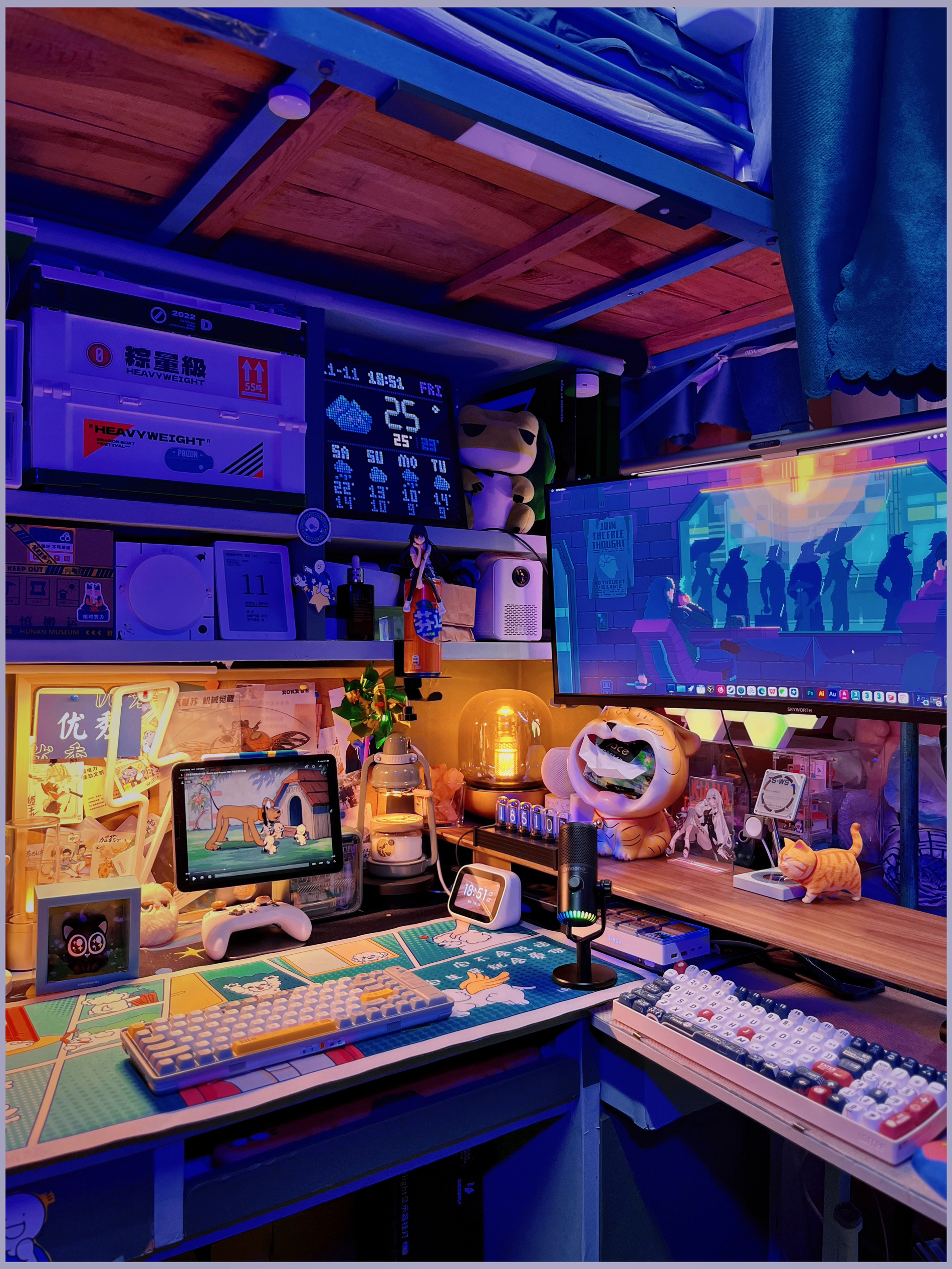 校园宿舍风电竞房桌搭|这样的宿舍你能待多久? 宿舍里该学的时候学,该放松的时候当然要愉快的游戏🎮 如果你是游戏爱好者,快来和我一起看看今天的宿舍桌面改造分享吧! . ◾电竞桌面布置少不了好用的外设和鼠标垫! 打游戏当然手柄、键盘都会用得到,本次的键盘和鼠标垫都是洛斐的,永远爱你的小狗鼠标垫是新的键帽系列出了配套的,漫画风的鼠标垫能直接铺满我的桌面~直接就有了氛围感,双面的设计想用哪一面都可以!另外...
