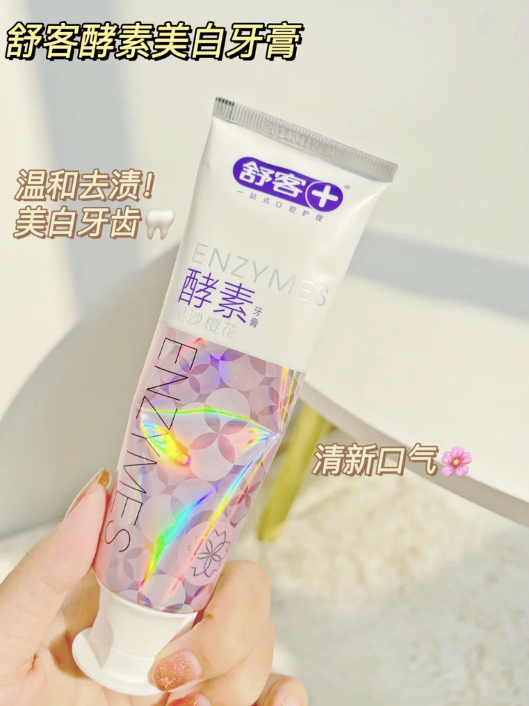 天惹!这么美腻的舒客樱花牙膏 简直是颜控+黄牙星人的福音! +粉色金闪的膏体~blingbling的~ 大抵神仙颜值莫过于此了吧! 是樱花 口味的 刷完牙,嘴巴里都是清新香甜的!! 他们家还有青柠味和椰子味~ 等这支用完了我再试试另外两个口味 除了好看 这还是一款敲有用的酵素美白牙膏 里面添加了法国绿科木瓜提取蛋白酶酵素 去牙渍!而且还能减少牙菌斑 我经常喝奶茶的牙齿都刷得亮亮的! 一口大白牙...