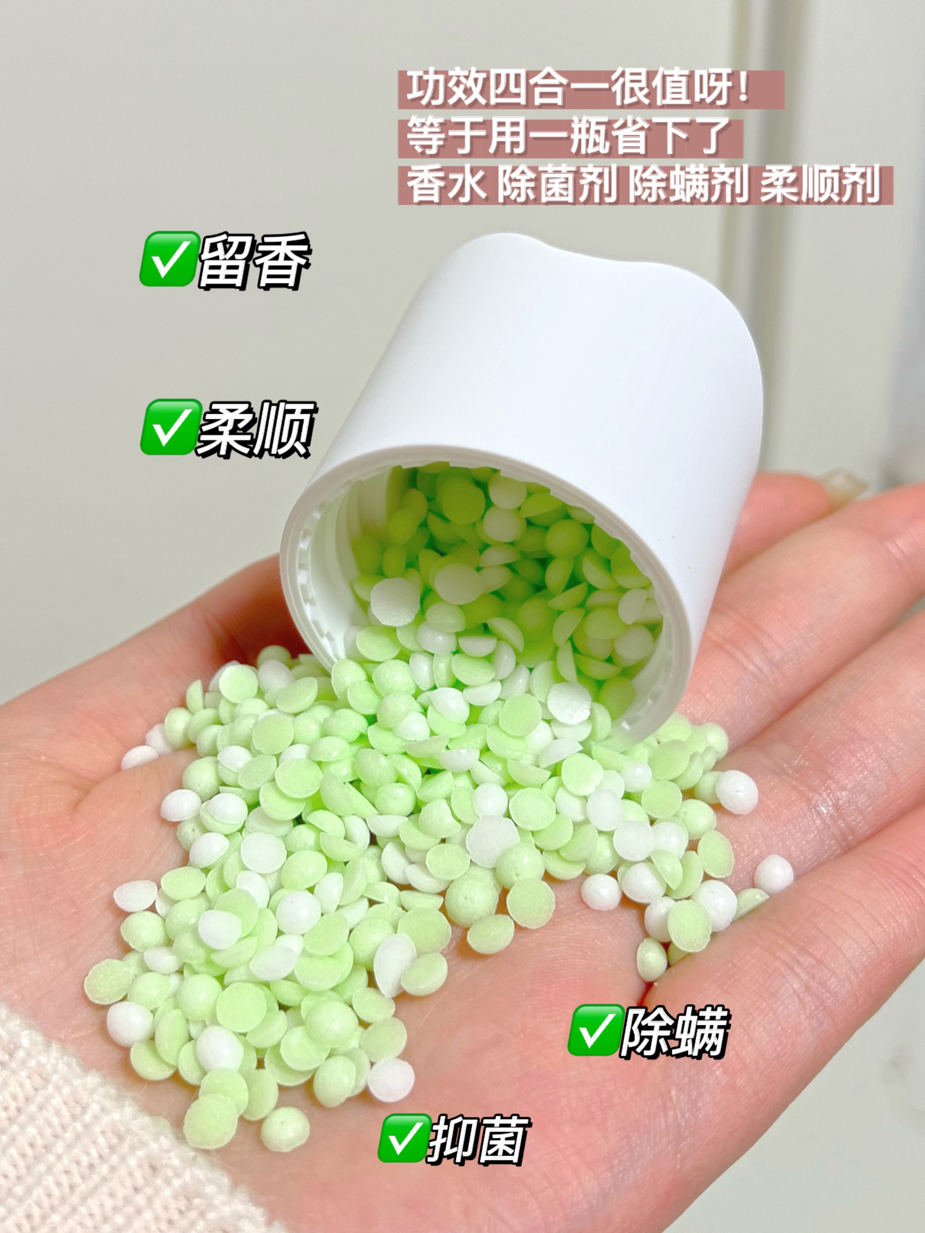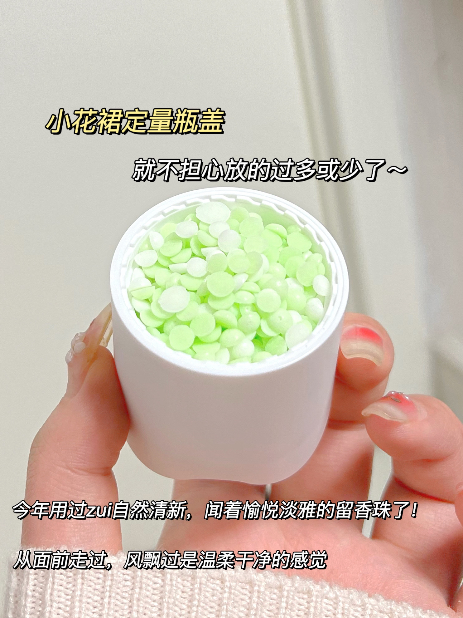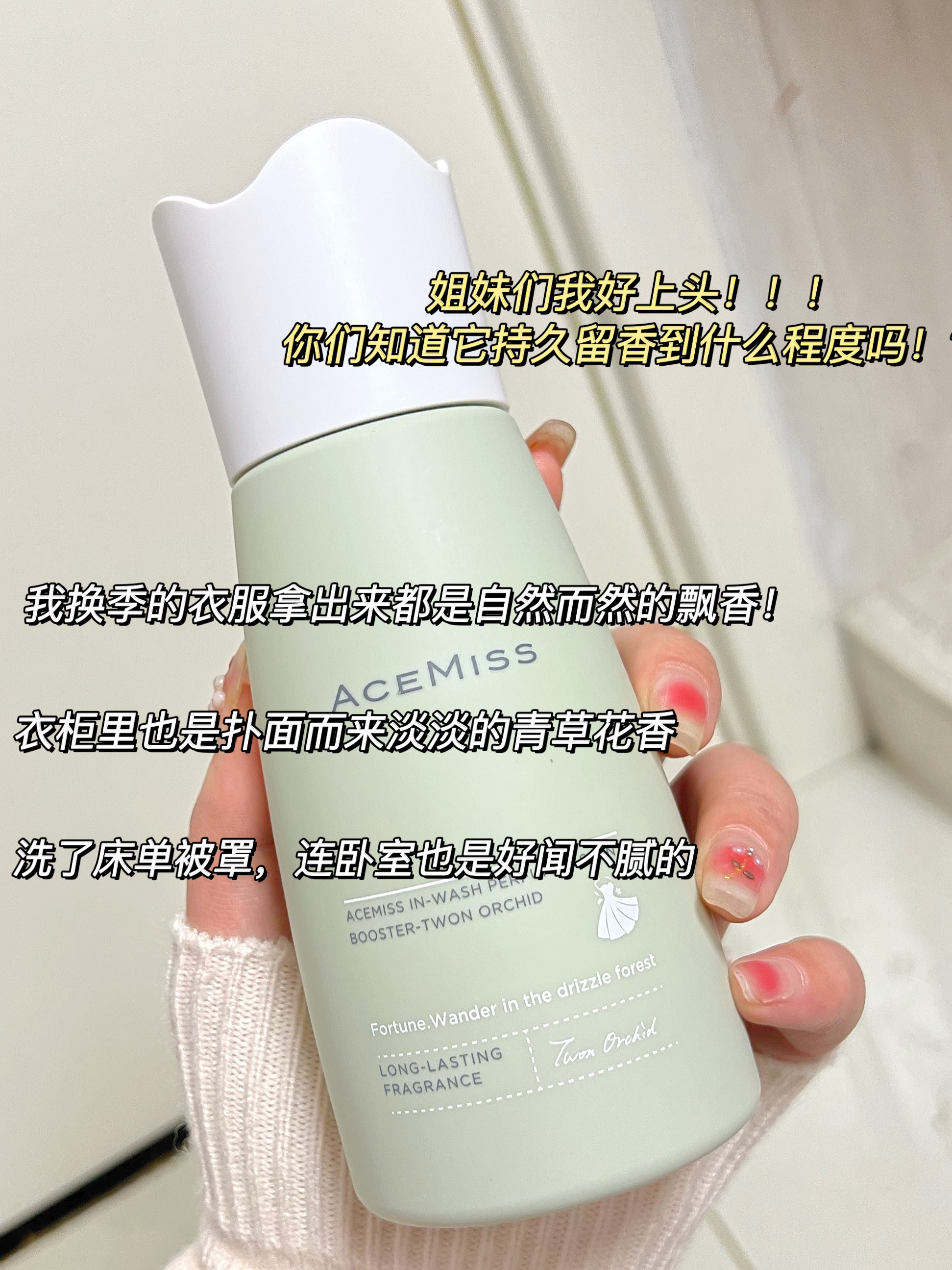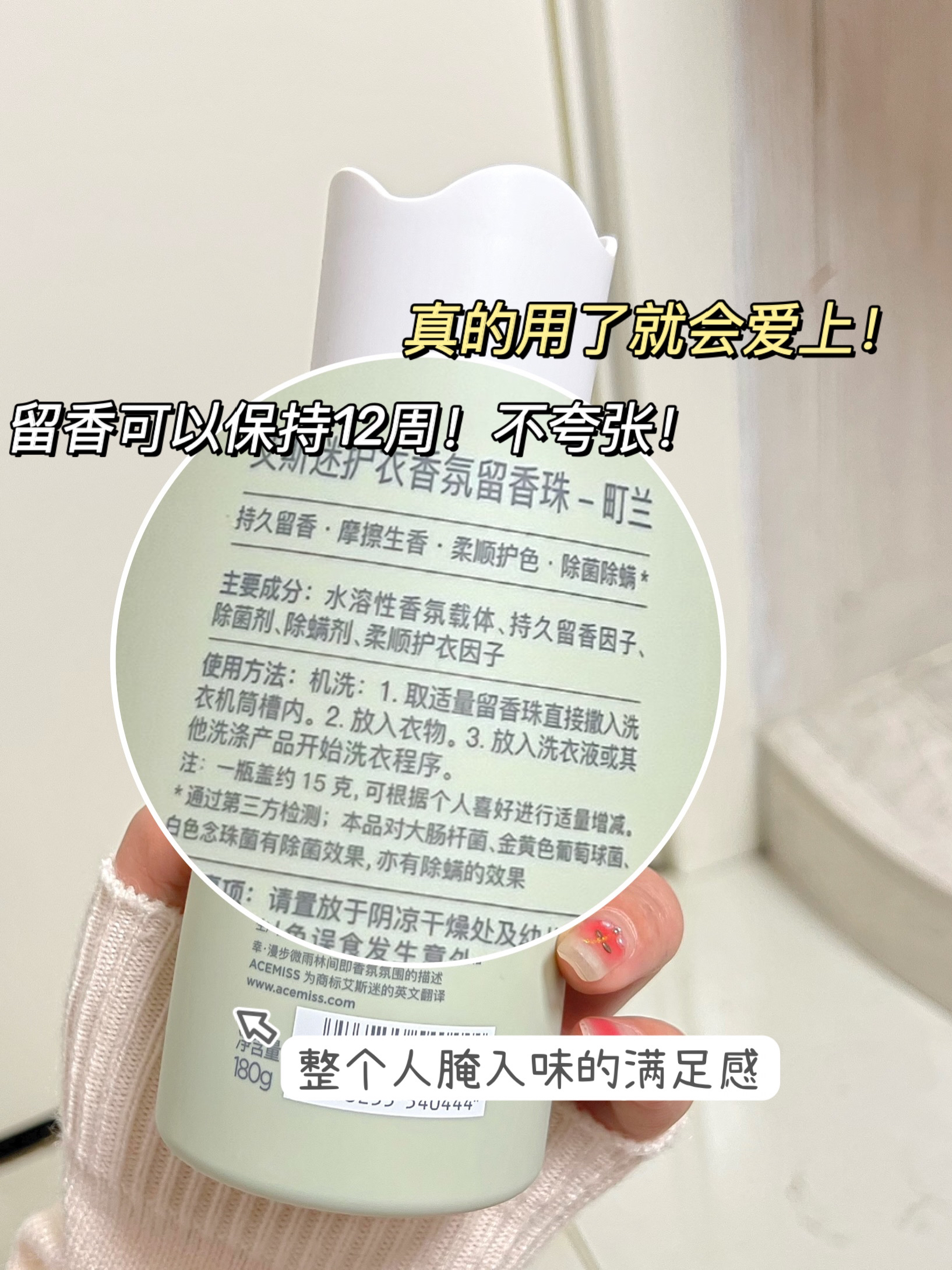 用过后才知道!留香珠比香水实用多了! 所有衣服都变成了这个味道 好闻不甜腻,是清新的花草果香调 香味自然到新认识的朋友刚开始都以为我体香~ 是那种一个女孩子从我面前走过,留下一阵舒服的余香的感觉~ 用Acemiss 留香珠洗过的衣服 衣服在柜子里存了一两个季节,经过换季都还是香香的~ 有种淡淡的舒服的香气,不刺鼻不浓烈 洗被套床单的时候加一盖留香珠,卧室都是谁闻谁夸! - 平时的留香珠也就只能留香...
