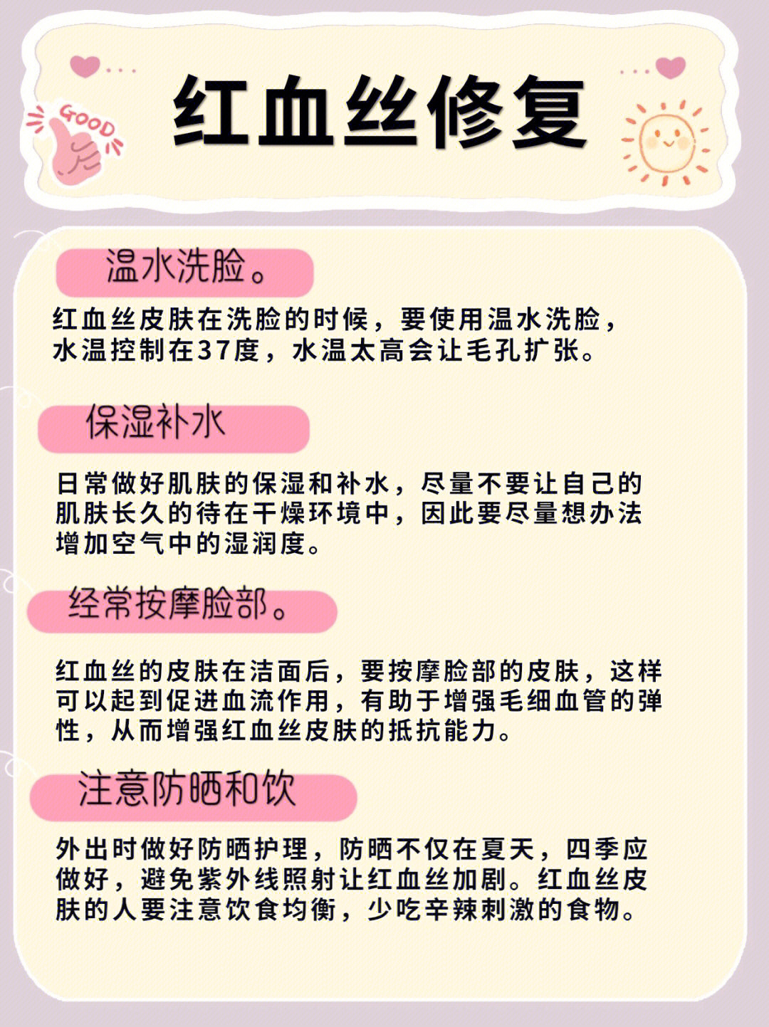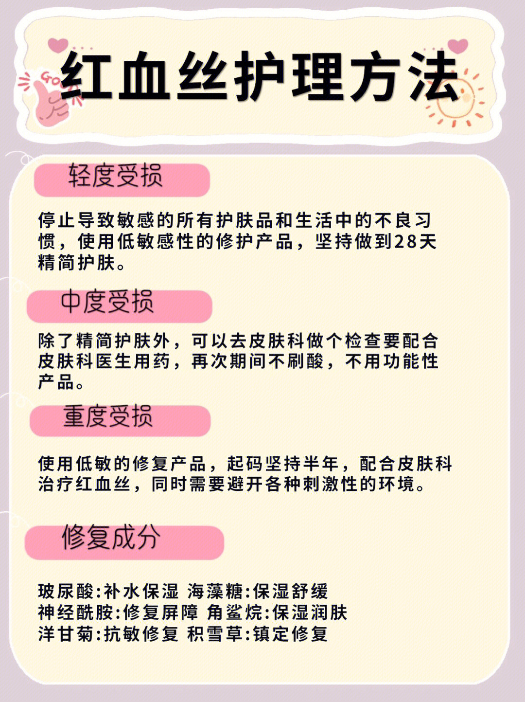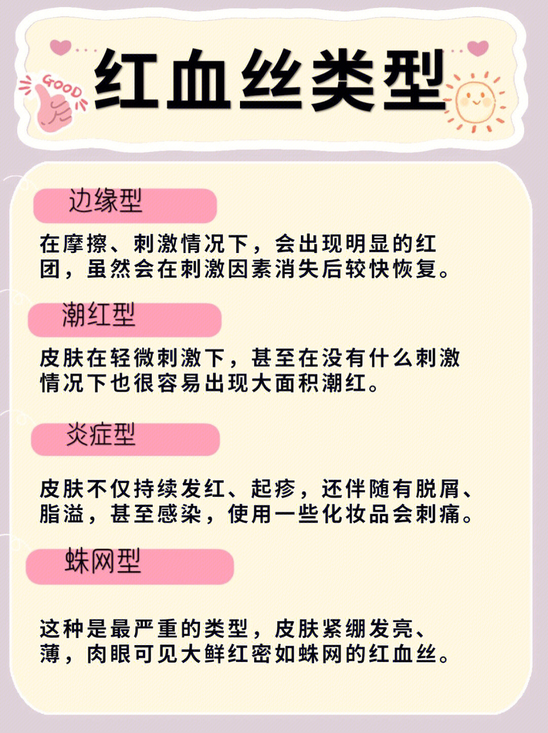 看来大家都有和我一样的烦恼。很多宝宝都问我,红血丝到底怎么去修复❓❓❓有不同程度不同症状的红血丝不管哪一种的红血丝都是属于敏感肌❗❗ 我一直提倡的是精简护肤,并且一定要改掉我们日常中不好的生活习惯,帮大家整理了。不同普通程度红血丝的症状,大家可以参考一下 红血丝的类型 边缘型 在摩擦、刺激情况下,会出现明显的红团,虽然会在刺激因素消失后较快恢复。 潮红型 皮肤在轻微刺激下,甚至在没有什么刺激情况下...
