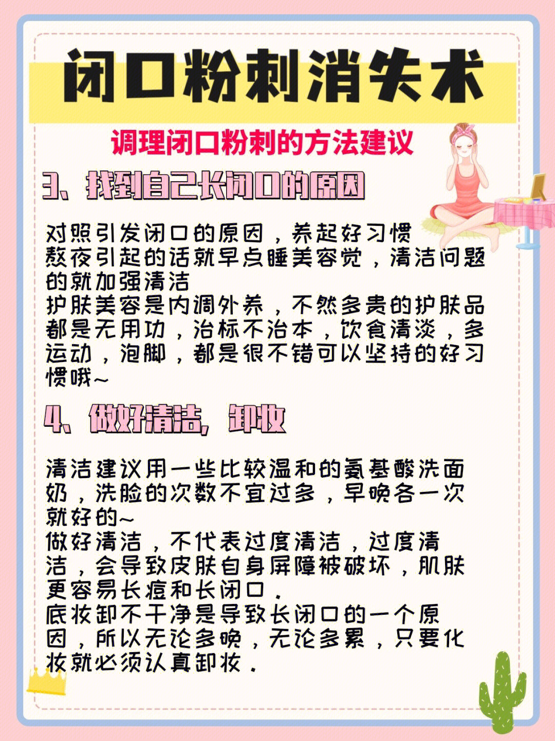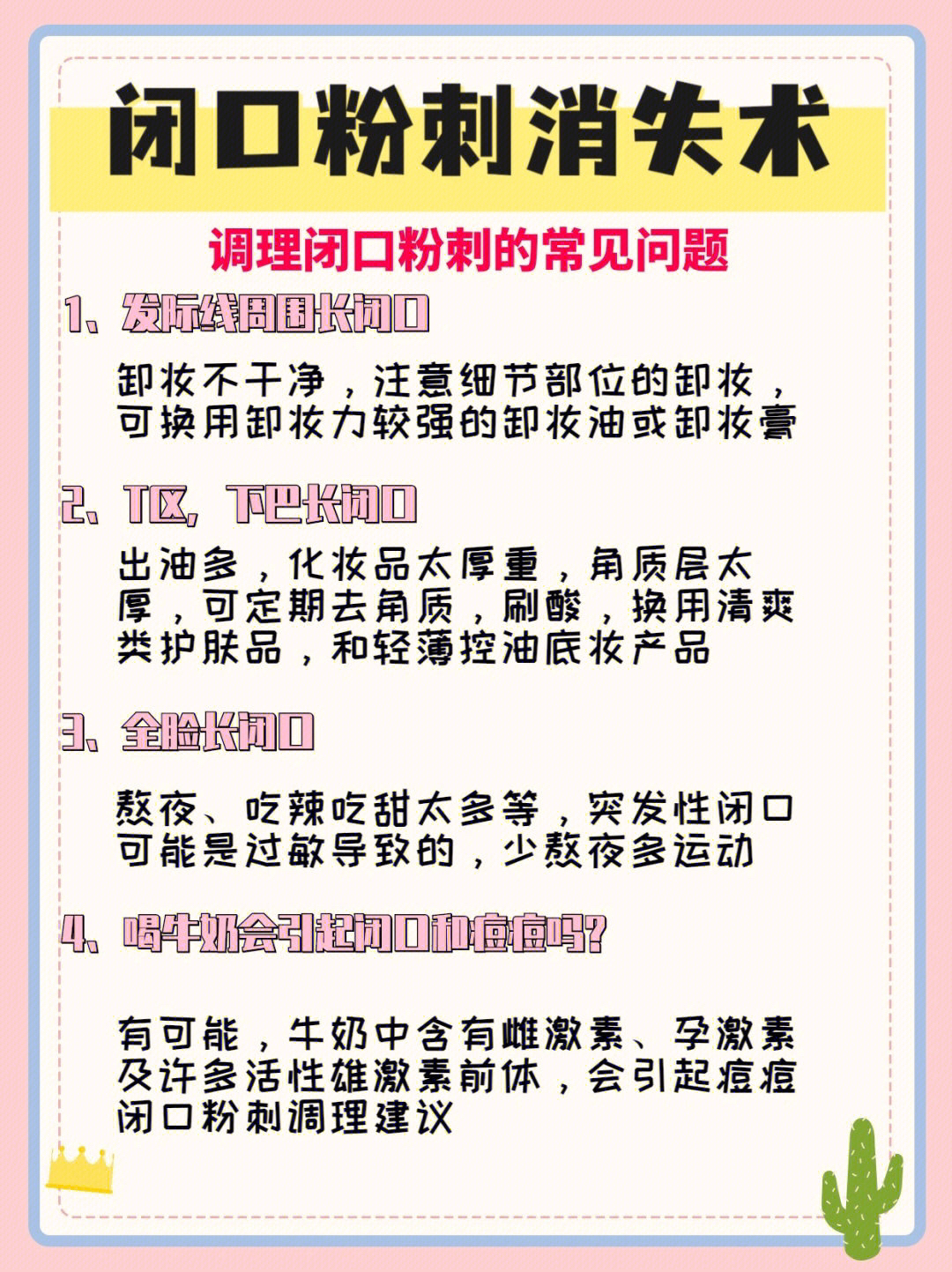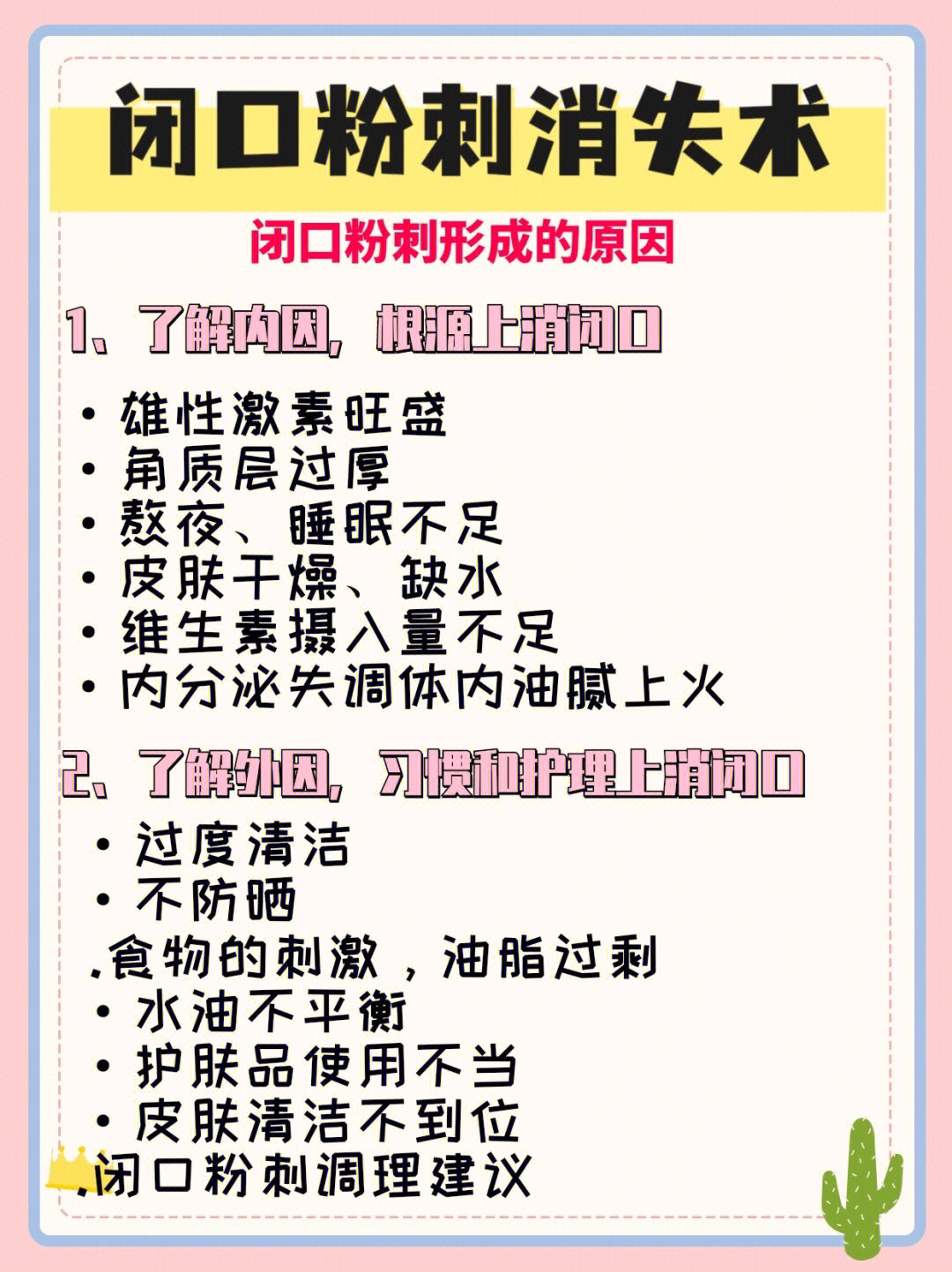 从根源上正确调理闭口粉刺 闭回形成的原因 闭口又叫粉刺,是痘痘的一种,也可以看做是痘痘的前身,是因为毛孔堵塞,油脂分泌过多,痤疮丙酸杆菌增生引发炎症。 闭口粉刺不痛不痒,却影响颜值,常见于额头和下巴,远看很正常,近看有一个个白色的小突起 错误去闭回方法 忍不住想去把它挤掉,容易 发炎越演越烈,不可收拾 着重护肤护理,不注重内调, 治标不治本 调理闭口粉刺的常见问题 发际线周围长闭口 卸妆不干净,注...