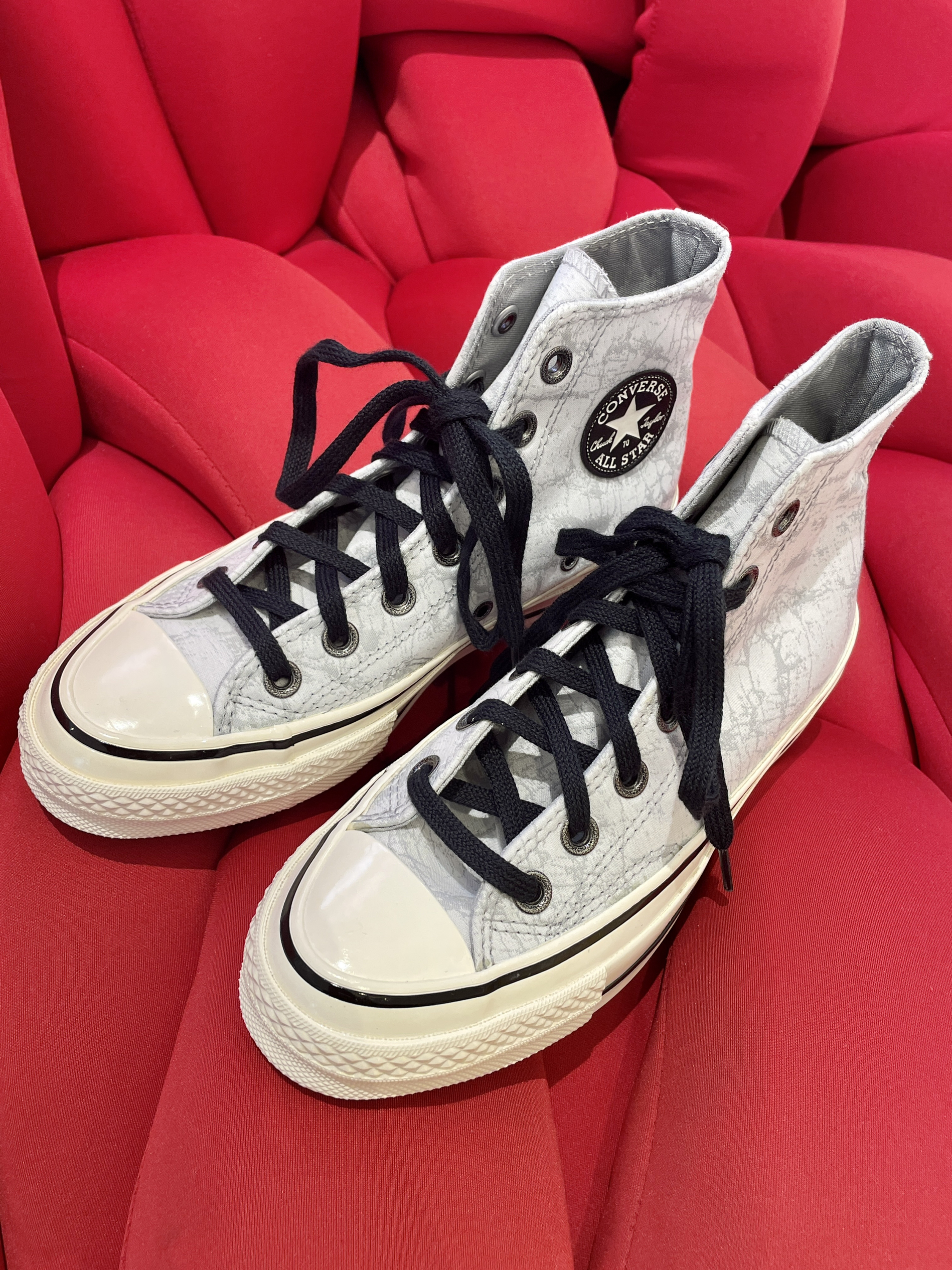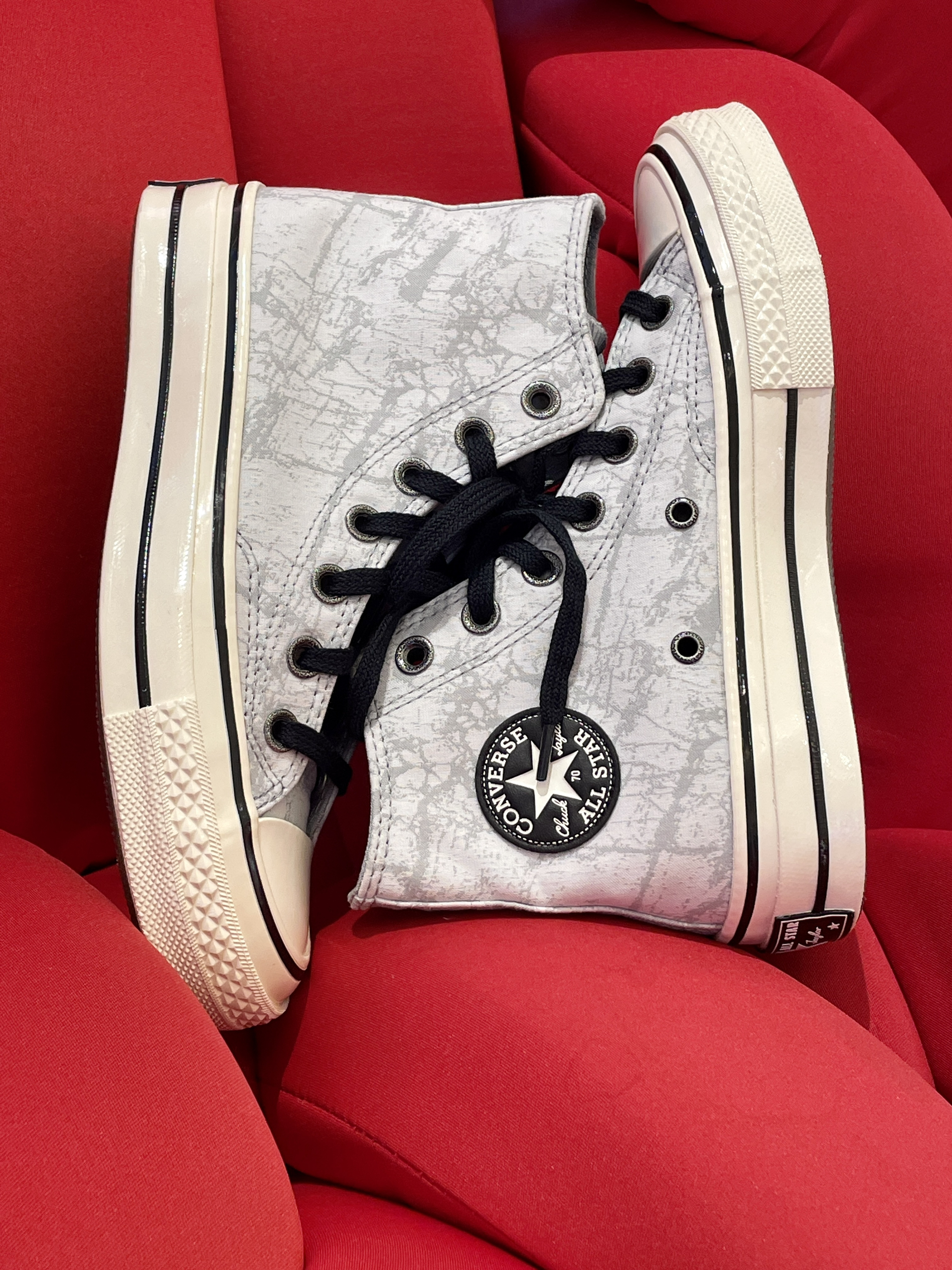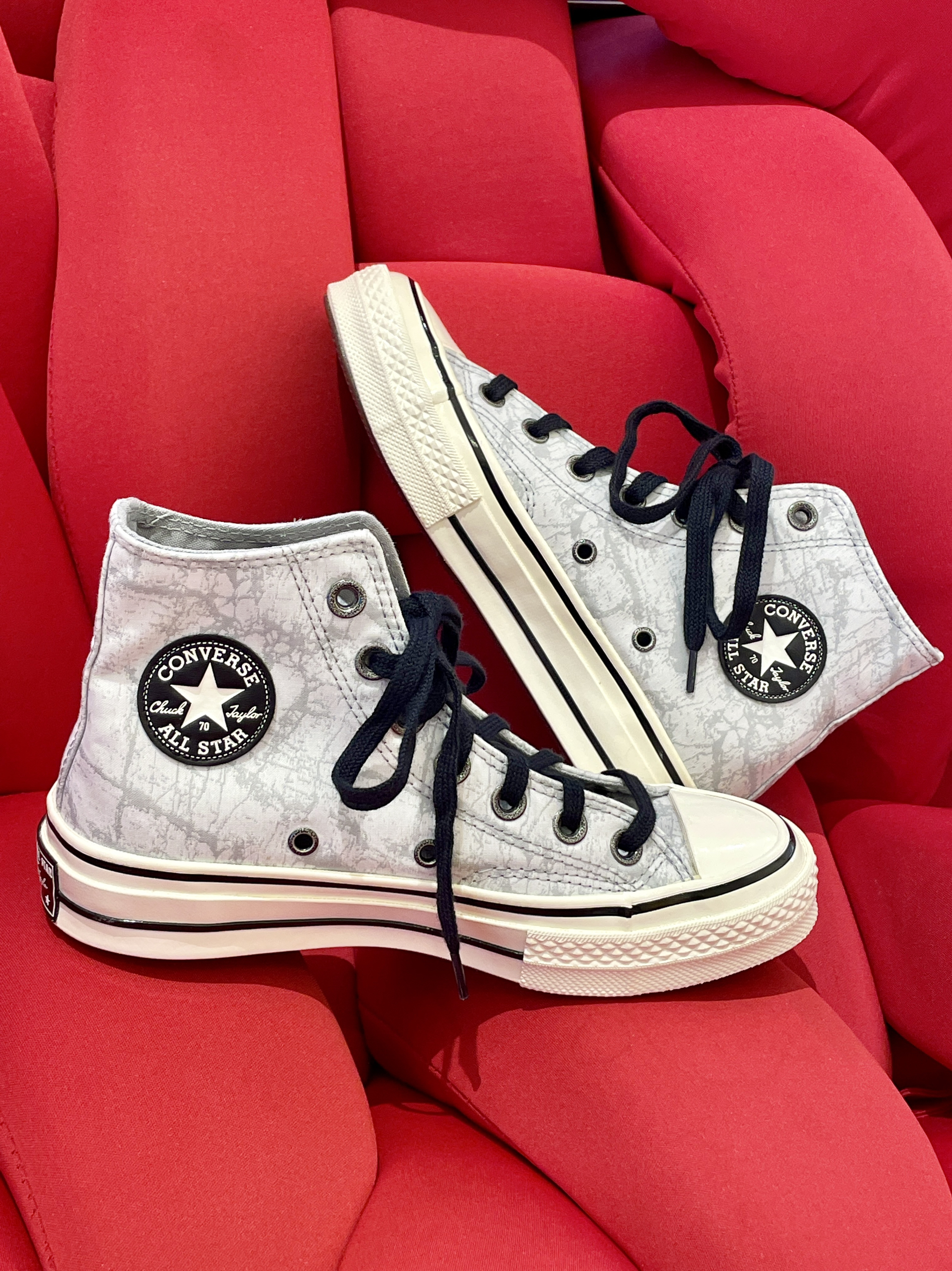 🌟: Converse 1970S 高帮帆布鞋 大理石白配色 🌟:鞋面采用再生聚酯纤维,白大理石纹理提花面料,具有独特的纹理和细腻的质感! 🌟:石材饰面铝制眼扣,提升格调,打造整体和谐的统一外观! 🌟:橡胶大底的材料中融入10%以上的环保♻️再生橡胶!舒适柔软,又潮又酷! 🌟:欧索莱鞋垫:抑菌除湿、缓震回弹! 🌟:尺码偏大,建议小半码!