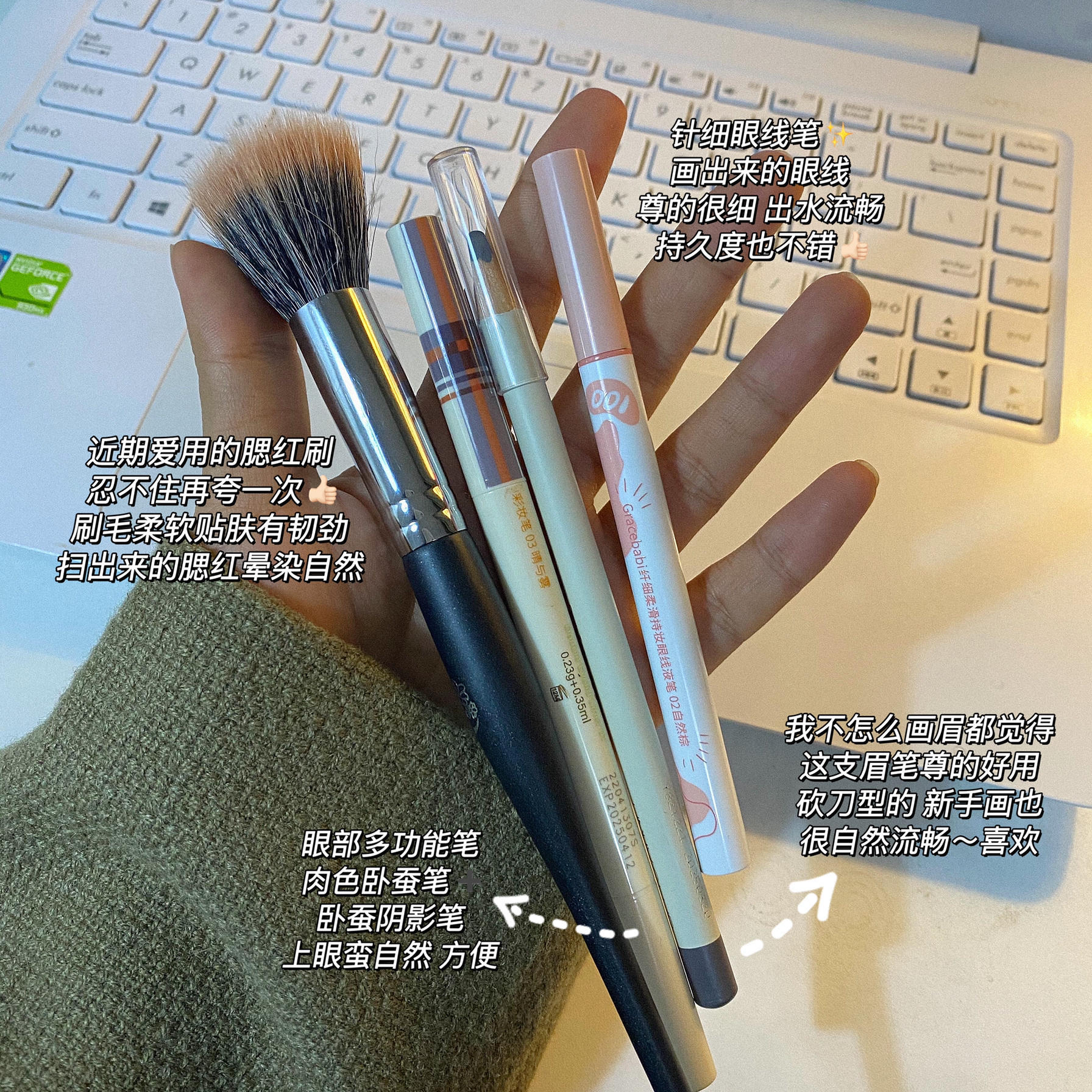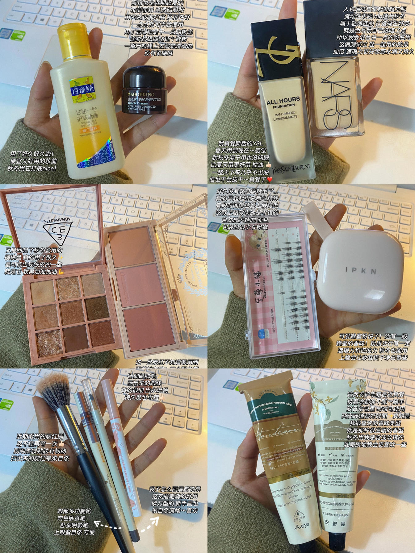 阿巴阿巴!终于又到了 愉快的星期五啦!🎉 明天就可以好好睡懒觉了 每周一个本周爱用物总结怎么样😬 - 1.百雀羚护肤啫喱/ 毛戈平黑霜 2.YSL粉底液/NARS超方瓶 3.3ce橘棕盘/immeme 下午茶腮红 4.假睫毛/ipkn粉饼 5.艾诺琪点彩刷/酵色多用笔/unny眉笔/gracebabi眼线笔 6.安野屋护手霜 浅玫瑰与姜糖/满园茶桂