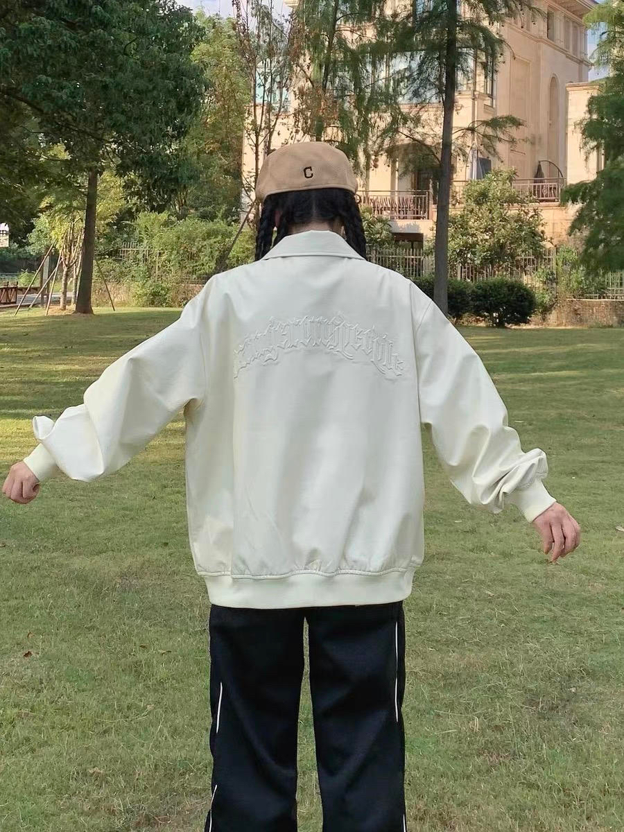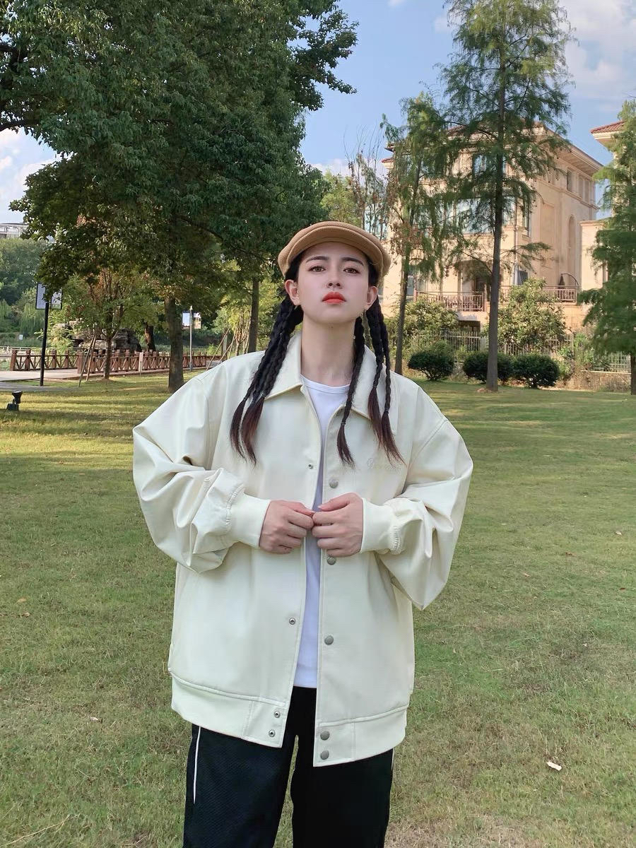 ☘️帅气的一件外套,百搭气质,宽松版型遮肉效果棒棒的。我身高160体重90 穿着十分ok。 🍃胸前的logo刺绣做工精细,整体是宽松的~很百搭,皮夹克很好打理,米白色会显得整个人都很干净。