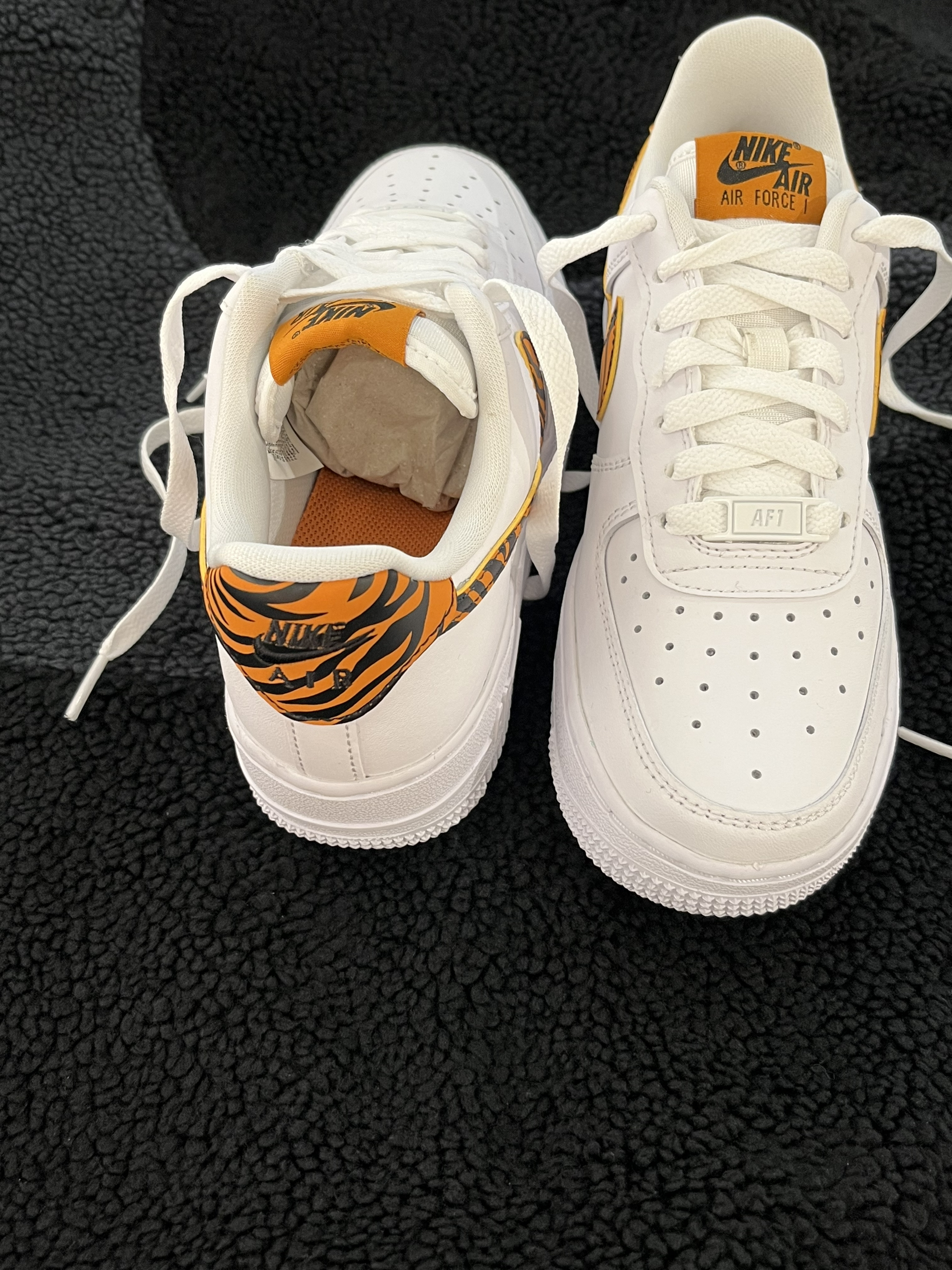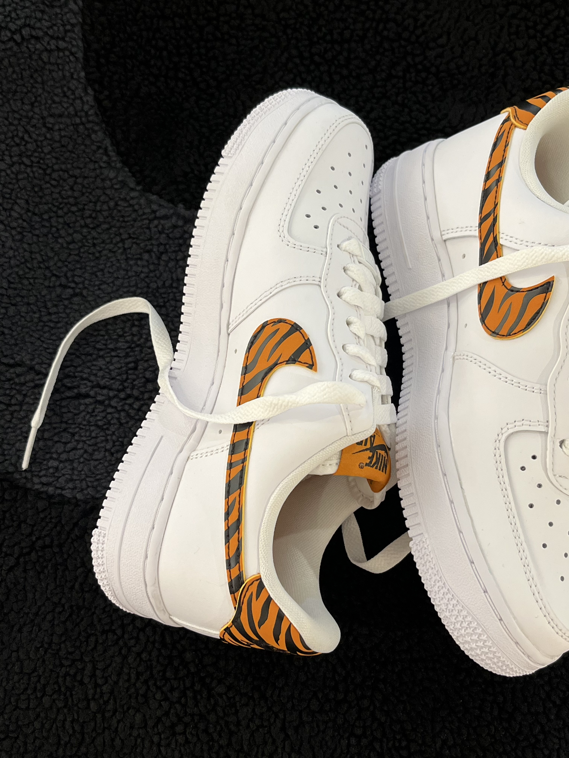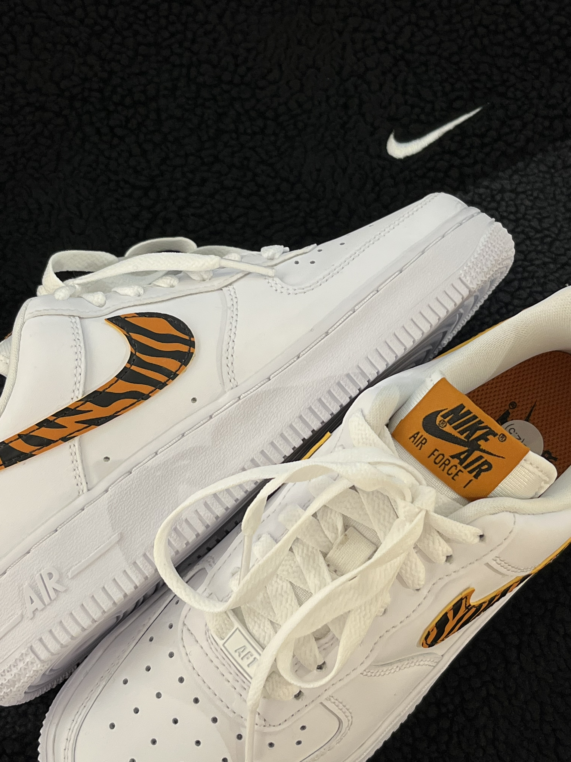 🤩今天推荐一双新款时尚好鞋———虎纹空军小白鞋,无论是日常通勤还是上学、逛街,女生日常OOTD选它错不了!!! 👟Nike Air Force 1‘07 白黄黑 虎纹 空军一号 低帮板鞋 🐯侧边钩子和后跟采用了黑橙虎纹设计,动物纹理氛围感十足,鞋舌和鞋垫同样橙色调首尾呼应。 ✔️整体经典空军小白鞋,牛剖层革/合成革材质的鞋面,鞋头透气孔和白色的鞋带扣,厚实中底带有三厘米左右的增高效果。