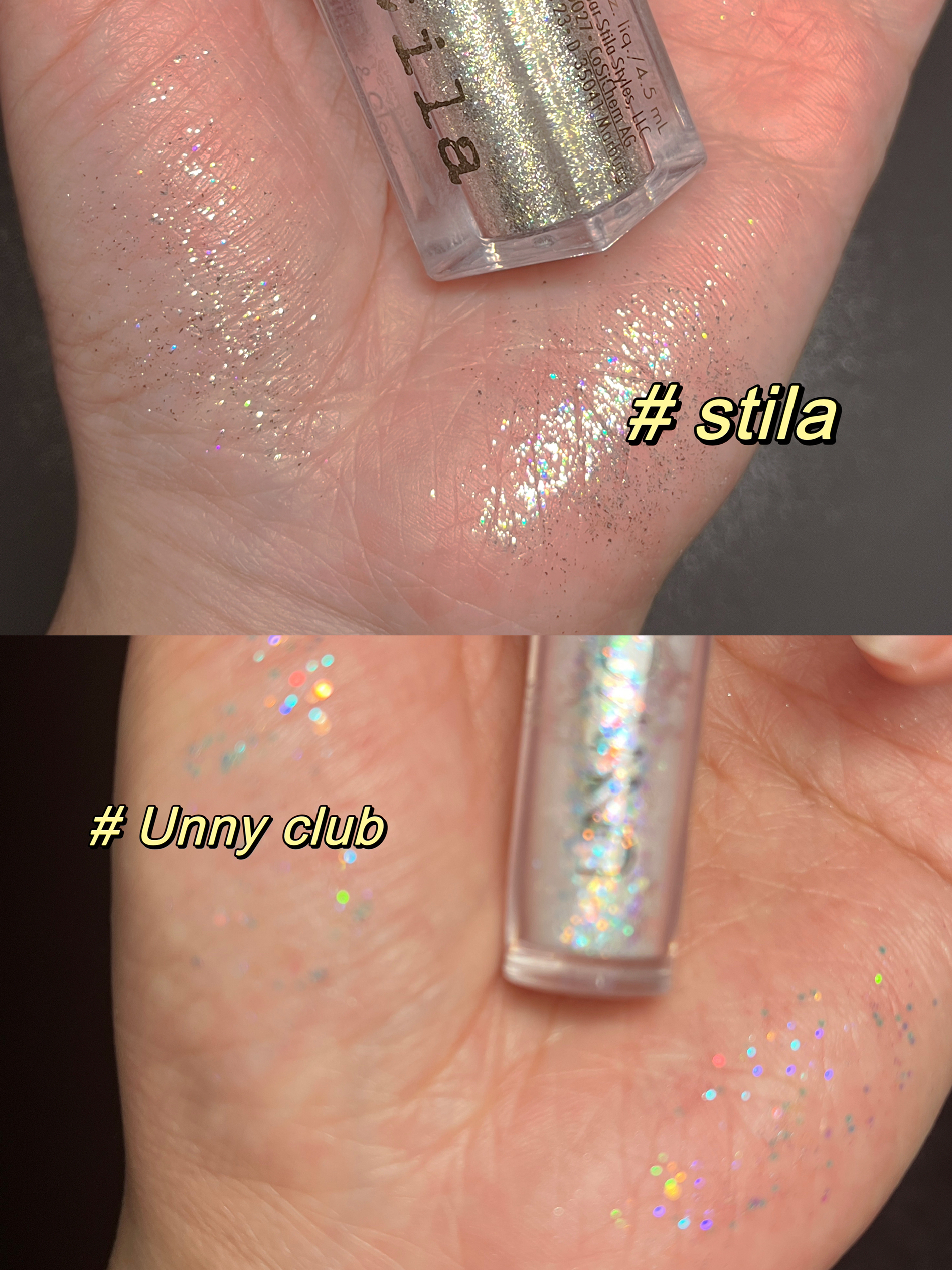 今天没什么事 就想给大家安利两款液体眼影 stila:diamond dust 碎钻冰晶灰 这款跟他的名字一样,像钻石一样闪耀,让人拒绝不了 Unny club:01 炫彩迷光 Unny号称一滴泪的平替果然名不虚传,点在卧蚕和眼影高光部分,眨眼小心机get!! 这两只都是上眼巨亮的那种,不飞粉不掉渣 stila会更闪一些,更有水光感,点在眼睛和鼻头头没问题。Unny适合给眼妆锦上添花,不过2...