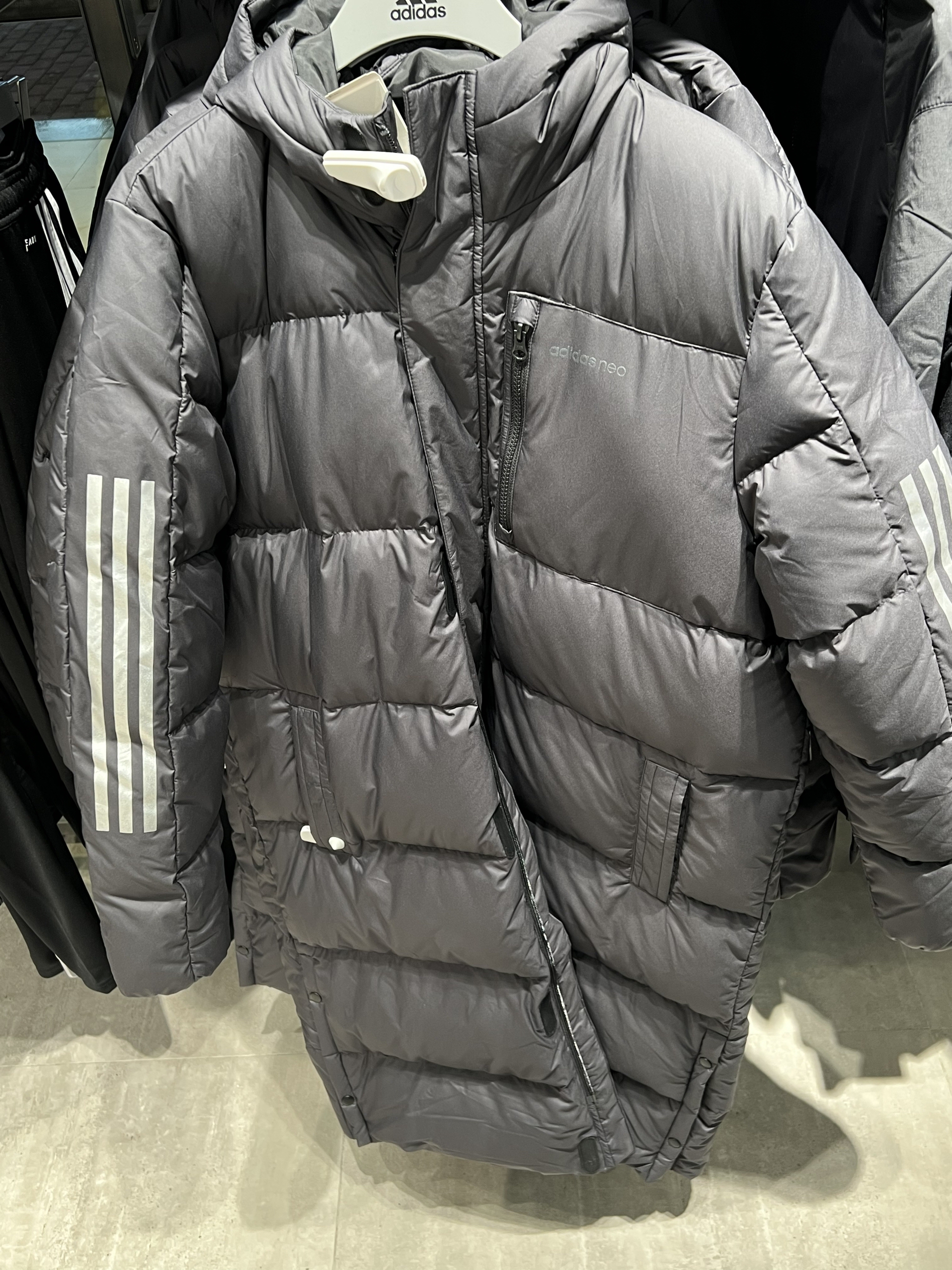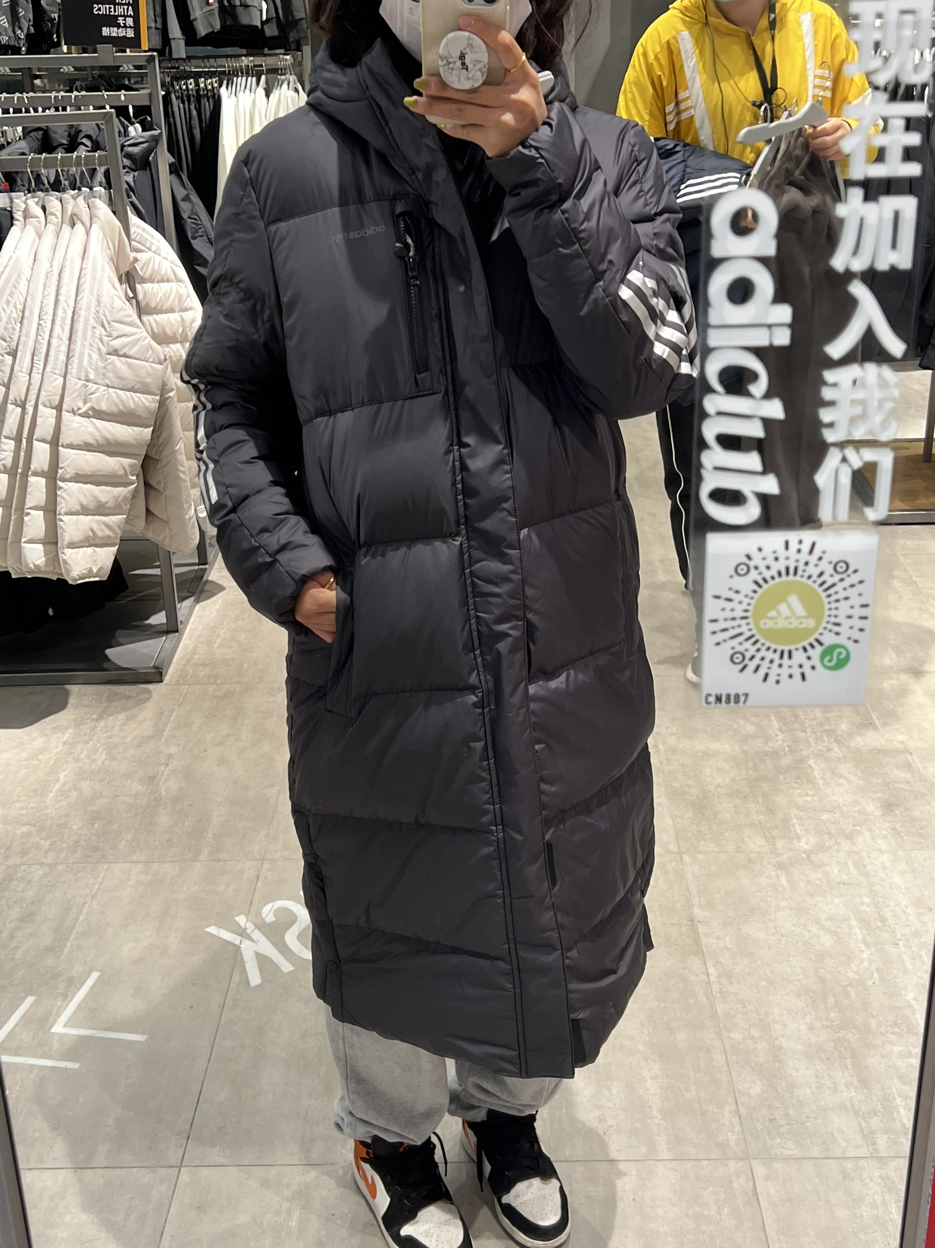 🍑:hi 今日是保暖小王 这个阿迪的长款羽绒服是真的长到脚了 虽然我是南方人 不得不说 这个真的超适合北方 很保暖 设计的也很休闲 男生女生都可冲!