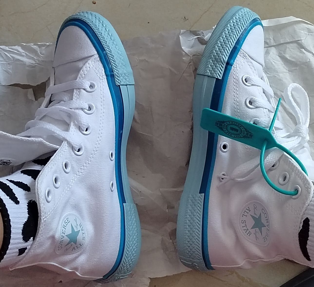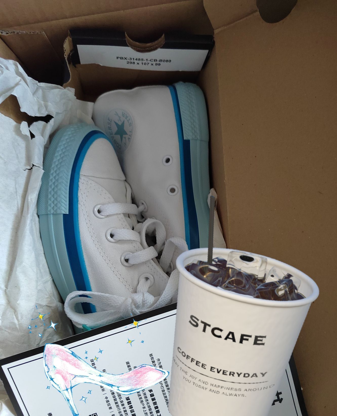 👟球鞋名称:匡威 🔍设计亮点:蓝色侧边 法力无边!!!简直夏日重现 上脚感受:超级软 穿长一点的袜子后面不容易磨脚哦 📃总结评价:非常推荐 唯一的缺点是太白啦 不过太美了 像夏日冰淇淋:)