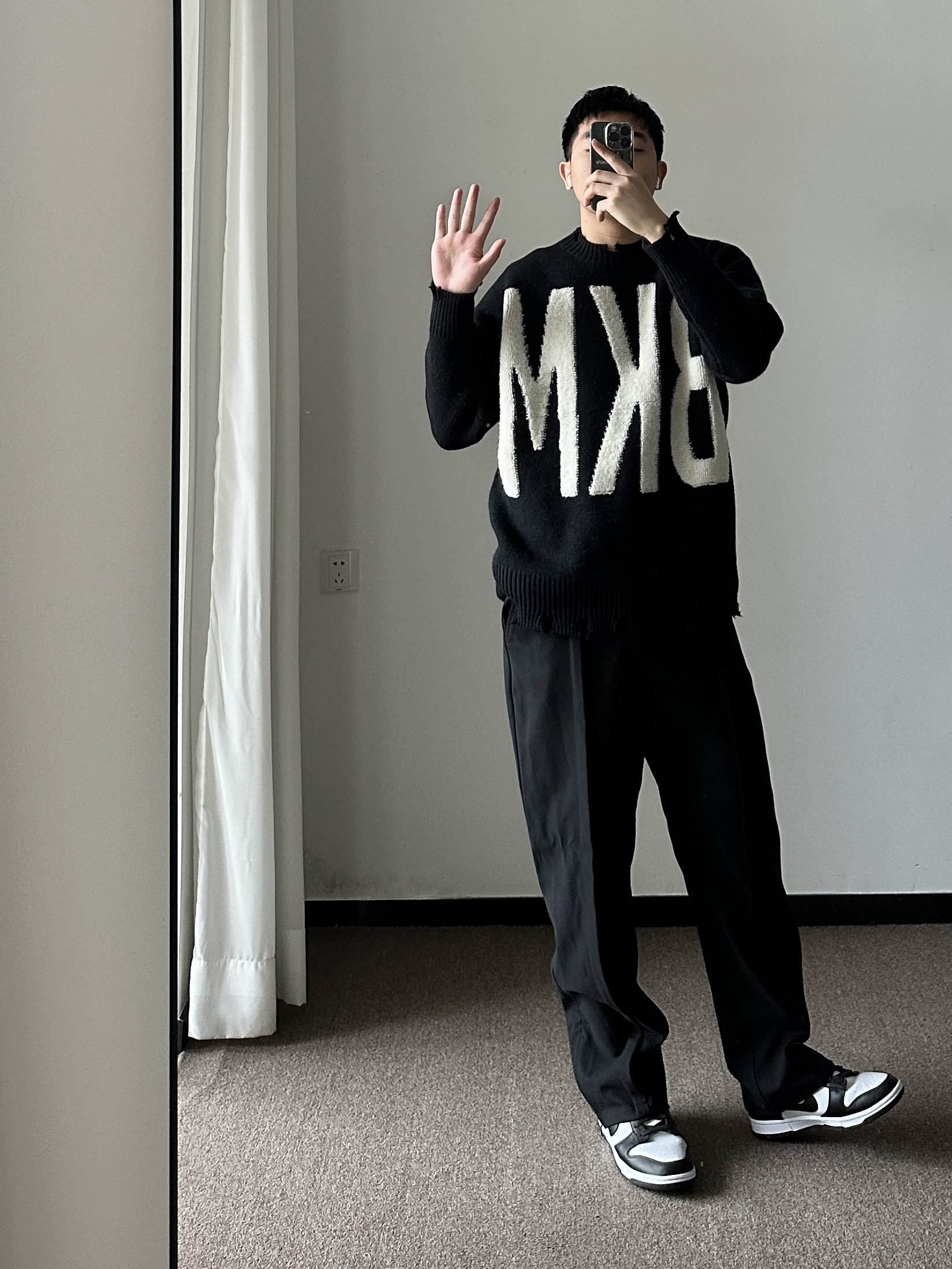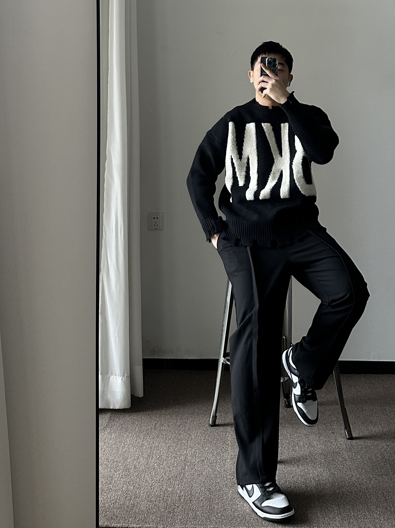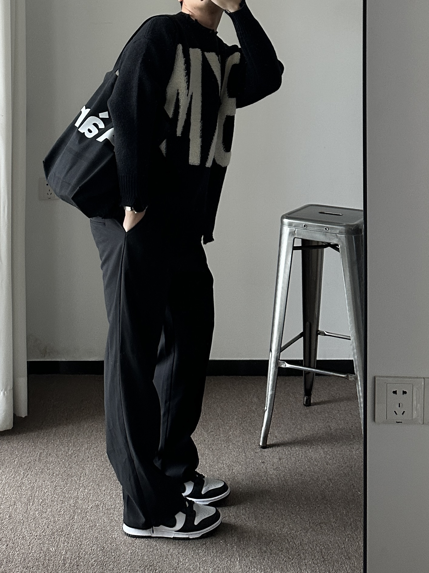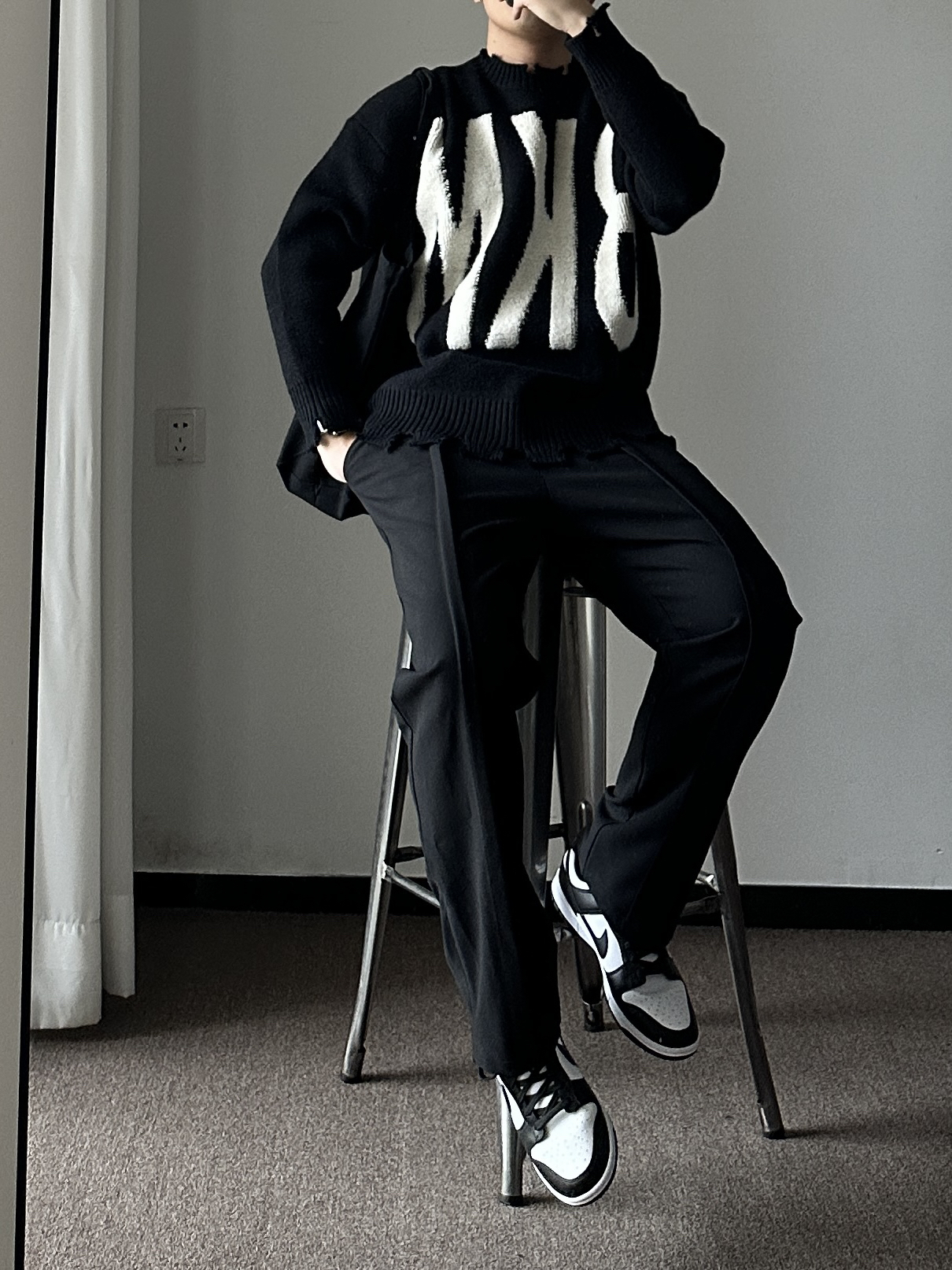 素人也能好看系列~ 174cm/65kg 🧥-破败风的印花毛衣,男女通吃,走简约的风格,适众性更好也更日常。 👖-立体剪裁西裤,中性简约风~ 👟-黑白映衬就🉑~ 🏺-大地