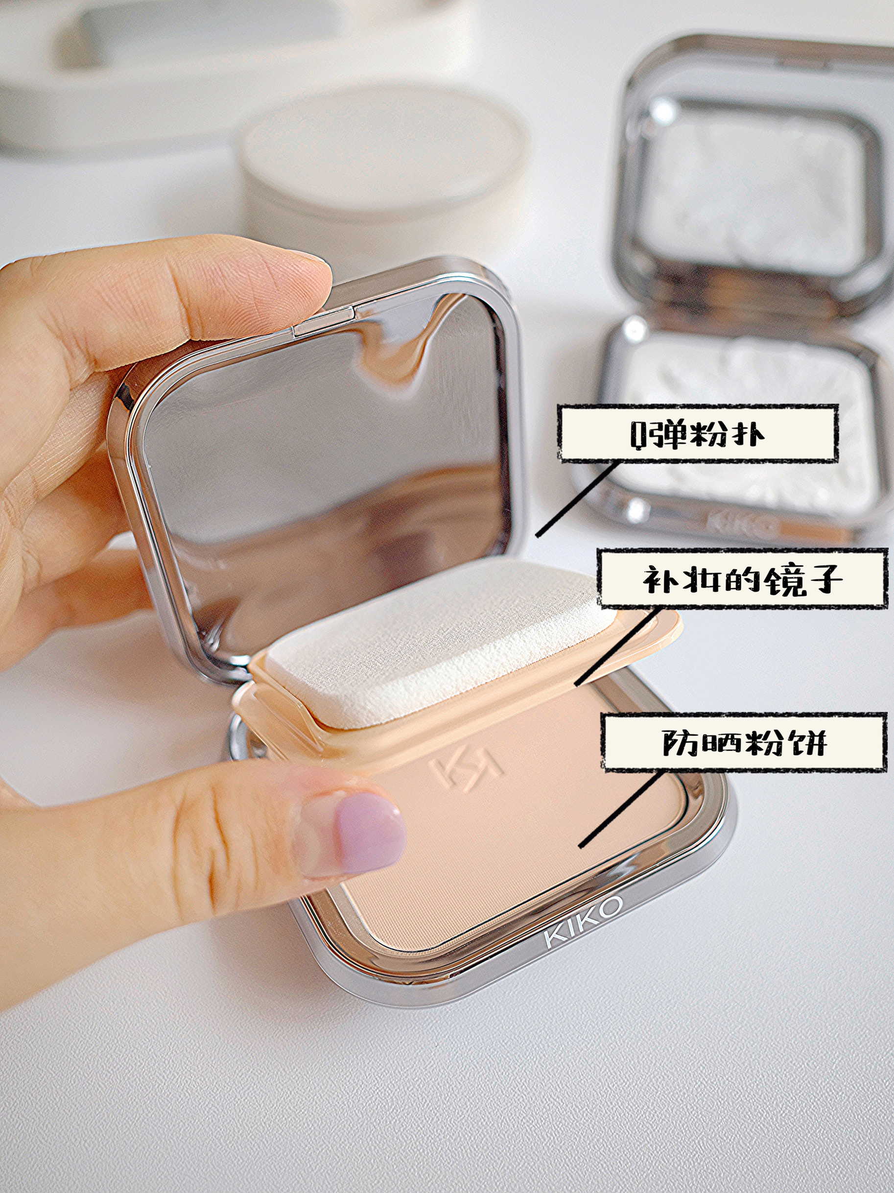 之前入了浮雕版的无色粉饼,觉得不错又买了同系列的有色粉饼; 一样高颜值的镜面外壳,这款粉饼更是好用,自带Q弹粉扑,而且粉扑和粉饼是分开的,干净卫生爱了;还配有小镜子哦~带它外出补妆真的太方便了! 我入的是#CR15象牙白,适合偏白肤色~其实黄皮也可用,因为粉质细腻!粉饼还带有防晒效果,定妆持.久也不易脱妆; 我平常脸部T字区很容易出油,经常用它来定妆,上脸后雾面柔焦的妆效自然又好看~KIKO...