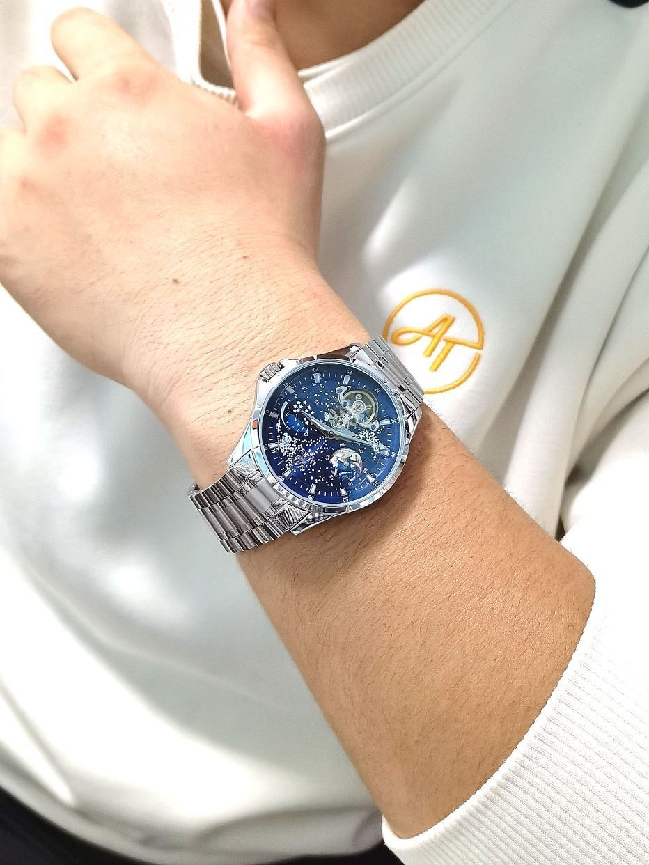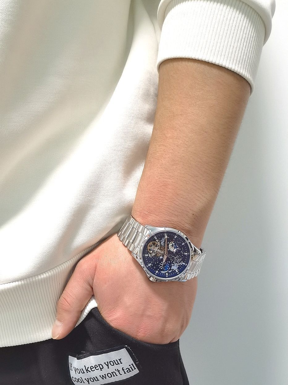 给自己准备的一款欧力时机械手表——真是不错 表盘是星空元素的一个设计 12小时地球表盘、24时月相功能 平时出街、商务都可兼备的一款手表 超精致的镂空透视机芯 清晰可见的精细工艺 当然夜晚还有夜光功能、可轻松看时间 外加30米日常生活防水 让你洗脸也不用摘掉手表真得劲 这么帅的手表我觉得我真是选对了