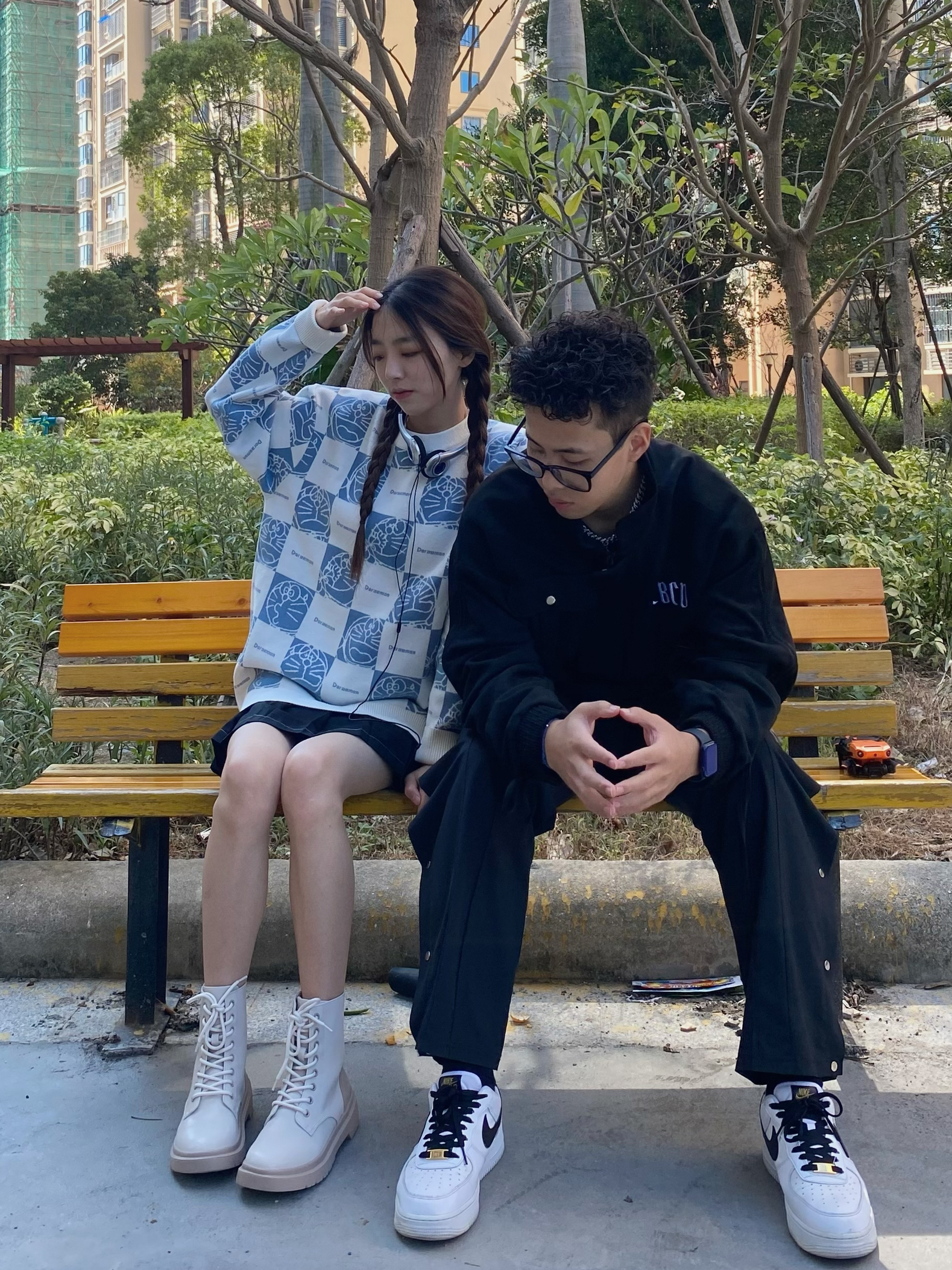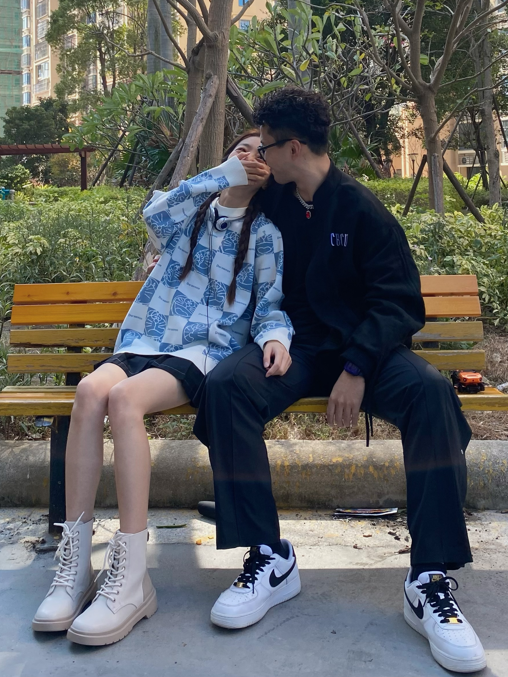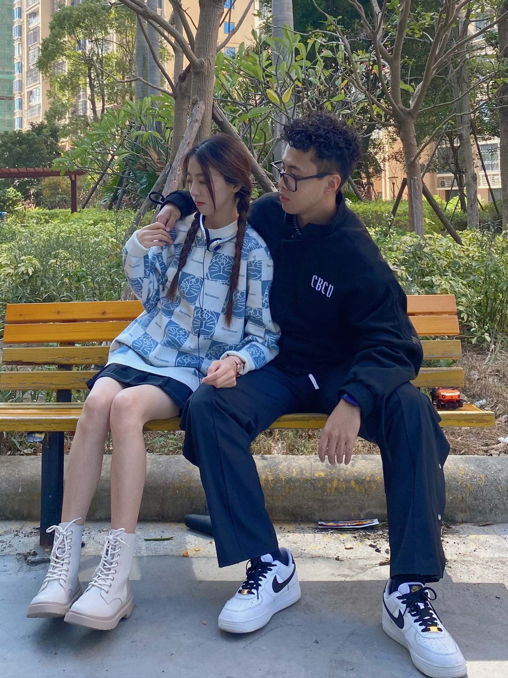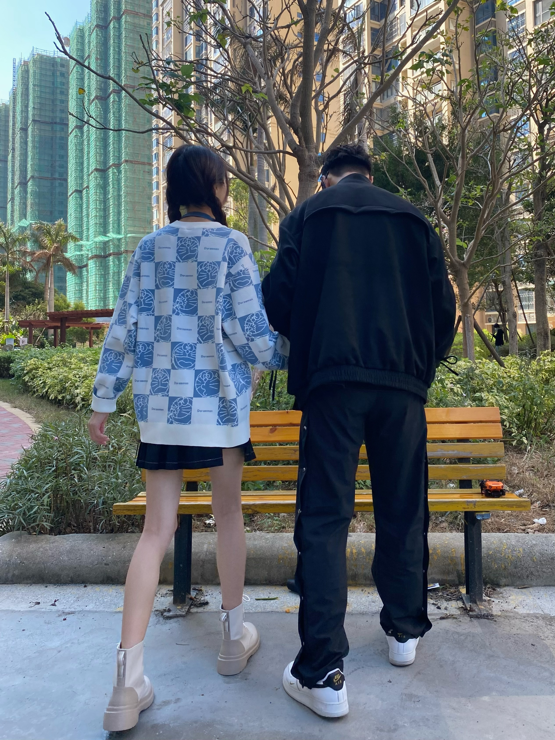 欢迎大噶来到我们情侣穿搭频道📺 👧:168/44 M 👦:182/70 Xl 风格:日系/街头/潮流 Doraemon/哆啦A梦 的满印毛衣也太可爱啦 任何女孩都不能拒绝🦷 蕉下 的马丁靴显得腿好修长 秋冬必备时尚靴👢 看看我的时尚好鞋 CBCD 男孩子穿黑色的外套也太酷了 版型超赞的外套可🐛