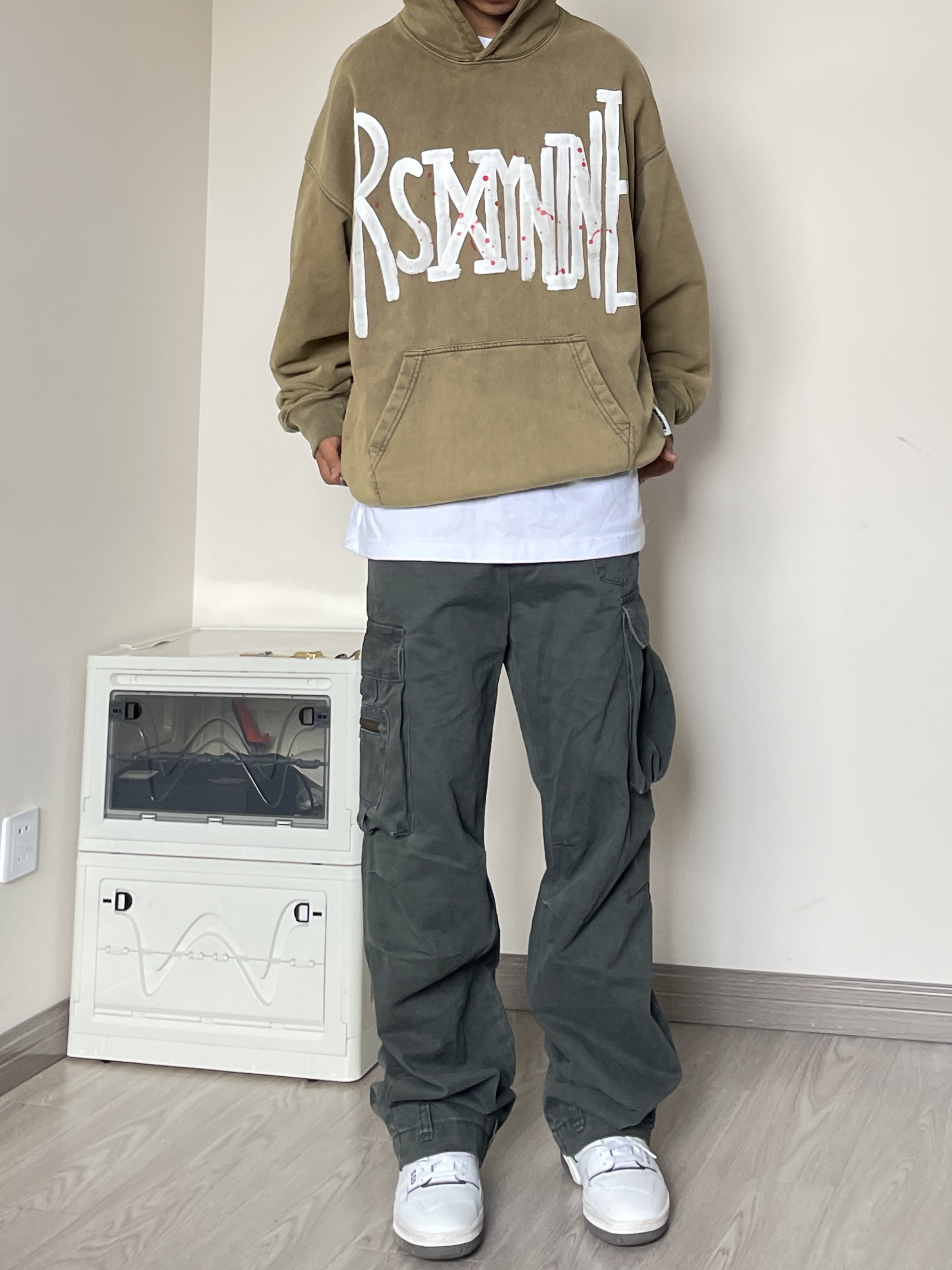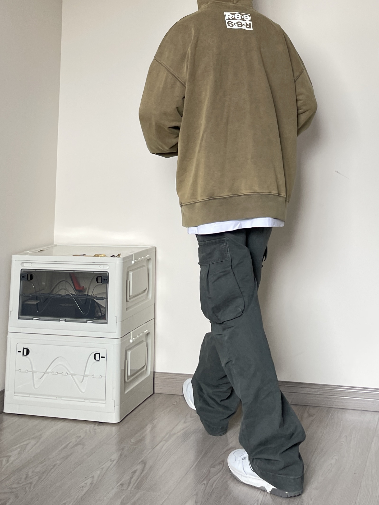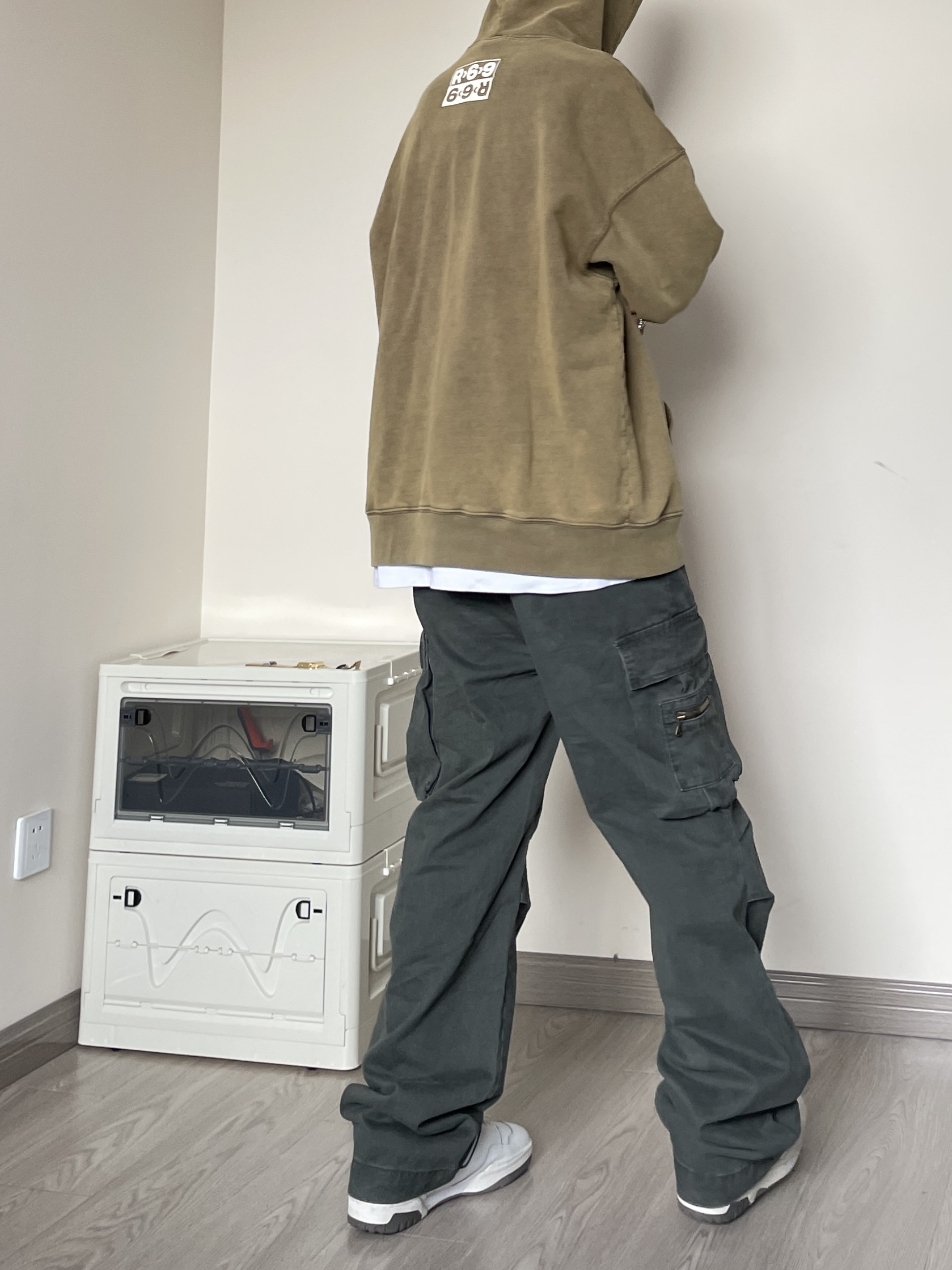 👔 上衣是来自R69的水洗做旧帽衫,克重偏高,版型硬挺有型。 卡其配色深得我心! 👖 裤子是来自Wildstory的做旧水洗工装长裤,两侧的立体口袋设计细节满满!裤脚的不规则设计也很赞。 👟 NB550
