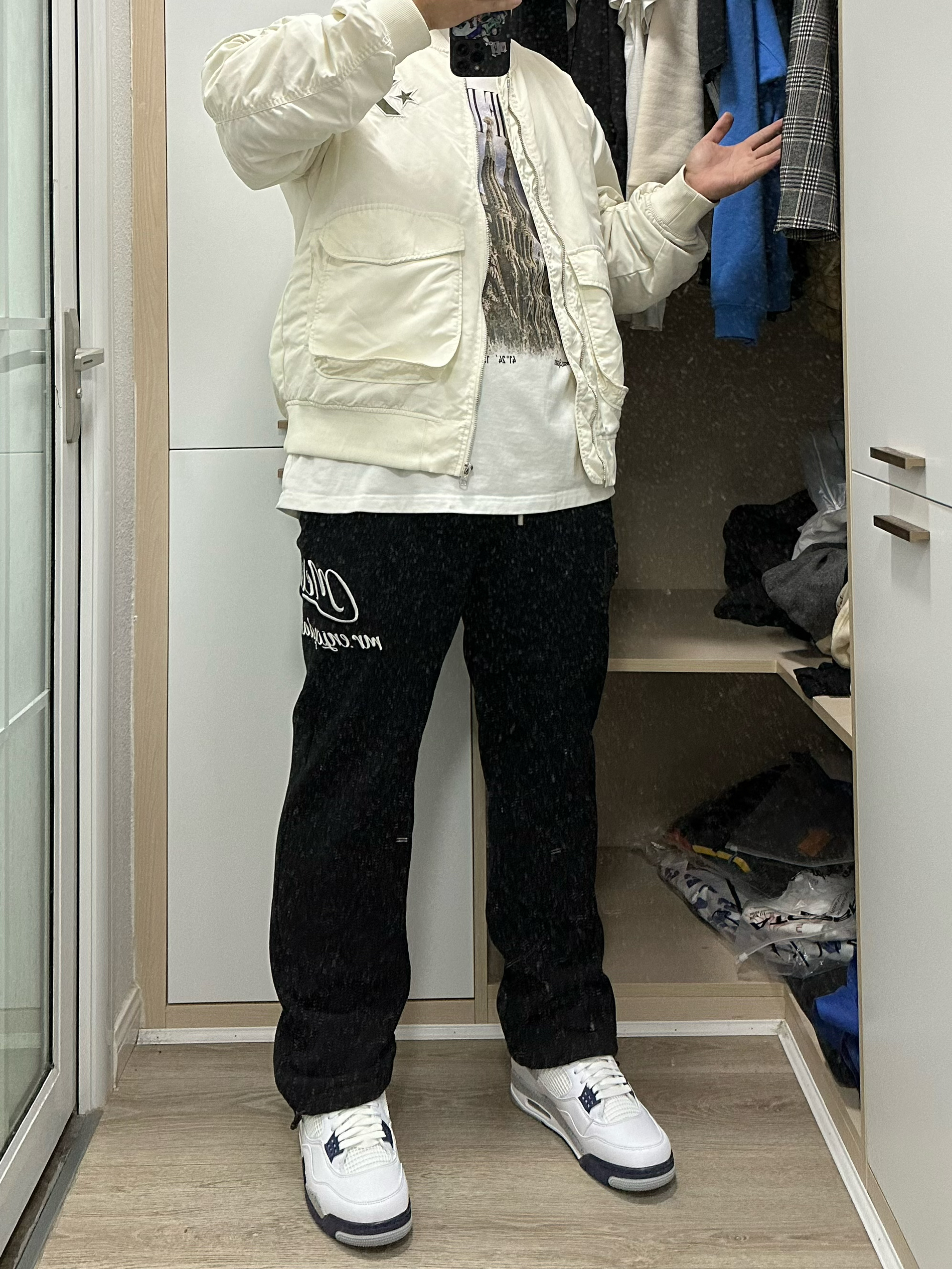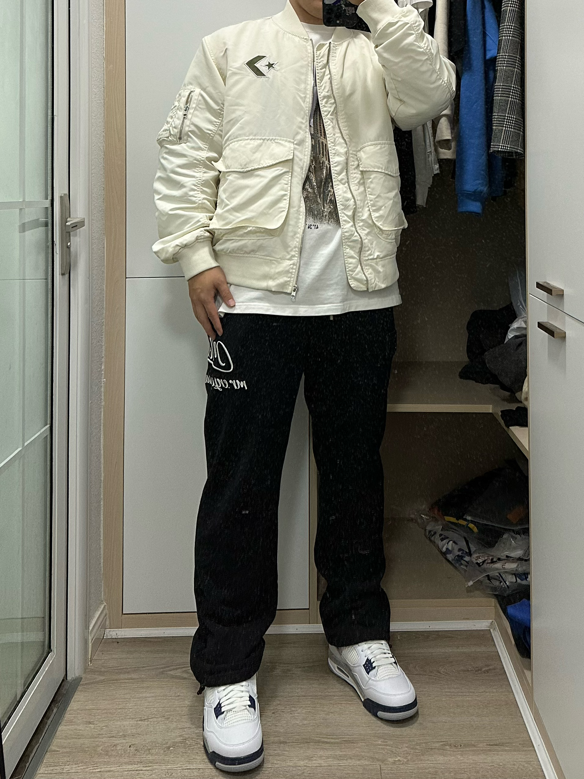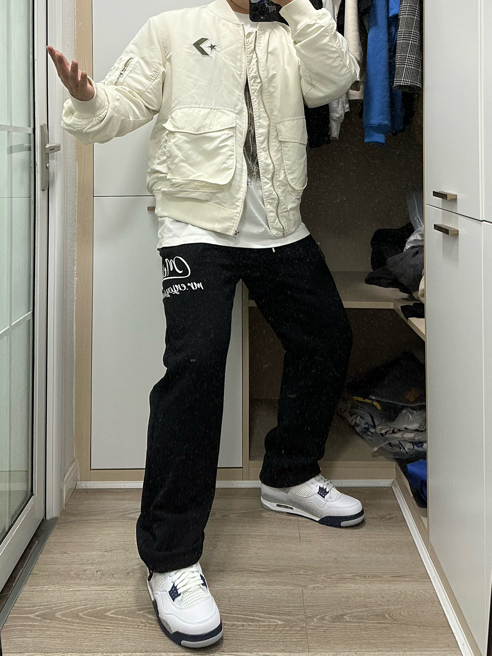 🍂黑白配色永远是不变的搭配法则 ⭐短款夹克可以修饰身形 🔥今天的穿搭就非常简单,夹克叠穿!内搭选择白色短袖,外面则是纯白夹克,这种面料有防风的特性!再搭配上一条阔腿裤和最近发售的AJ4,整个穿搭就非常简单干净! 👔:converse夹克 👖:medm 👟:AJ4 海军蓝 ✨每个人都有自己的风格,那么对于穿搭的理解也自然不相同。如果你喜欢的话,记得点赞加关注!