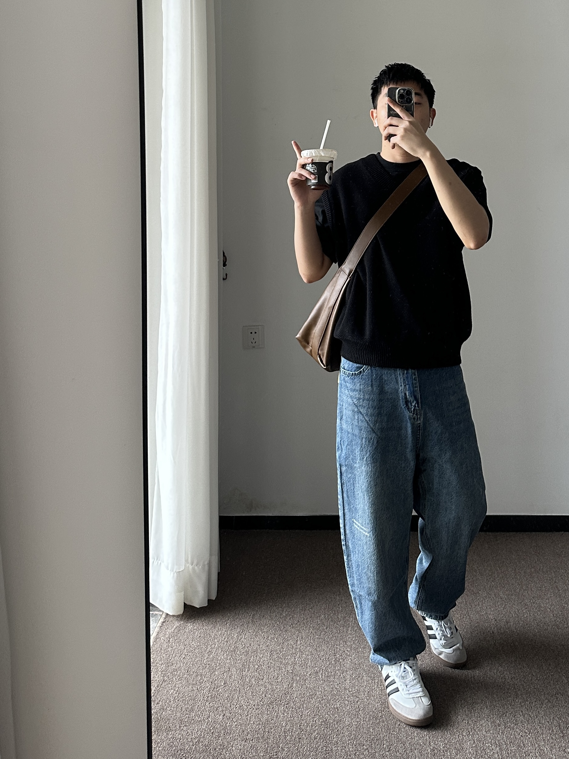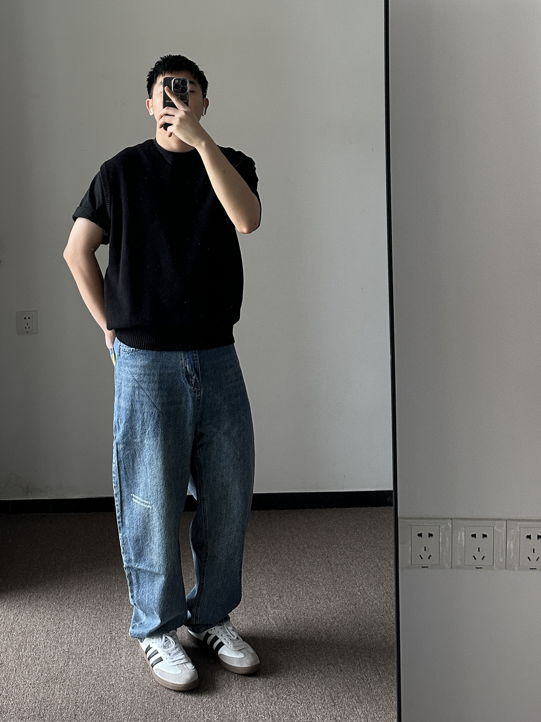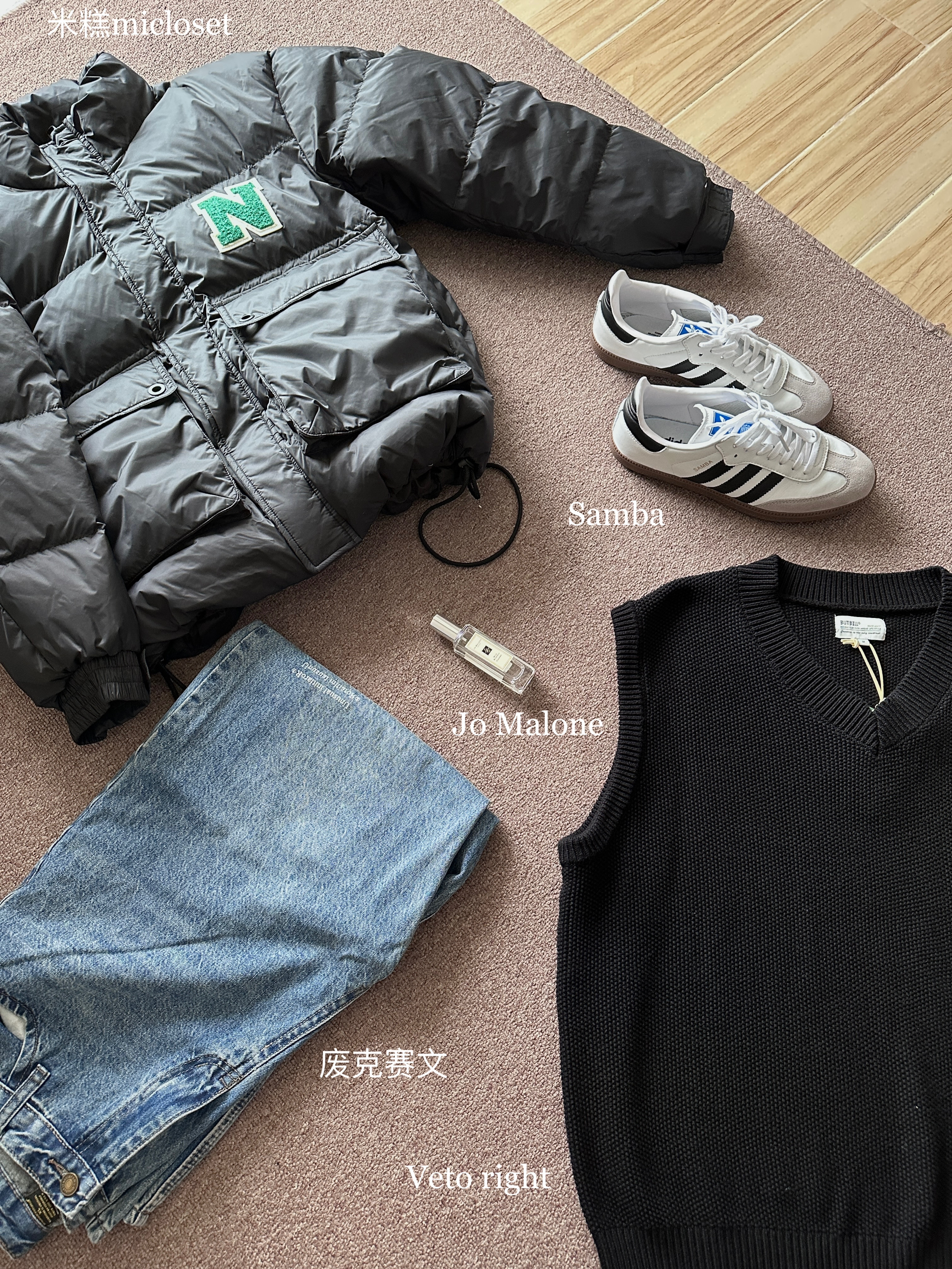 素人也能好看系列~ 174cm/65kg 🧥-简约的字母logo,下摆收紧,调节衣长,营造廓形短款版型,外套上身2XL。内搭针织马甲和短袖,衣袖可卷一圈,法式街头feel就来了,毛衣、短袖上身M。 👖-全世界都在穿的浅色牛仔裤,上身XL,看腰围裤长选!22FW要有。 👟- 必须Samba。 🏺- 蓝风铃呀