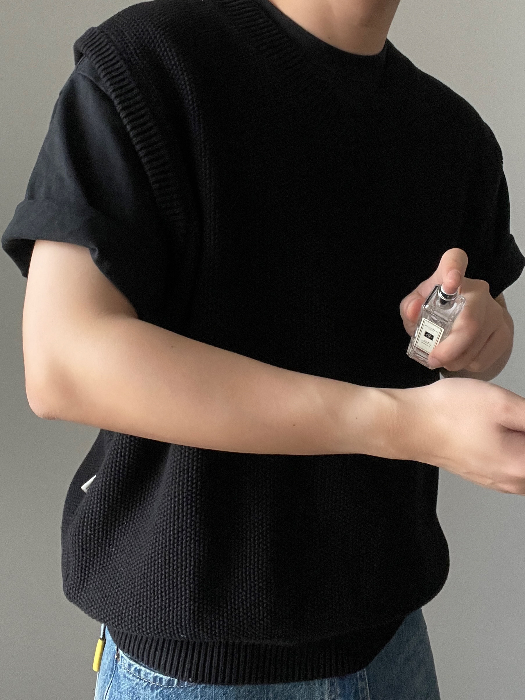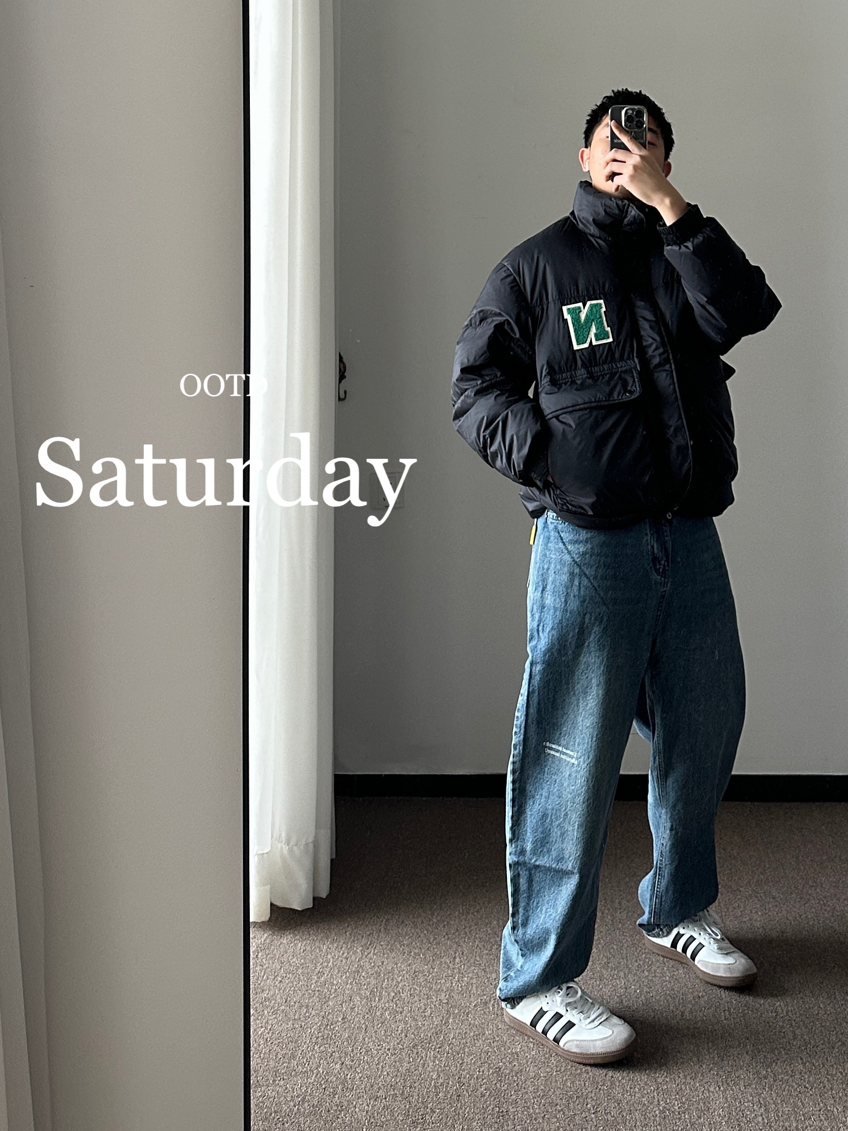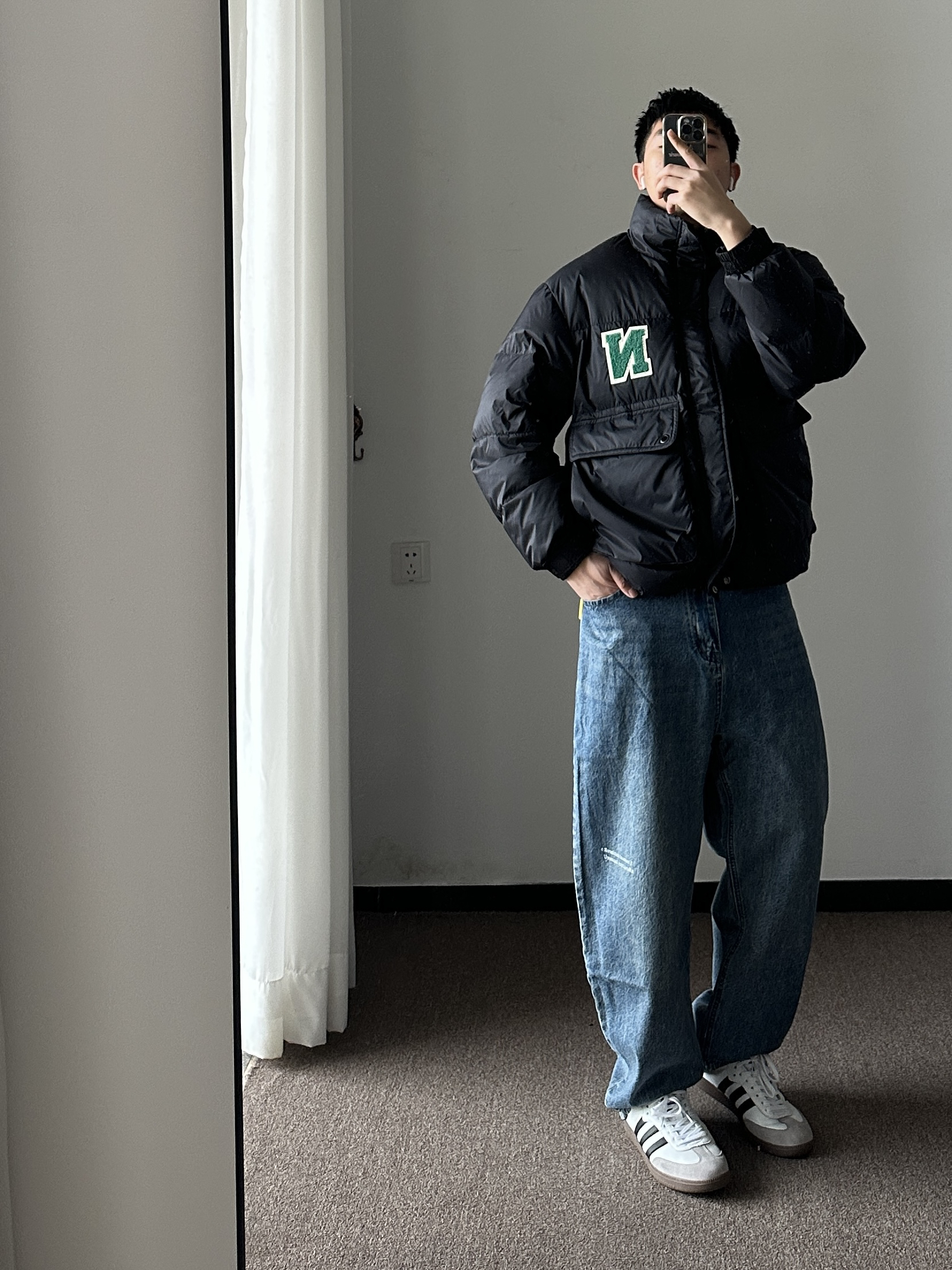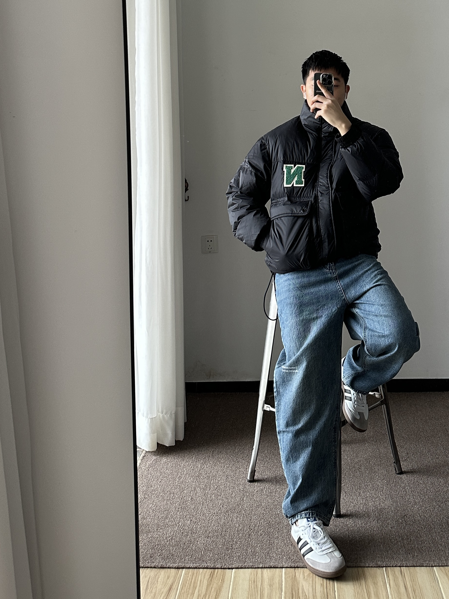 素人也能好看系列~ 174cm/65kg 🧥-简约的字母logo,下摆收紧,调节衣长,营造廓形短款版型,外套上身2XL。内搭针织马甲和短袖,衣袖可卷一圈,法式街头feel就来了,毛衣、短袖上身M。 👖-全世界都在穿的浅色牛仔裤,上身XL,看腰围裤长选!22FW要有。 👟- 必须Samba。 🏺- 蓝风铃呀