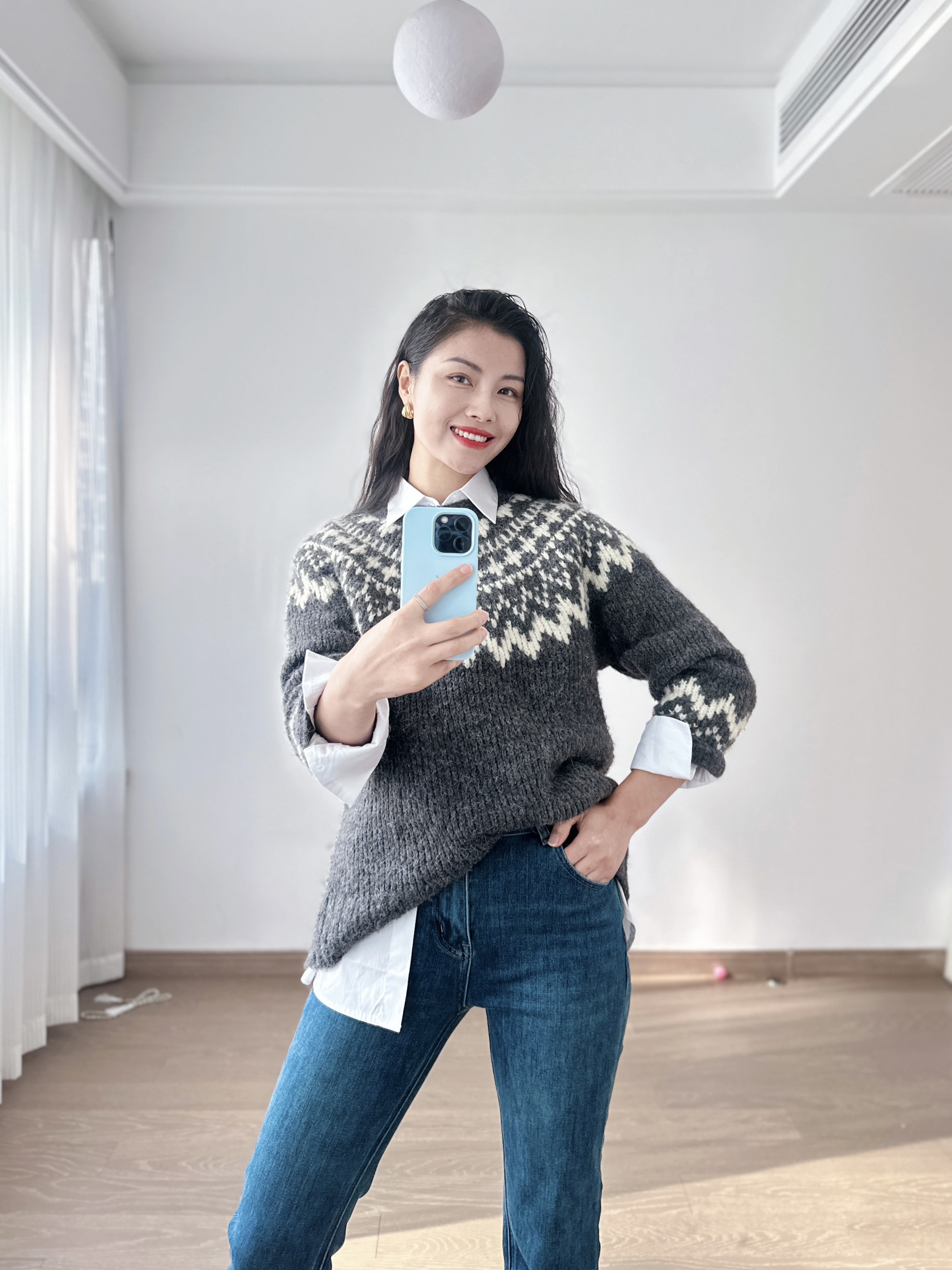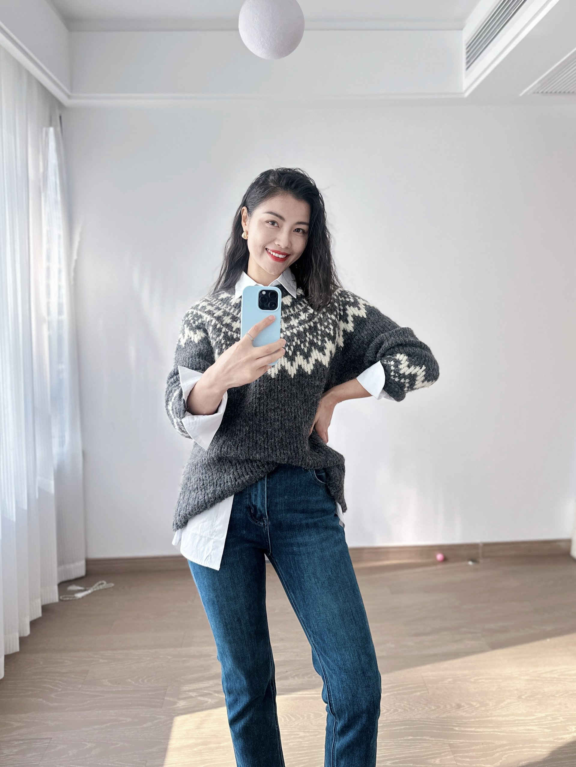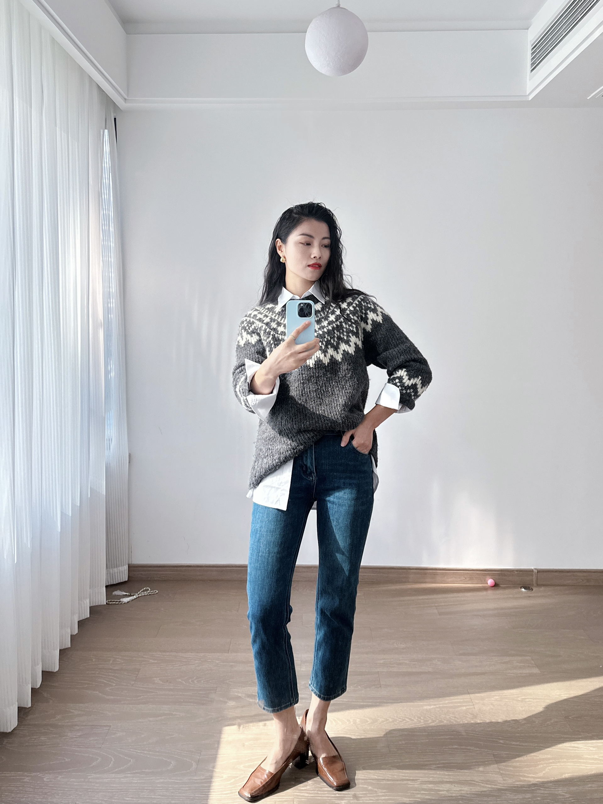 怎样将老毛衣穿出时髦感?整体氛围把握住 Look 1 前两天的笔记 配了百褶裙➕长靴 灰粉色系优雅随性 Look 2 日常休闲 今天元素 直筒牛仔 白衬衫 菲尔岛灰毛衣 棕色🏾方头鞋 方头鞋增加复古感,金属耳饰添加些许时髦氛围 穿搭小Tips : 1. 白衬衫不要中规中矩塞进去 扣子不对称扣一颗,下半部分露出一侧衣角,增加层次且能修饰身材 2. 衬衫袖口翻出 可上拉,露肤,...