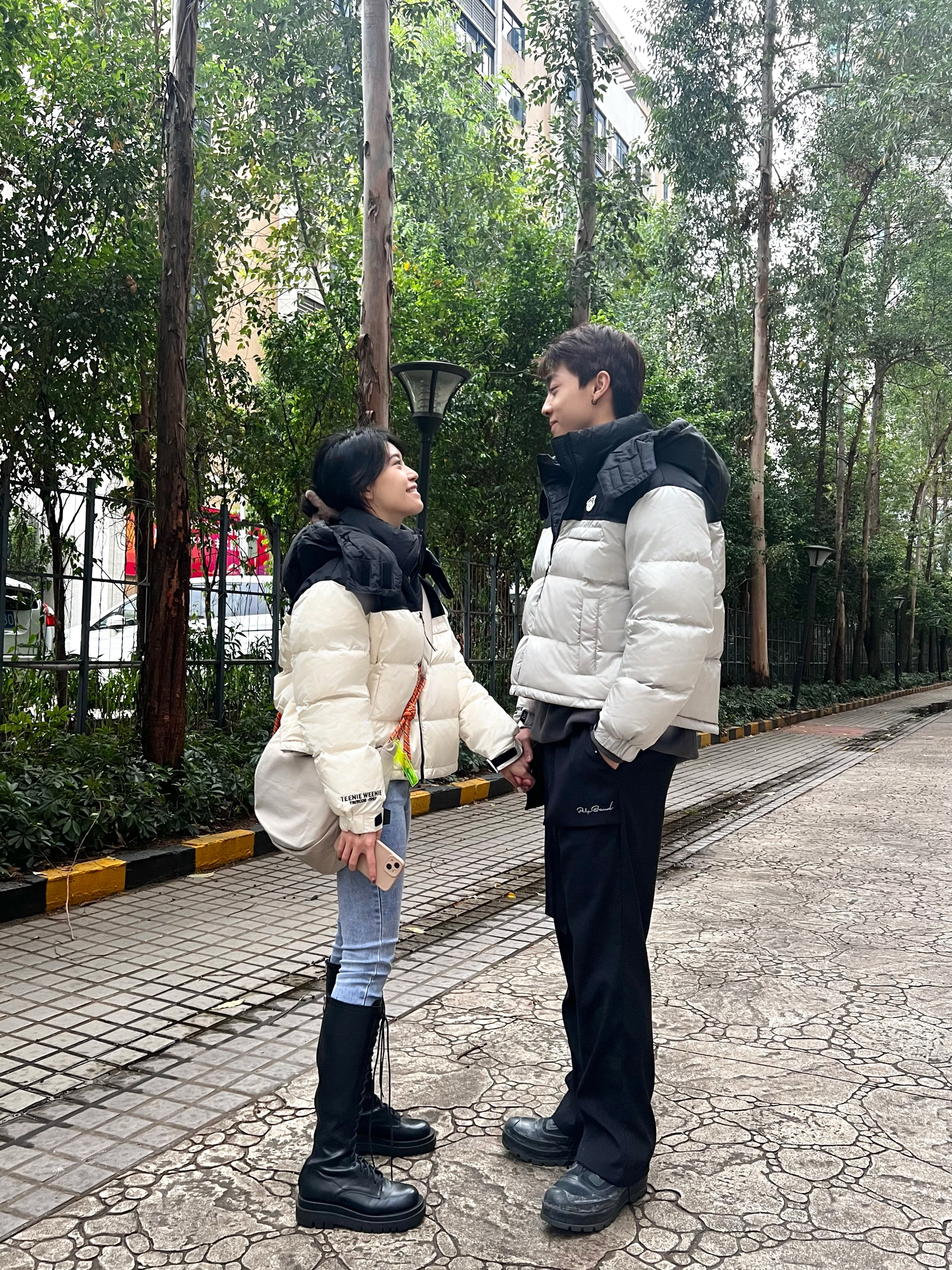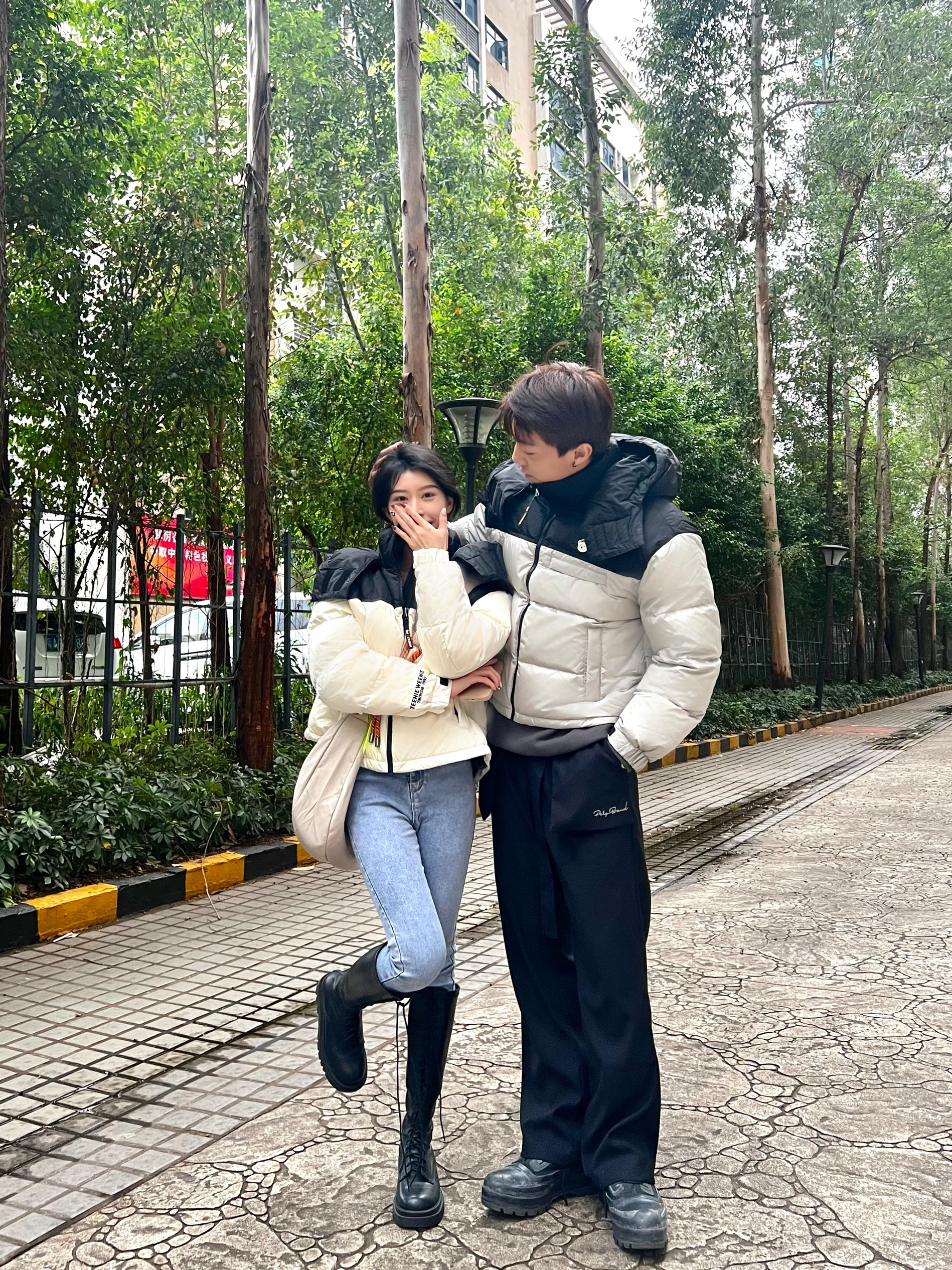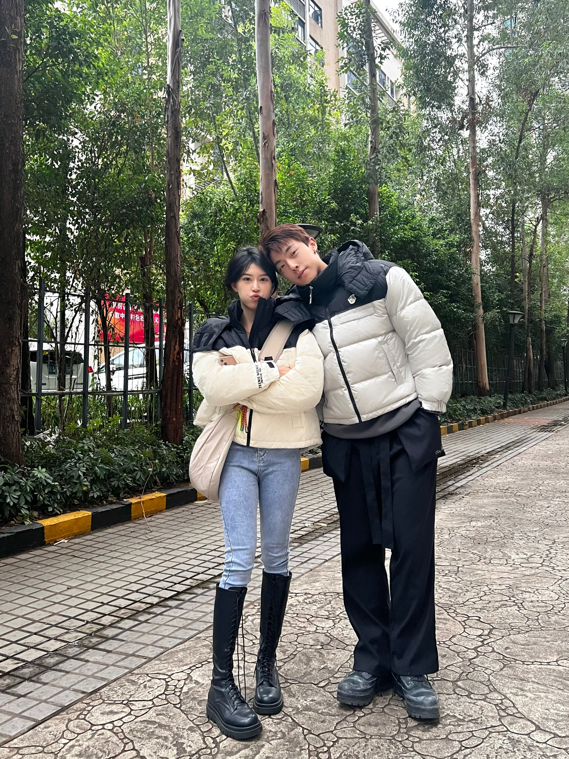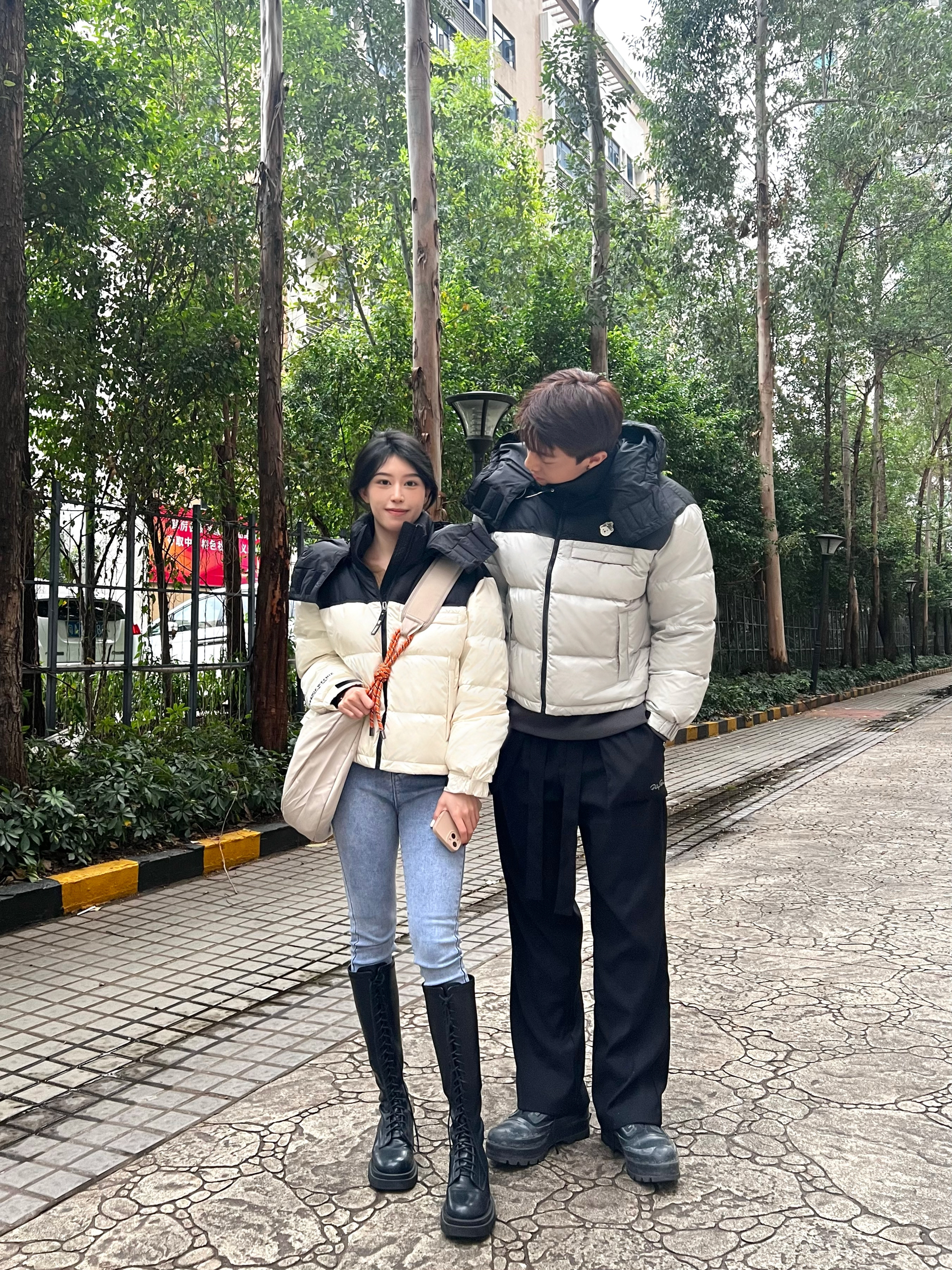 关于穿搭 我是短款羽绒服➕紧身牛仔裤➕长靴 男朋友是短款羽绒服➕直筒西裤➕靴子