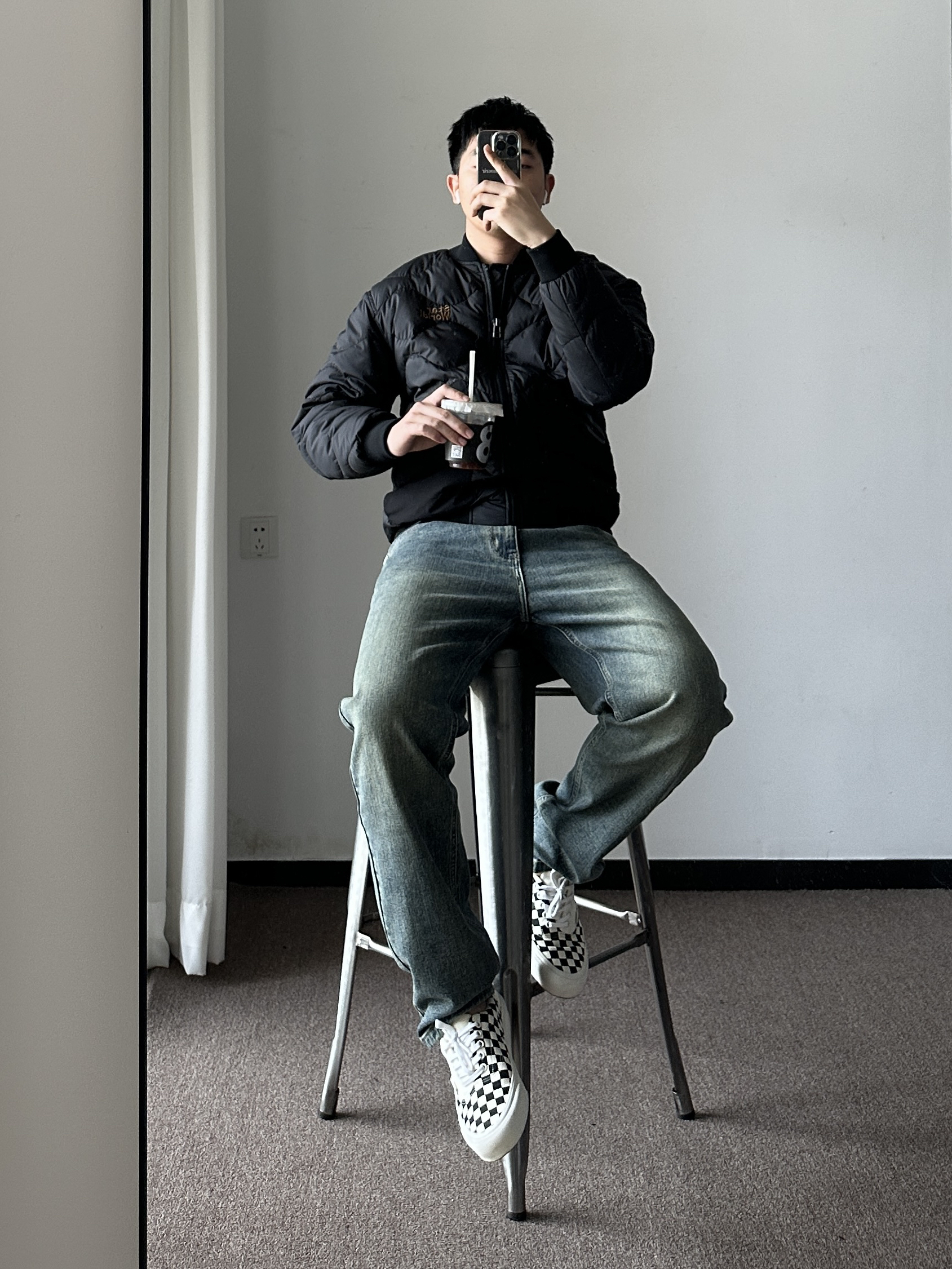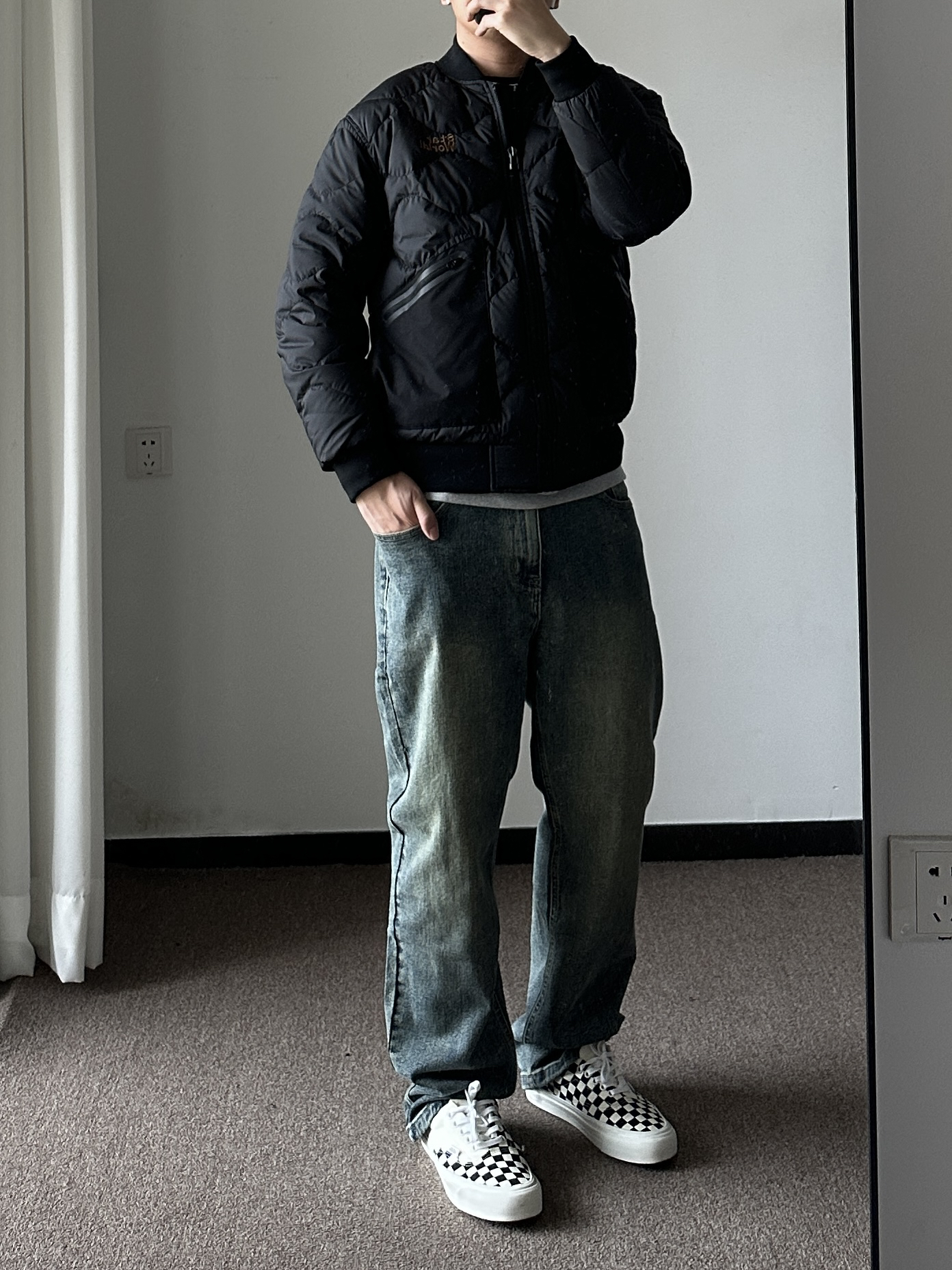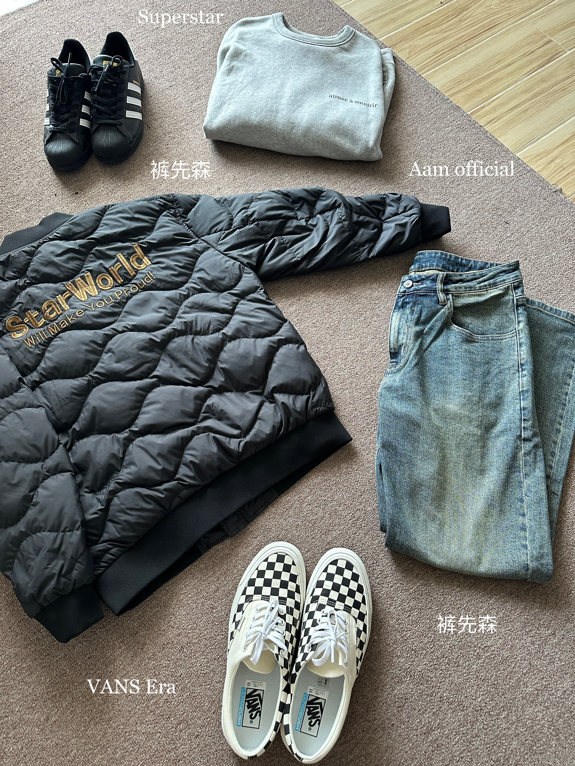 素人也能好看系列~ 174cm/65kg 🧥-飞行夹克棉服,衣柜里的百搭外套,上身XL,版型偏小。注意选择,内搭卫衣保暖好看。 👖-浅色牛仔裤怎么搭怎么好看,嘻嘻~上身33,参考一下,主要看腰围和裤长,整体合身微宽版型。 👟- 可以superstar,也可以棋盘格。
