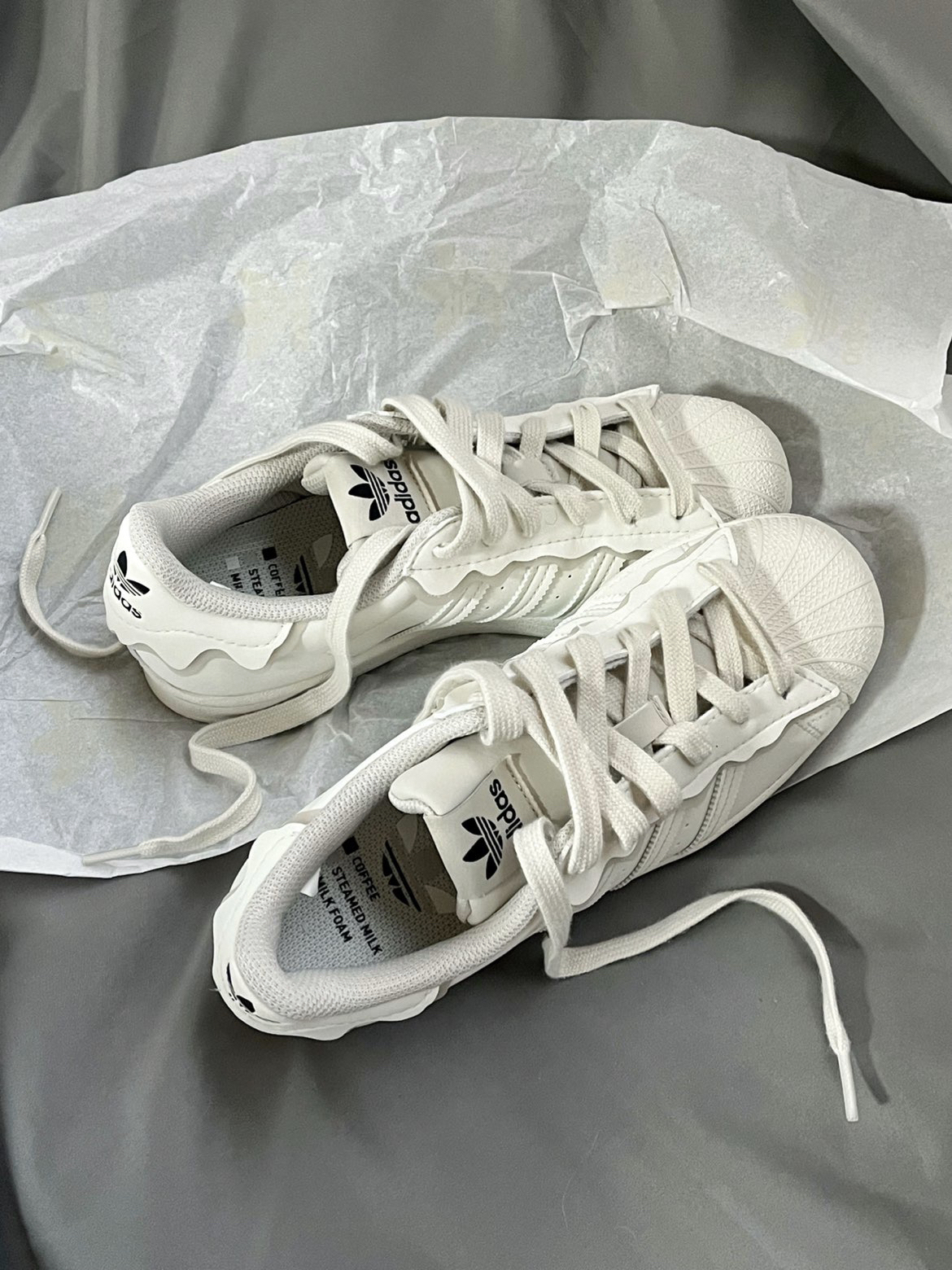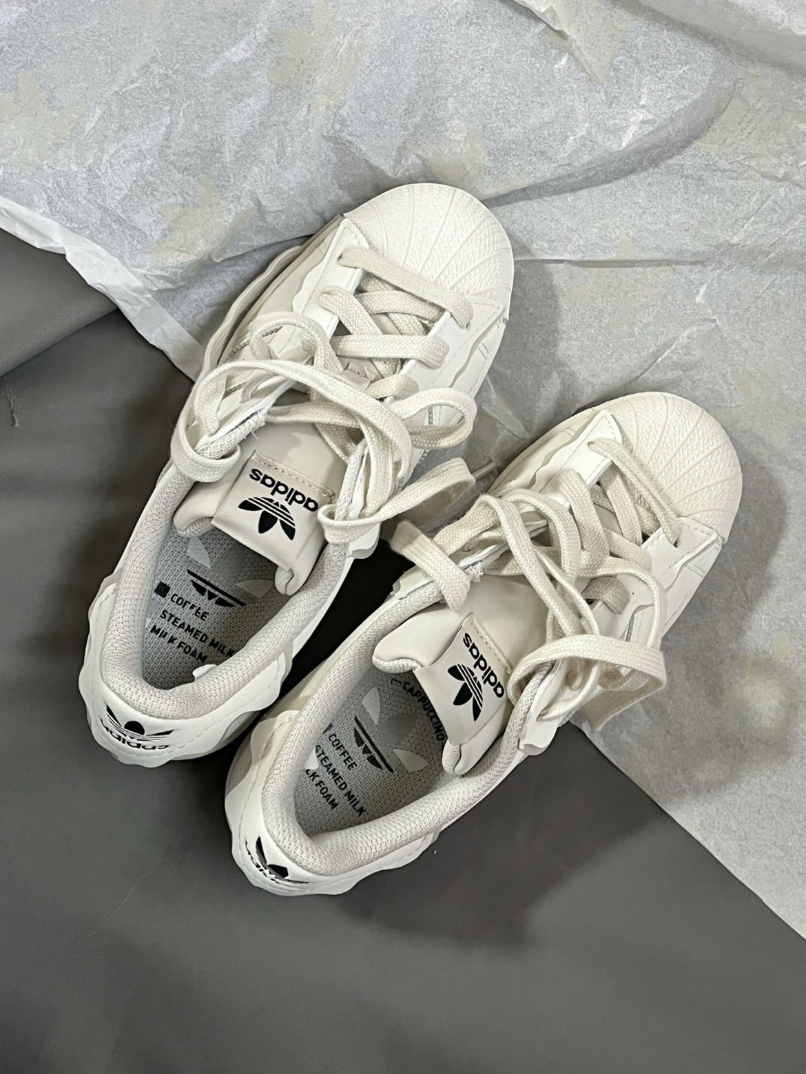 这杯卡布奇诺味儿太浓啦!! ☕️ Drink me和鞋垫上的菜单设计真的有戳中我的萌点~ 好适合软妹!!🍬 但鞋垫上的字母感觉是会掉的那种 不过在里面也无所谓啦~ Adidas Superstar贝壳头Coffee系列 这双配色叫卡布奇诺🎀🎀🎀
