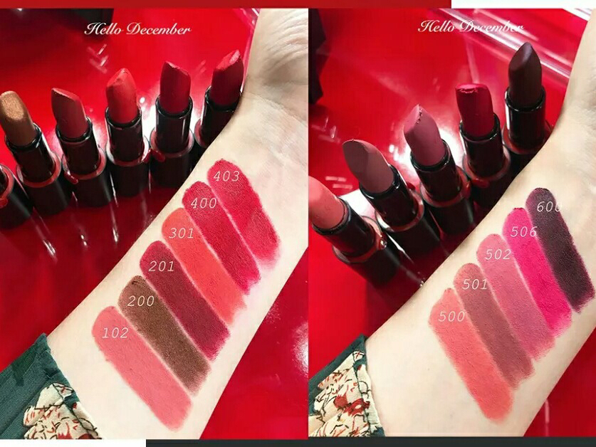 盼星星盼月亮 终于~~~~上市啦~ 😍哑光唇膏顾名思义就是哑光质地 但是这款厉害的是 完!全!不!会!干! ☺#400这支海报同款正红色 发布会当天体验区最热门的颜色 也是卖得最好的一支 好看程度不亚于雕牌999 ☺#500这一支也是super有人气 充斥着珊瑚调的气质奶茶色 上嘴温婉可人 一秒变成邻居家的好孩子 😚201薄涂素颜也能擦,灰常提气色 厚涂一定要化妆 上嘴立马变身日杂小姐姐 不仅不挑...