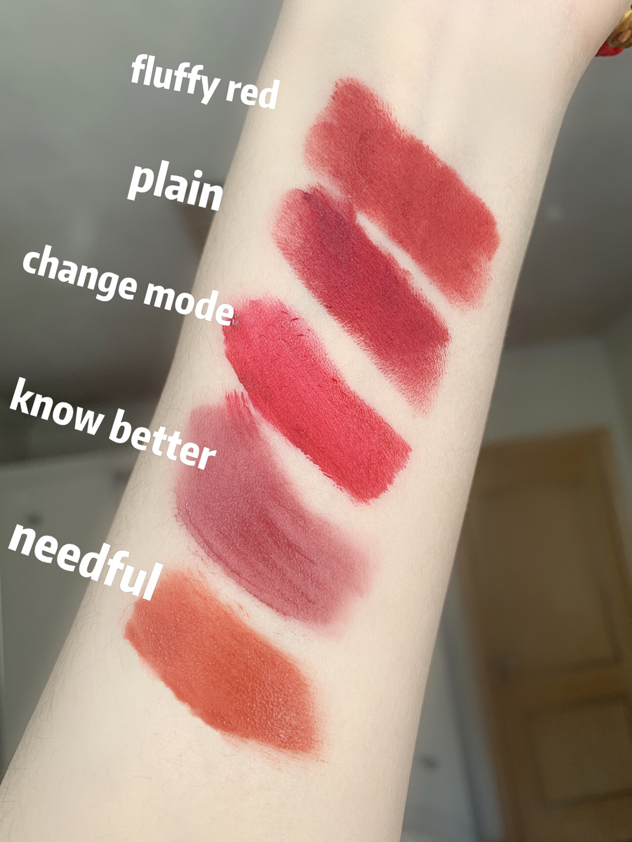 这几个色号涵盖了3CE云朵唇釉、烟管口红还有慕斯唇釉 fluffy red和plain是不挑人的,黄皮闭眼入 显白大气 change mode白皮小姐姐用就是惊艳四座 know better黄皮别入,好看的梅子色很特别 needful就是日杂肉橘🍊特元气 恋爱中的女人阿