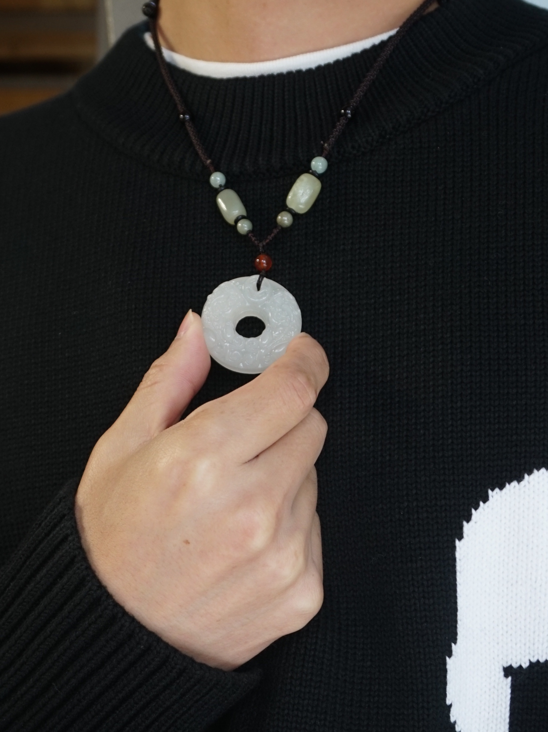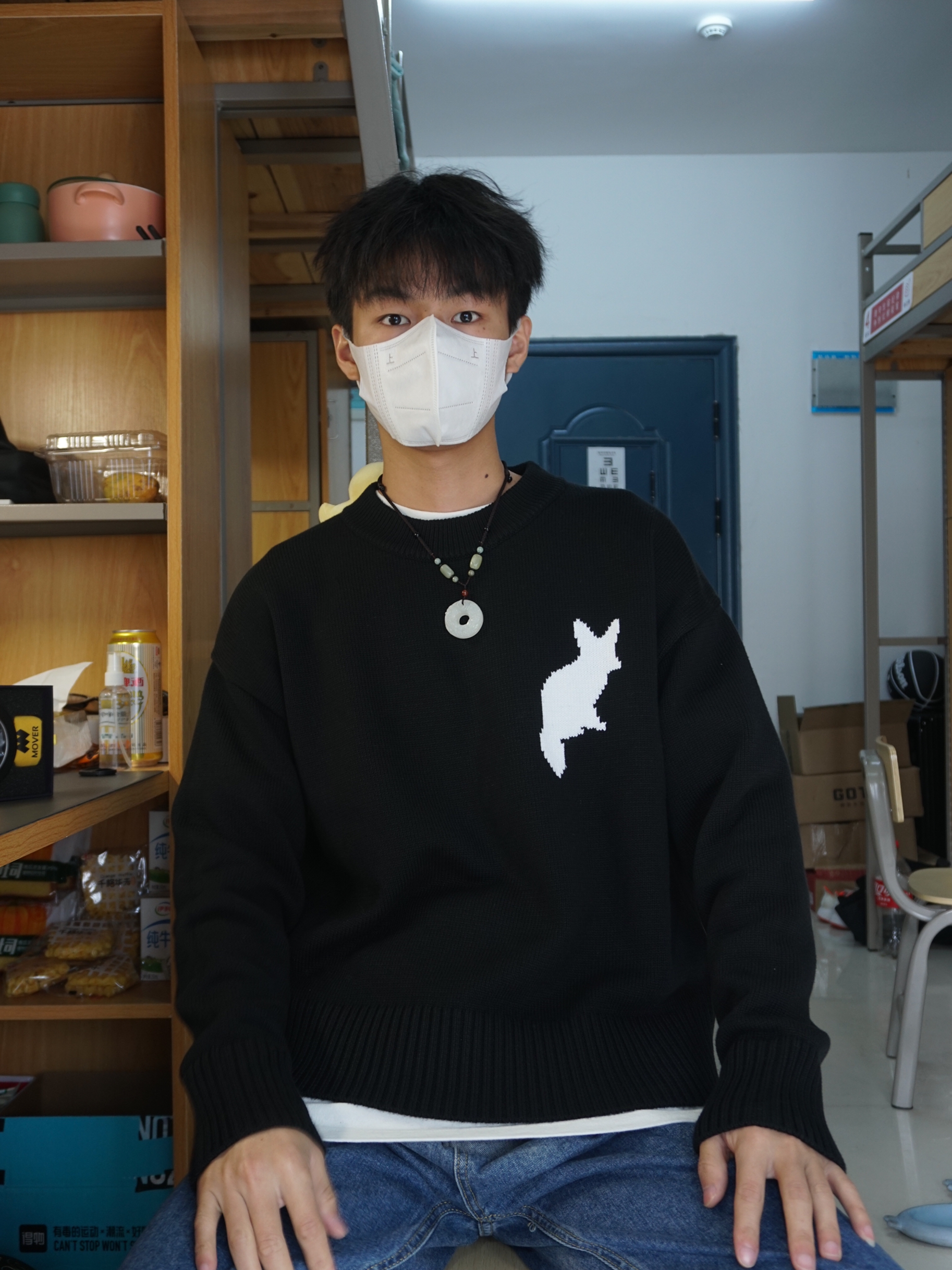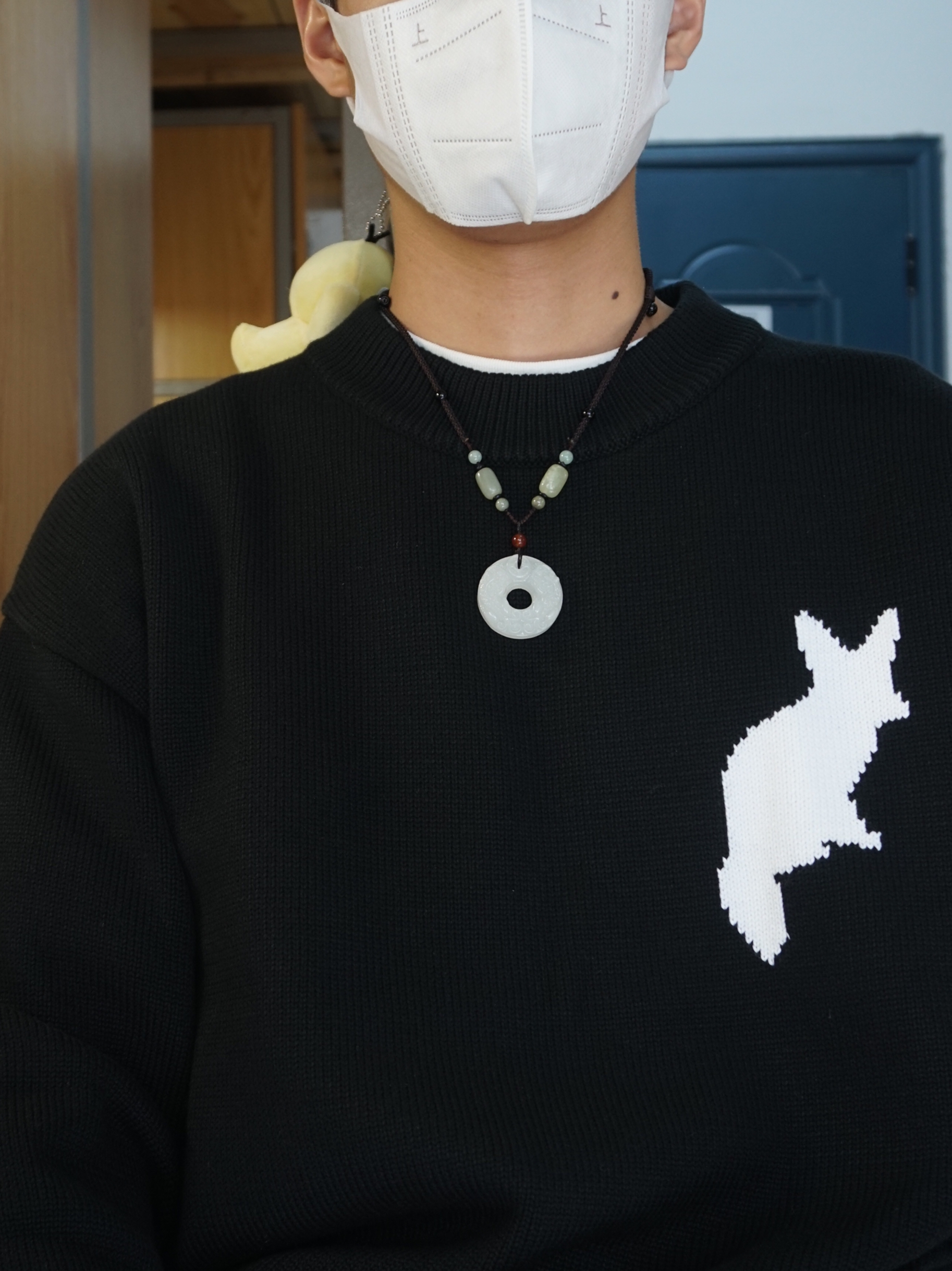 ❄️冬天来啦,气温骤降,大家平时要注意好好保暖呀 👔白T恤打底外配了一件黑色的毛衣,毛衣上还有一只白色的大耳狐🦊图案,设计简约,20%羊毛➕80%棉,质感超好! ➕今天上身还搭配了一条Mover 魔物的一条吊坠,跟这边毛衣搭配很有新中式的风格呀,吊坠用的天然玉石的材料,再加上表面精雕出来的花纹,佩戴效果超显气质✌🏻而且还有着吉祥如意、招财转运的寓意🥰