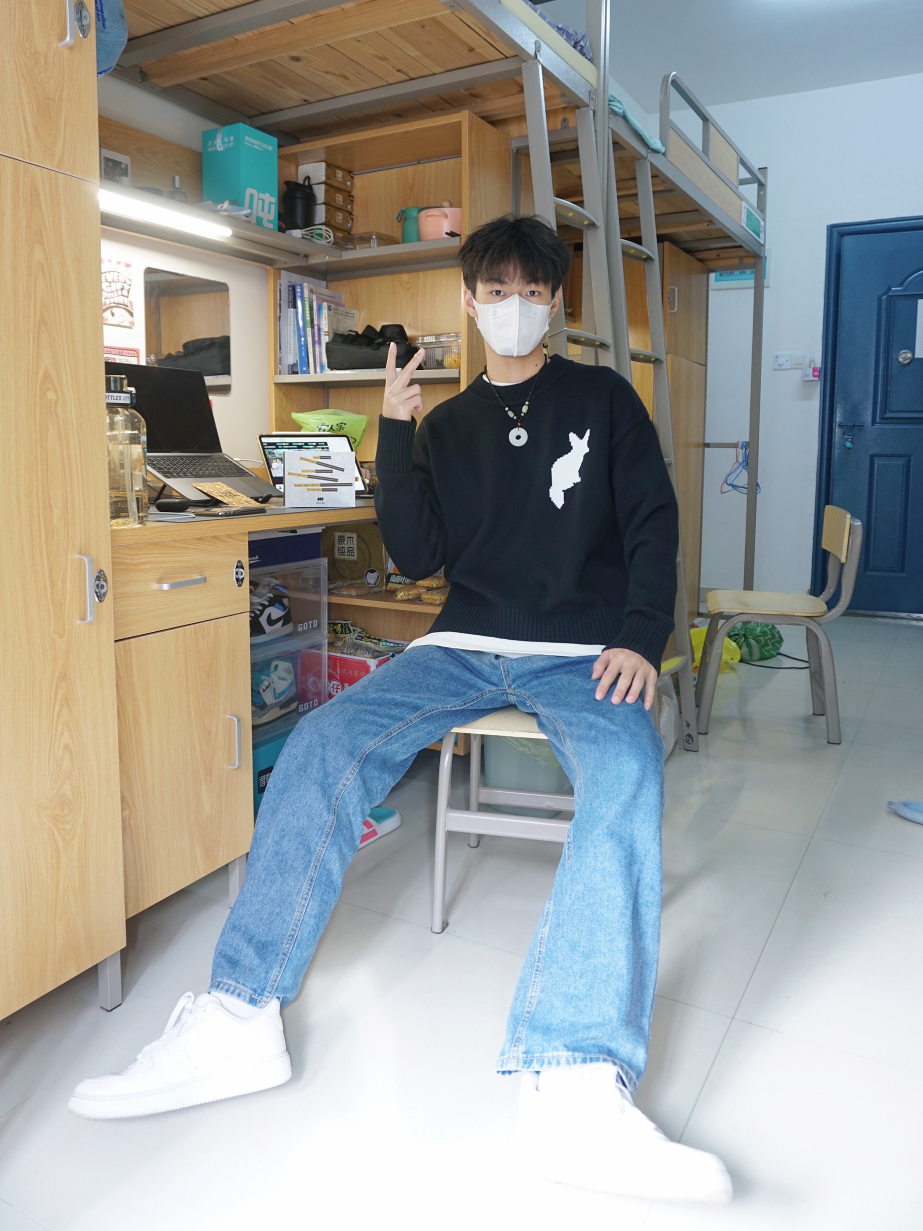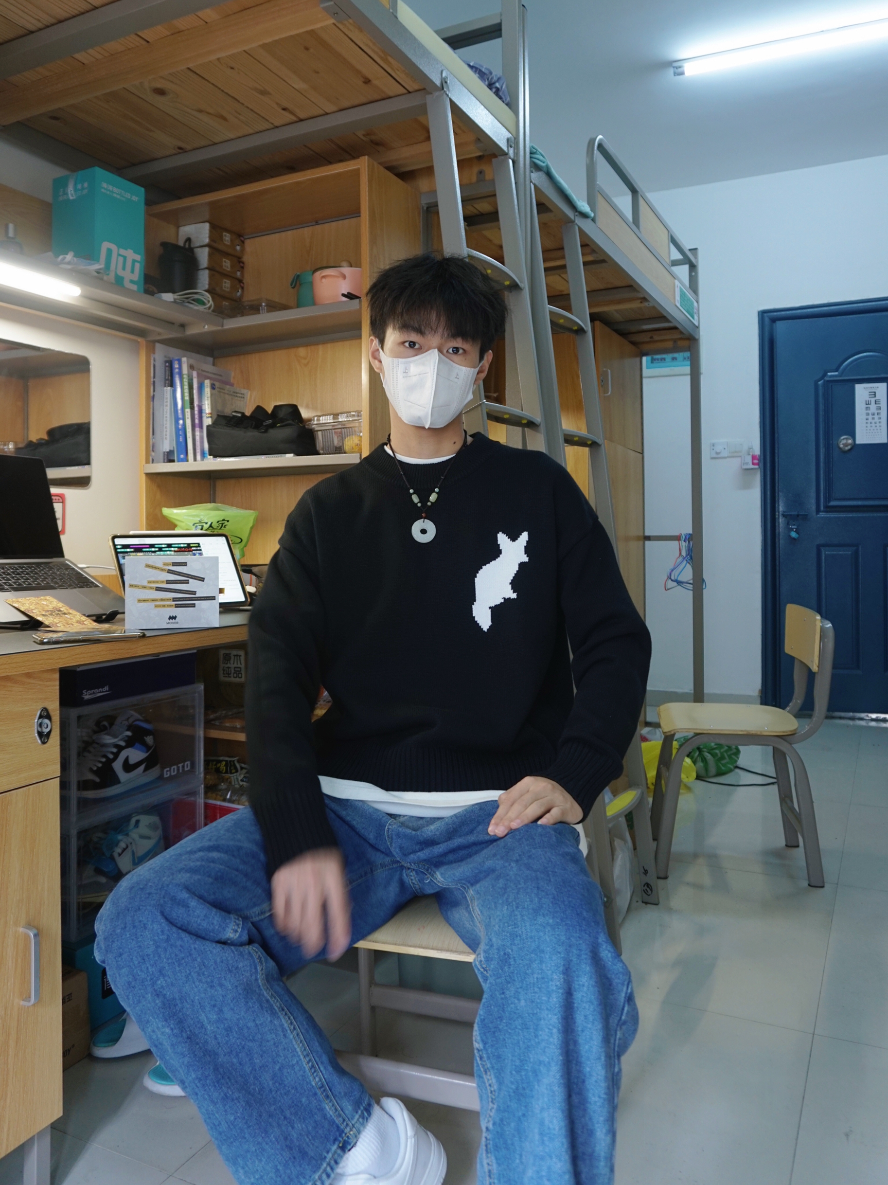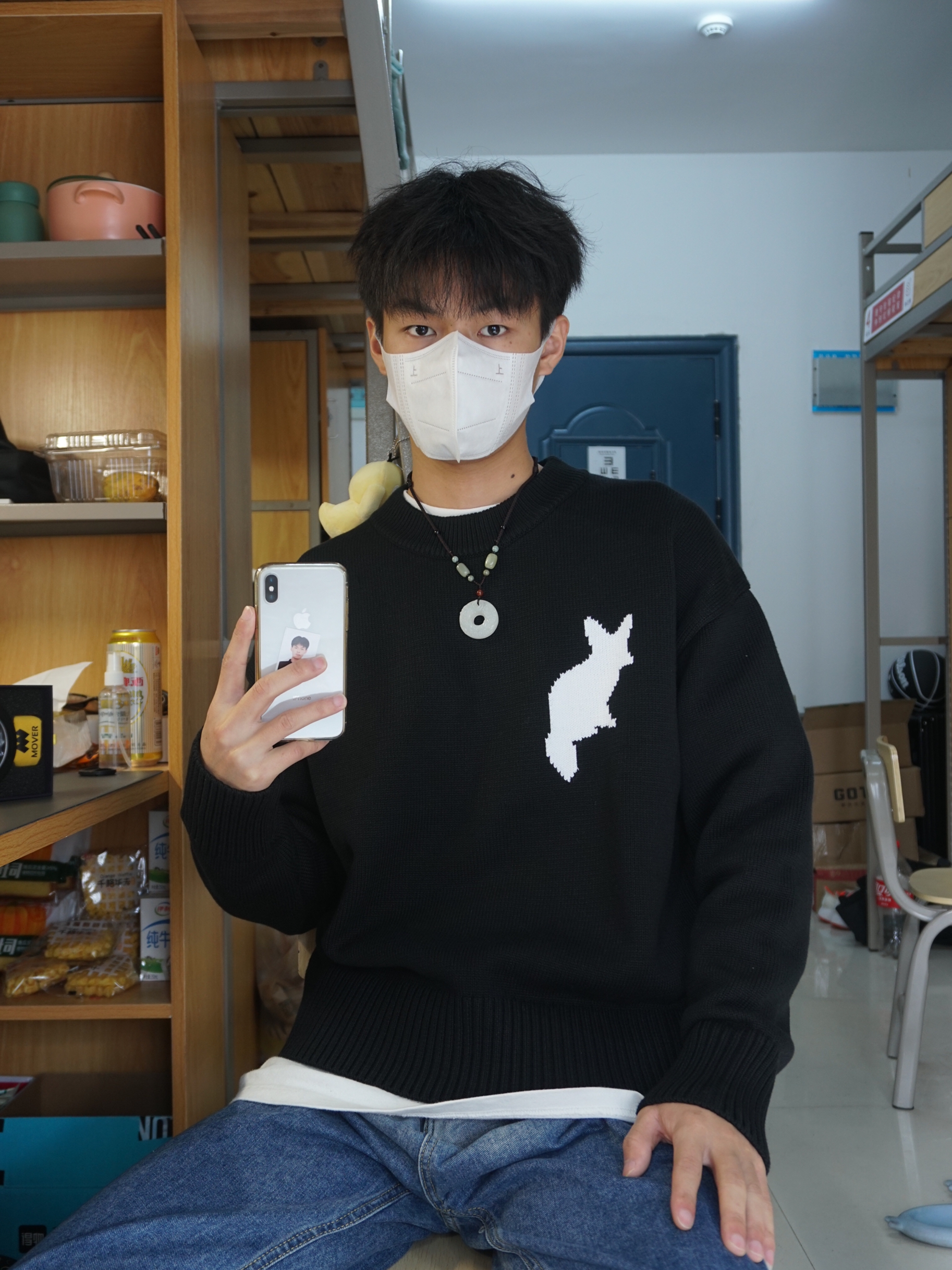 ❄️冬天来啦,气温骤降,大家平时要注意好好保暖呀 👔白T恤打底外配了一件黑色的毛衣,毛衣上还有一只白色的大耳狐🦊图案,设计简约,20%羊毛➕80%棉,质感超好! ➕今天上身还搭配了一条Mover 魔物的一条吊坠,跟这边毛衣搭配很有新中式的风格呀,吊坠用的天然玉石的材料,再加上表面精雕出来的花纹,佩戴效果超显气质✌🏻而且还有着吉祥如意、招财转运的寓意🥰