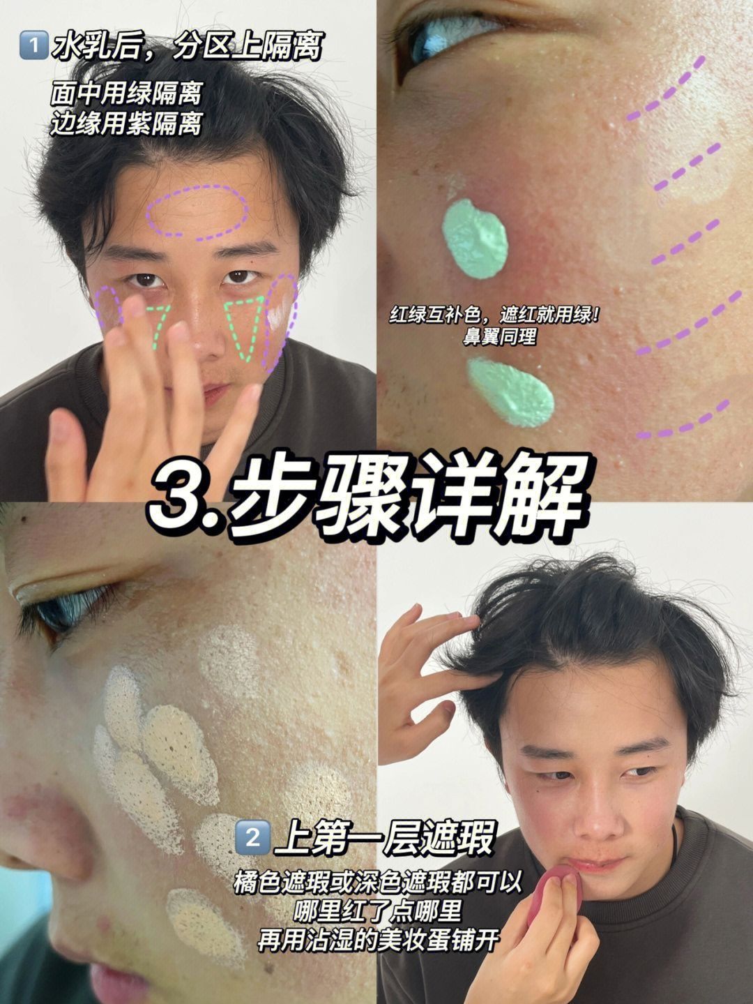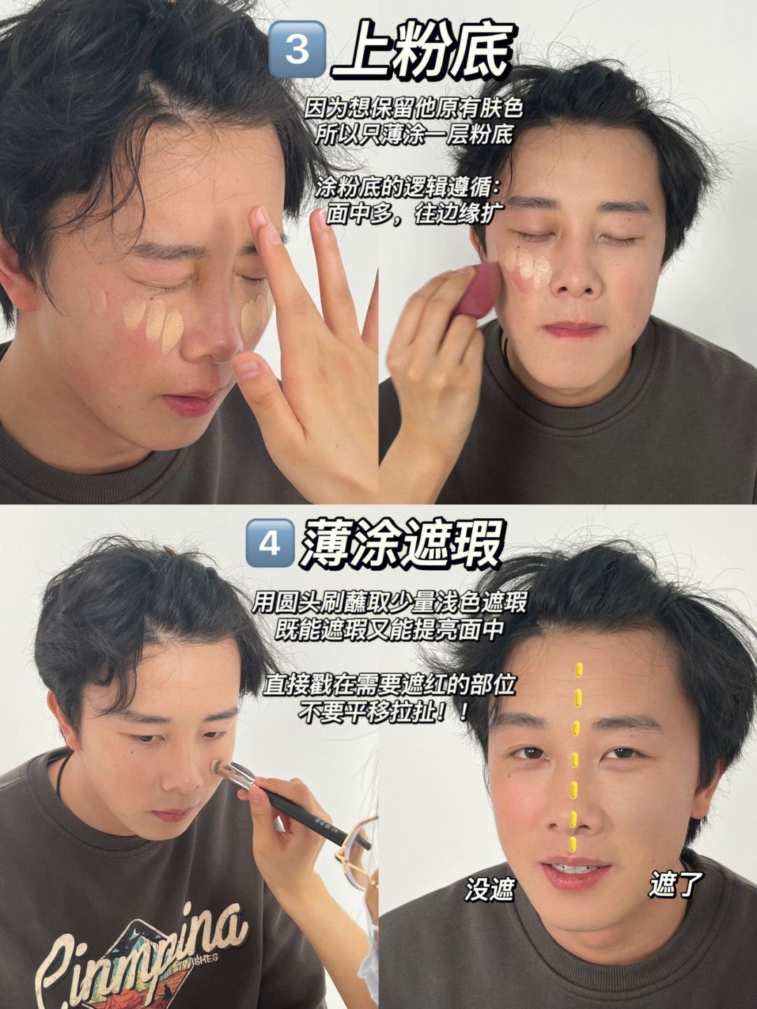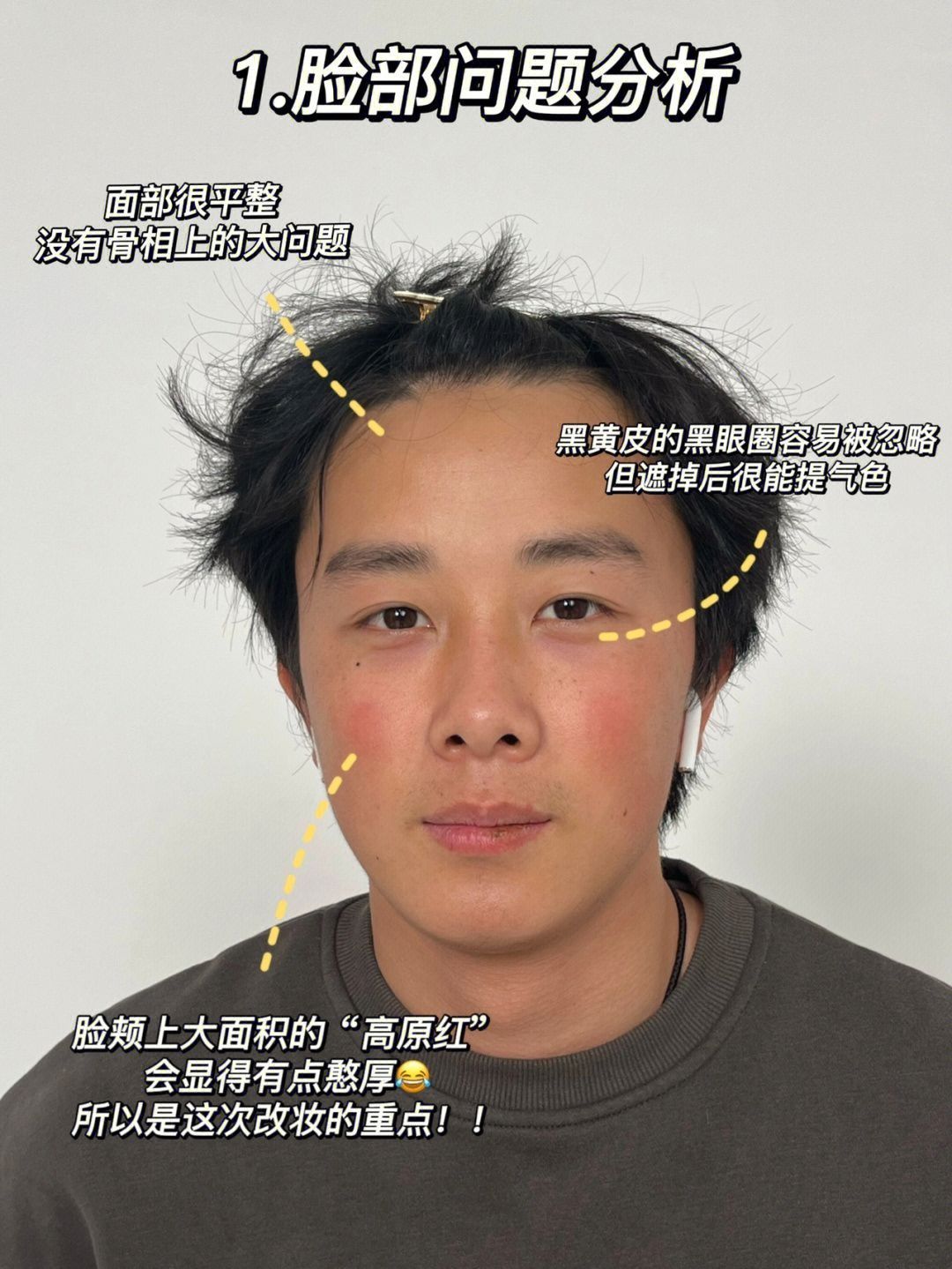 给同事们化妆后,发现化妆最重要一点就是要先认清自己的优点和缺点‼️ 拿1号举例子哈,他骨相真滴很好,但是皮肤比较差,尤其是两坨高原红,影响了他的气质,所以我们就要“对症下药”✔️ 正好,评论里问得最多的就是他高原红是咋去掉的,我就出了这个教程~ 这个遮瑕原理同样适用于鼻翼两边的泛红,但女生遮瑕时记得薄涂一点,并且看自己的皮肤状态决定是否要叠加哦 ————————— 给他遮完后还是很有成就感的,虽然...