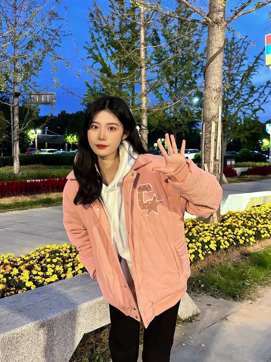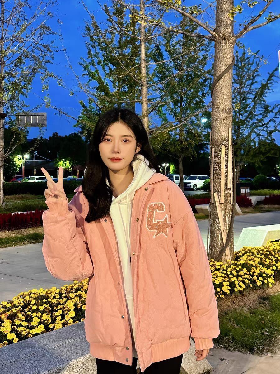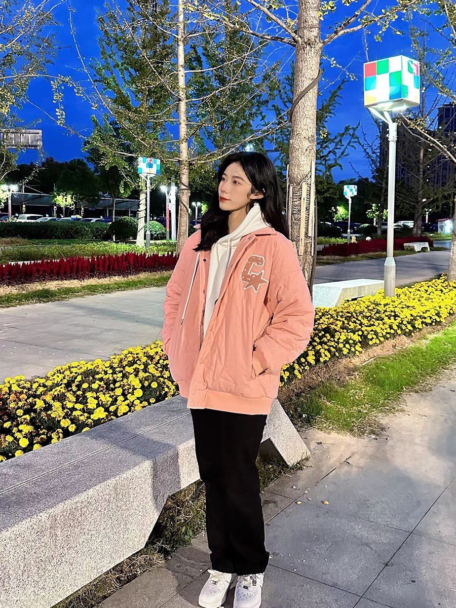 谁说冬天不可以做美少女的?这款粉色棉服就很有少女心,冬天也能轻松显白。 穿搭公式:连帽卫衣+翻领棉服+黑色运动裤 这款棉服没有帽子,所以建议怕冷的小伙伴们可以在里面搭配一个有帽子的卫衣