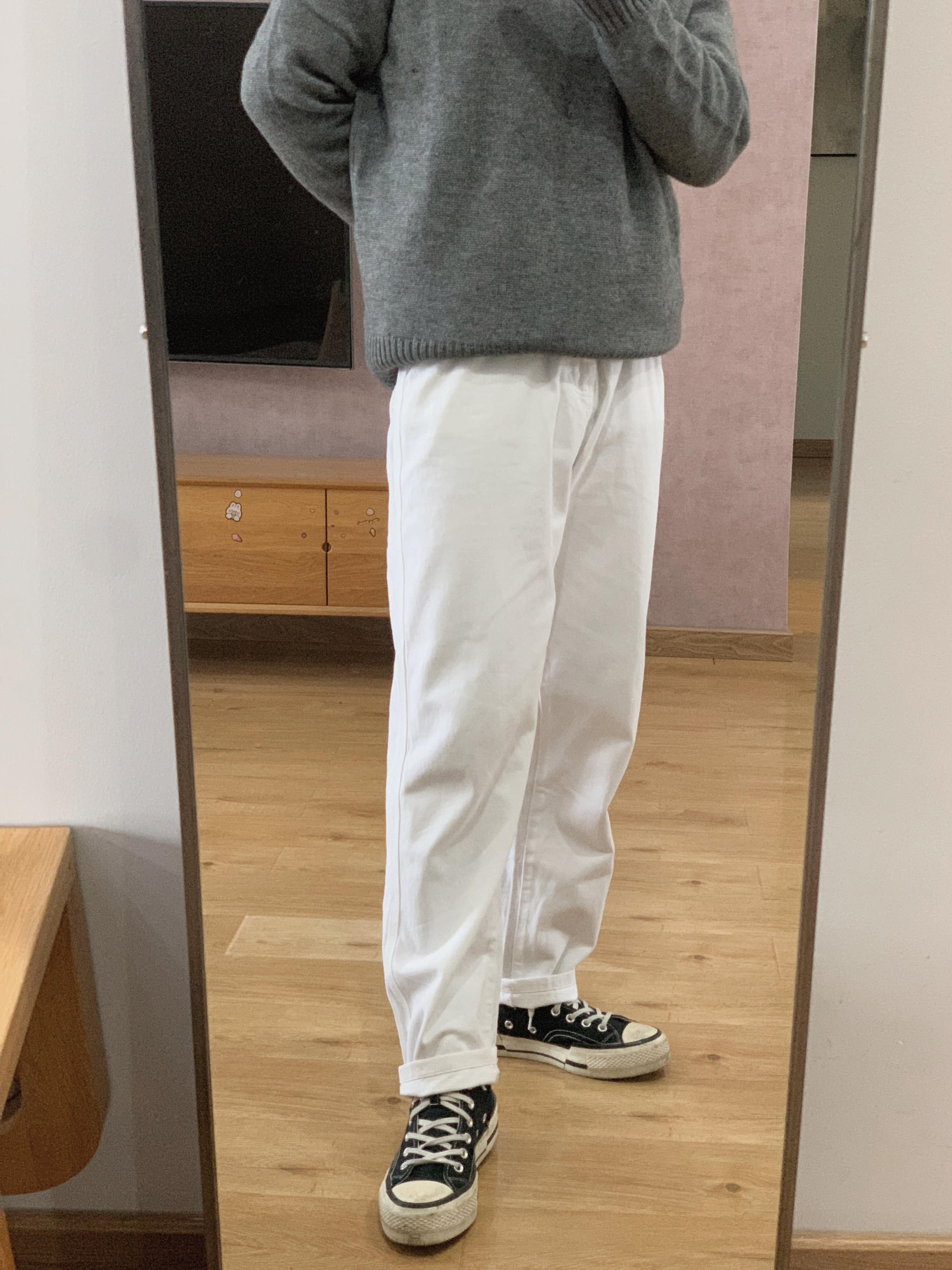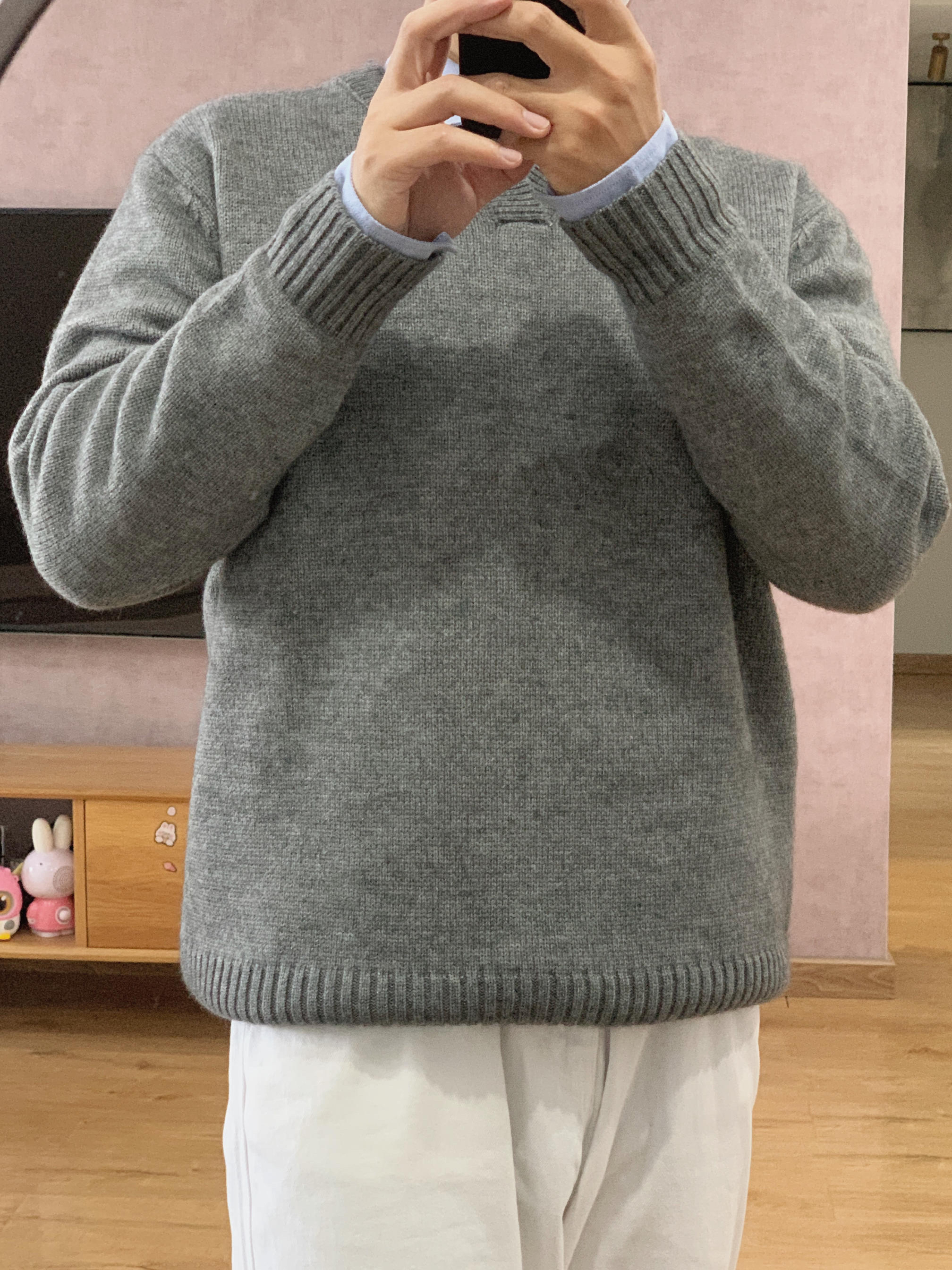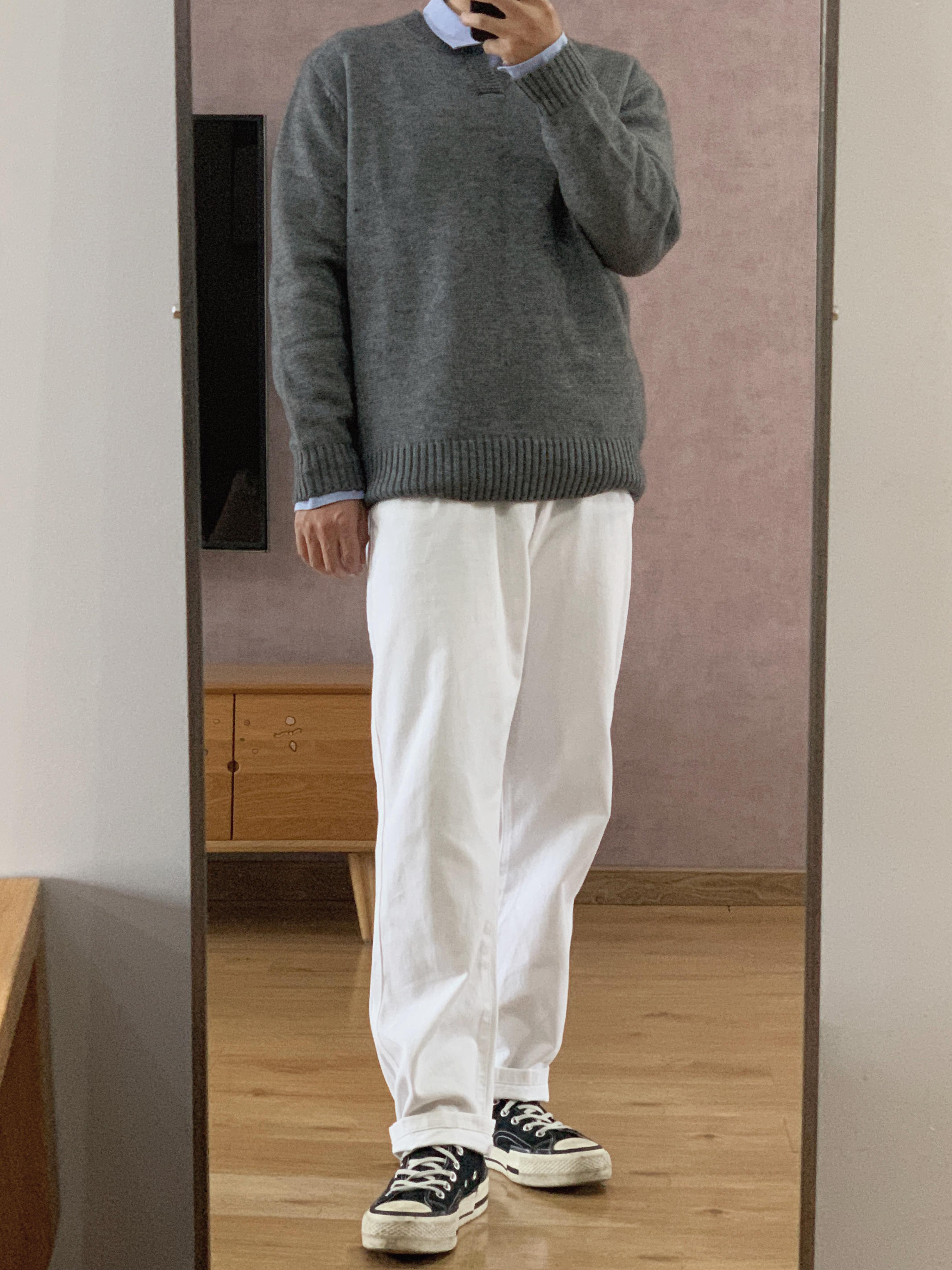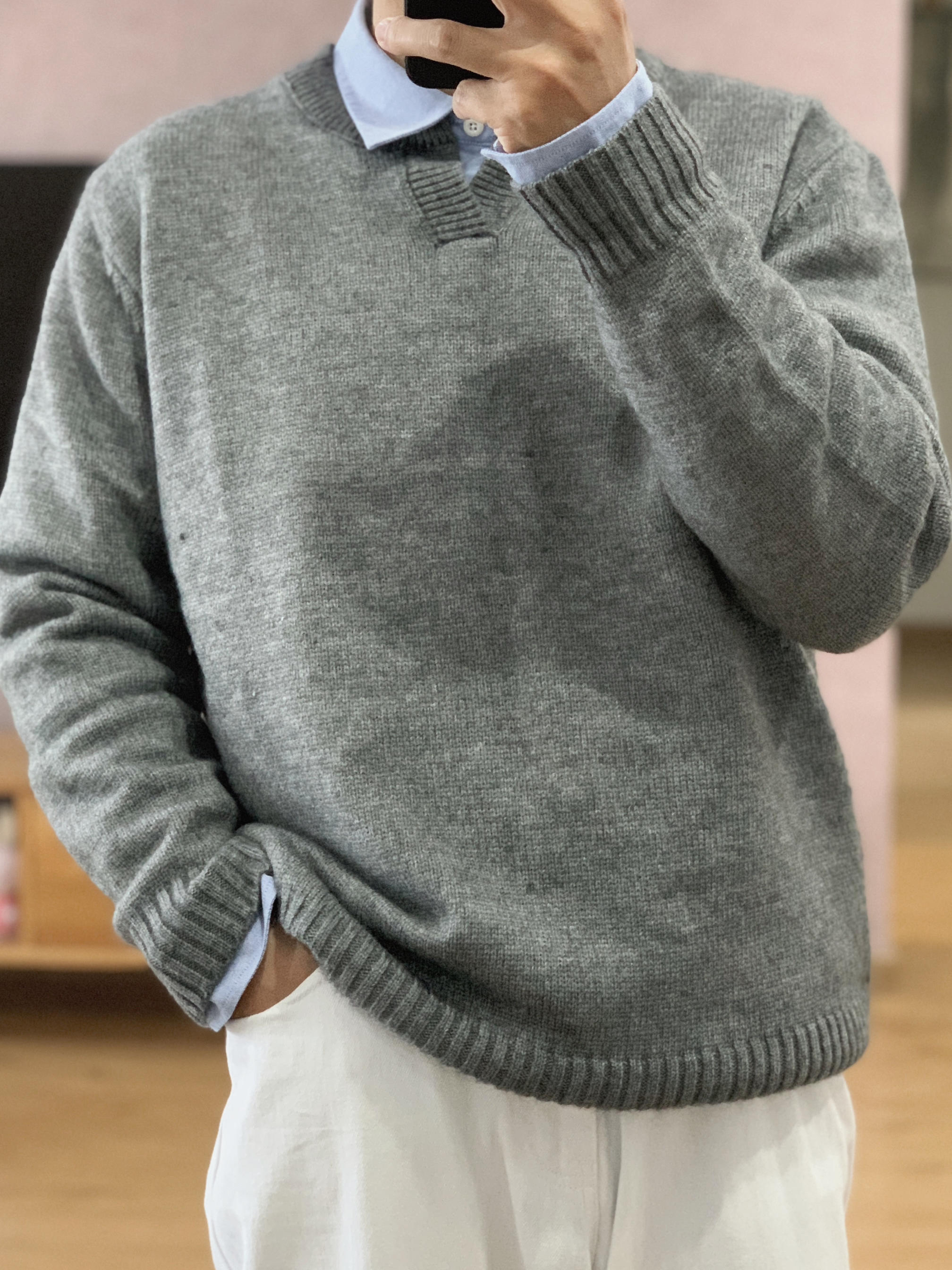 hey 这里是每天记录穿搭的社畜日记。 福建终于降温了!厚衣服可以拿出来穿了! 今天要去拜访客户,稍微正式点。 浅蓝衬衫跟花灰毛衣的搭配规矩中又有一丝休闲。 相比黑色西裤,白色牛仔裤更加年轻休闲。 如果不想太成熟,不妨把皮鞋换成帆布鞋试试。 以上都是我个人想法,欢迎提出宝贵意见。 如果你还在烦恼明天穿什么? 希望我的分享能给你一点儿灵感。 今日乱搭:(175cm 70kg) 浅蓝衬衫XL+灰色毛衣...