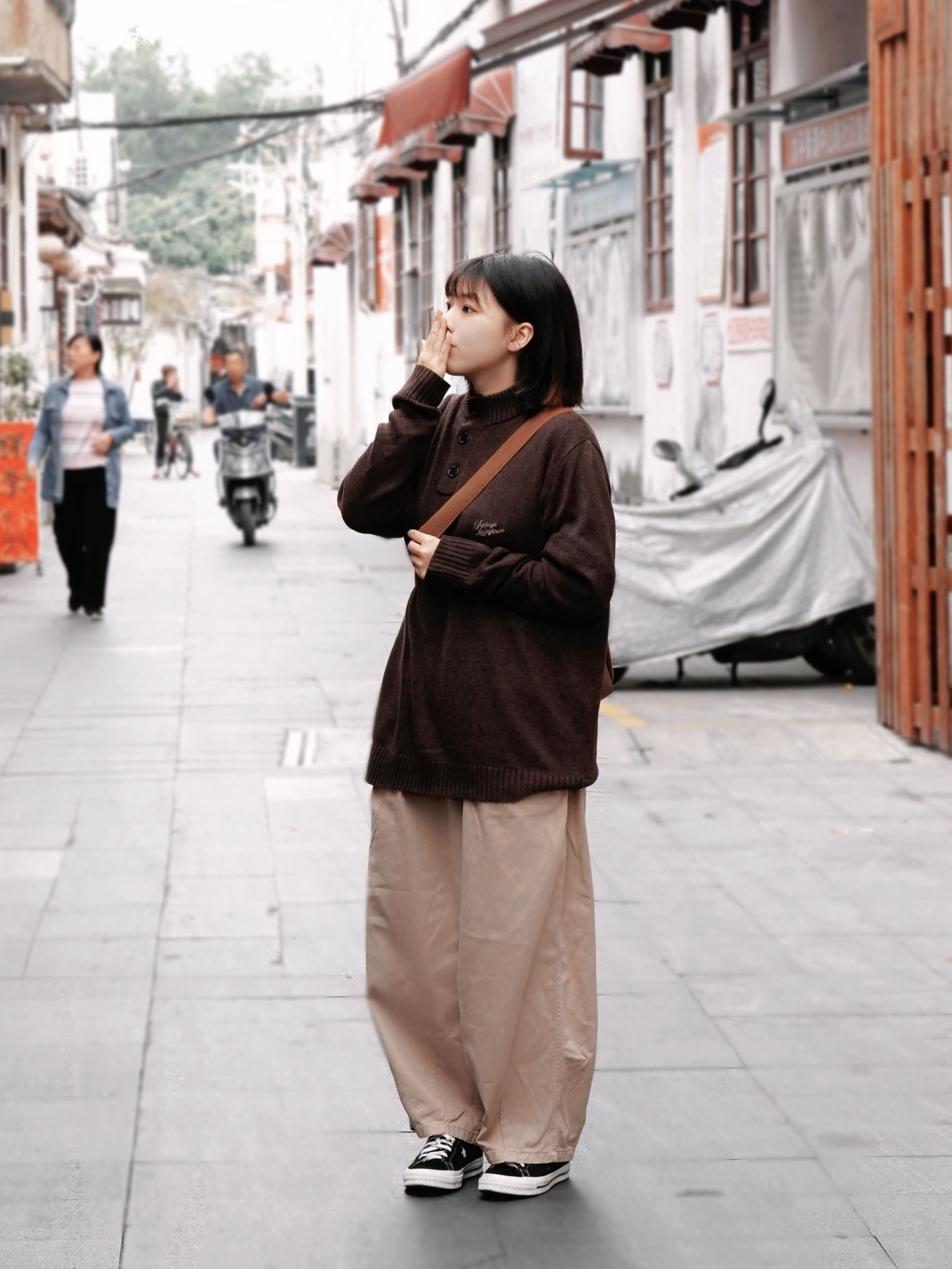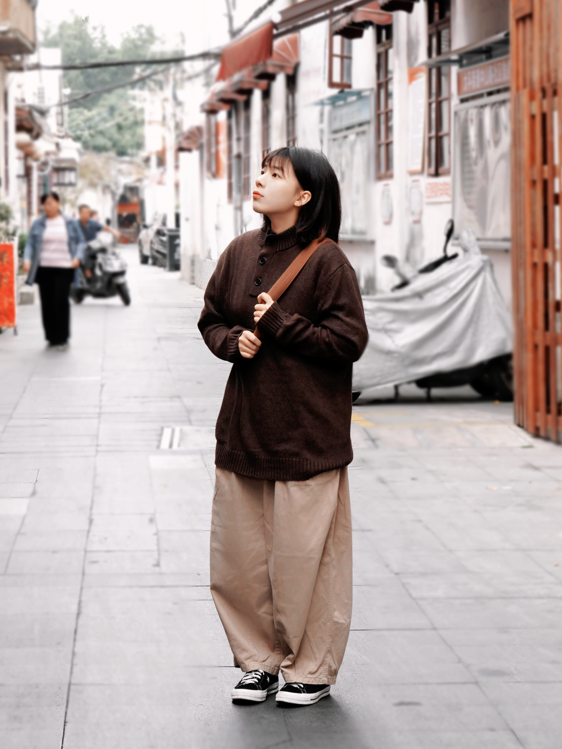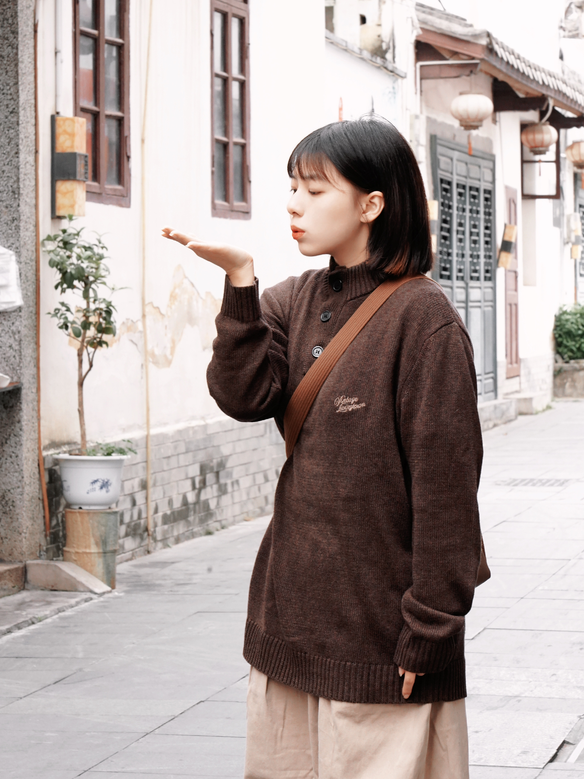 普通人 普通生活 普通过 ———————————————————————— 当当当当 这里日系小孩的复古穿搭频道 人们总是说 不同地方的人都会有不同的穿搭风格 在古城里长大的我格外喜欢穿暖色调的衣服 今日要分享的是平日在小城中游走时经常穿的搭配 广东的秋冬不太冷 上衣我选择的是薄款的棕色毛衣 正肩加上比较有垂感的面料 让微胖女孩穿上很显瘦 毛衣是小高领的设计防止钻风也能保暖脖子 领子加上两个并排纽...