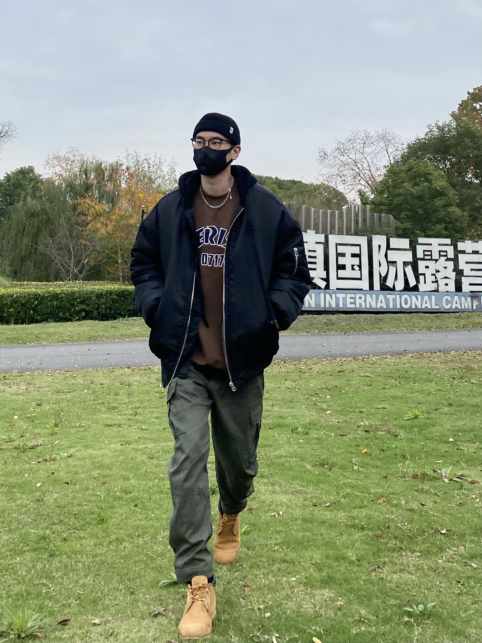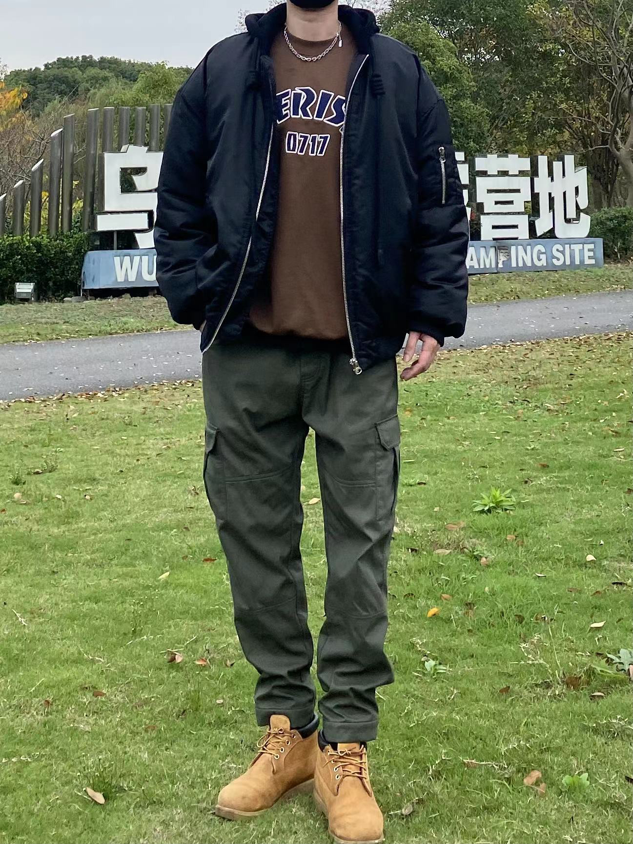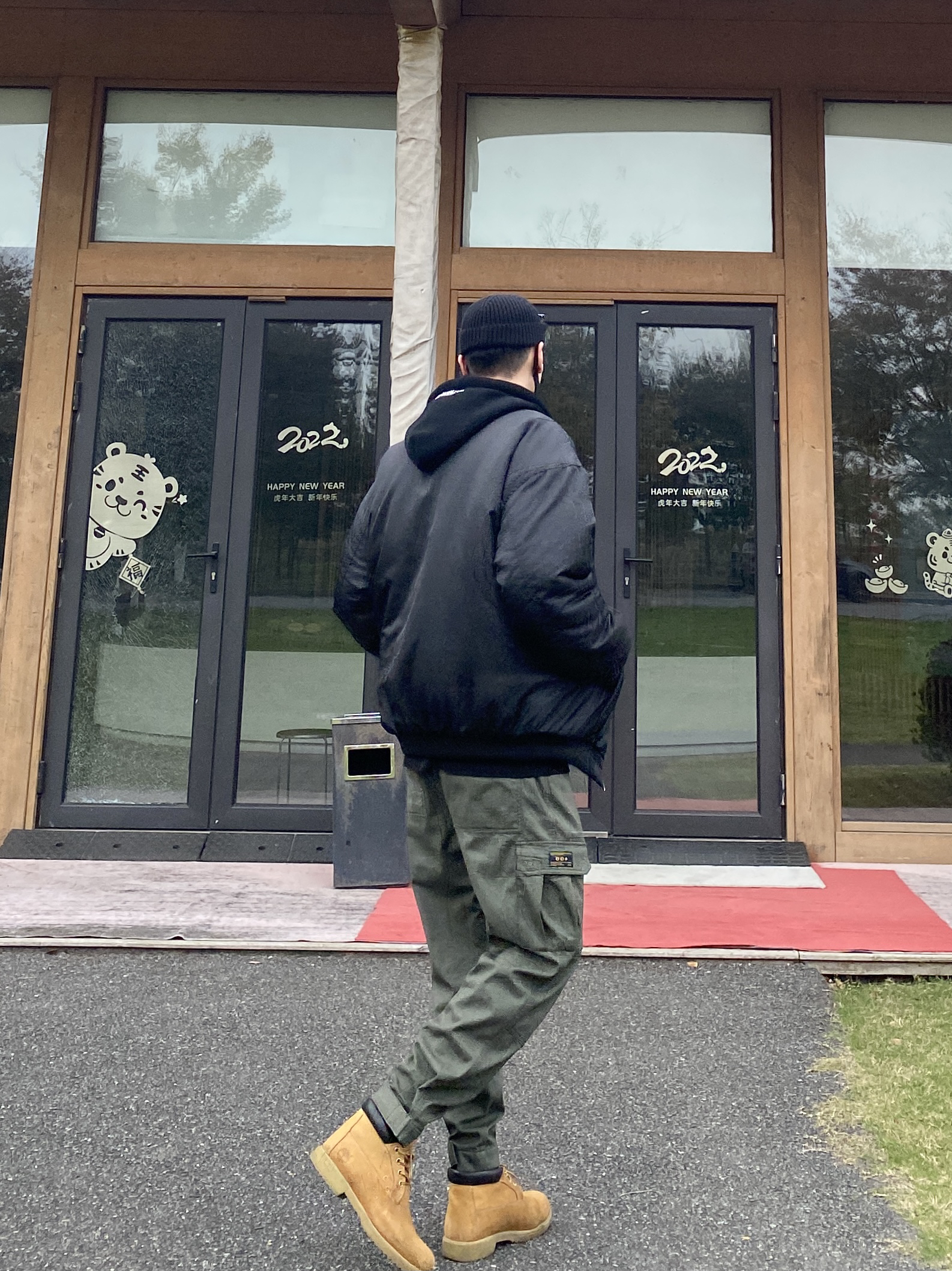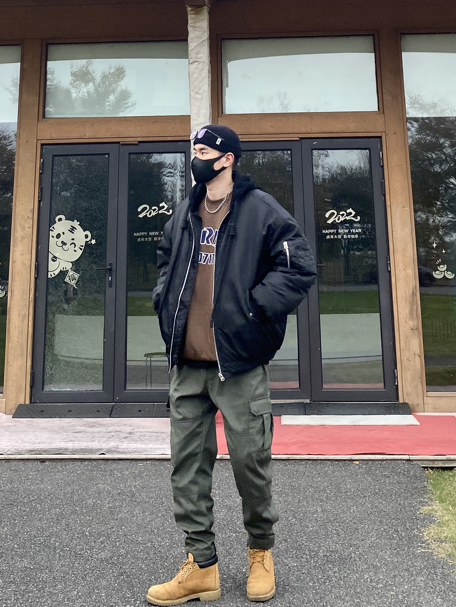 今天这套先用黑T做打底,内搭穿一件深棕色圆领字母印花卫衣,裤子选择军绿色直筒多口袋工装束脚裤,鞋子上脚硬汉必备的timberland工装靴,接着套上宽松阔版假两件连帽空军棉服夹克,最后戴一顶黑色线帽呼应下衣服的颜色,OK,出门看看搭配效果吧! - 今日穿搭 衣服裤子:NICE LILI 鞋子:timberland