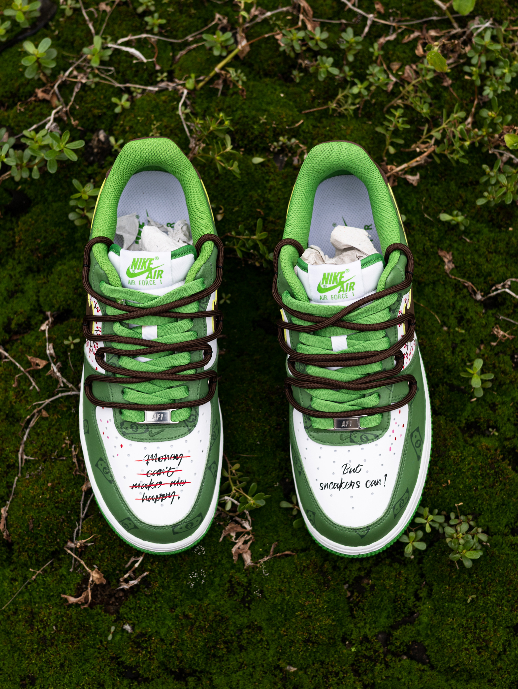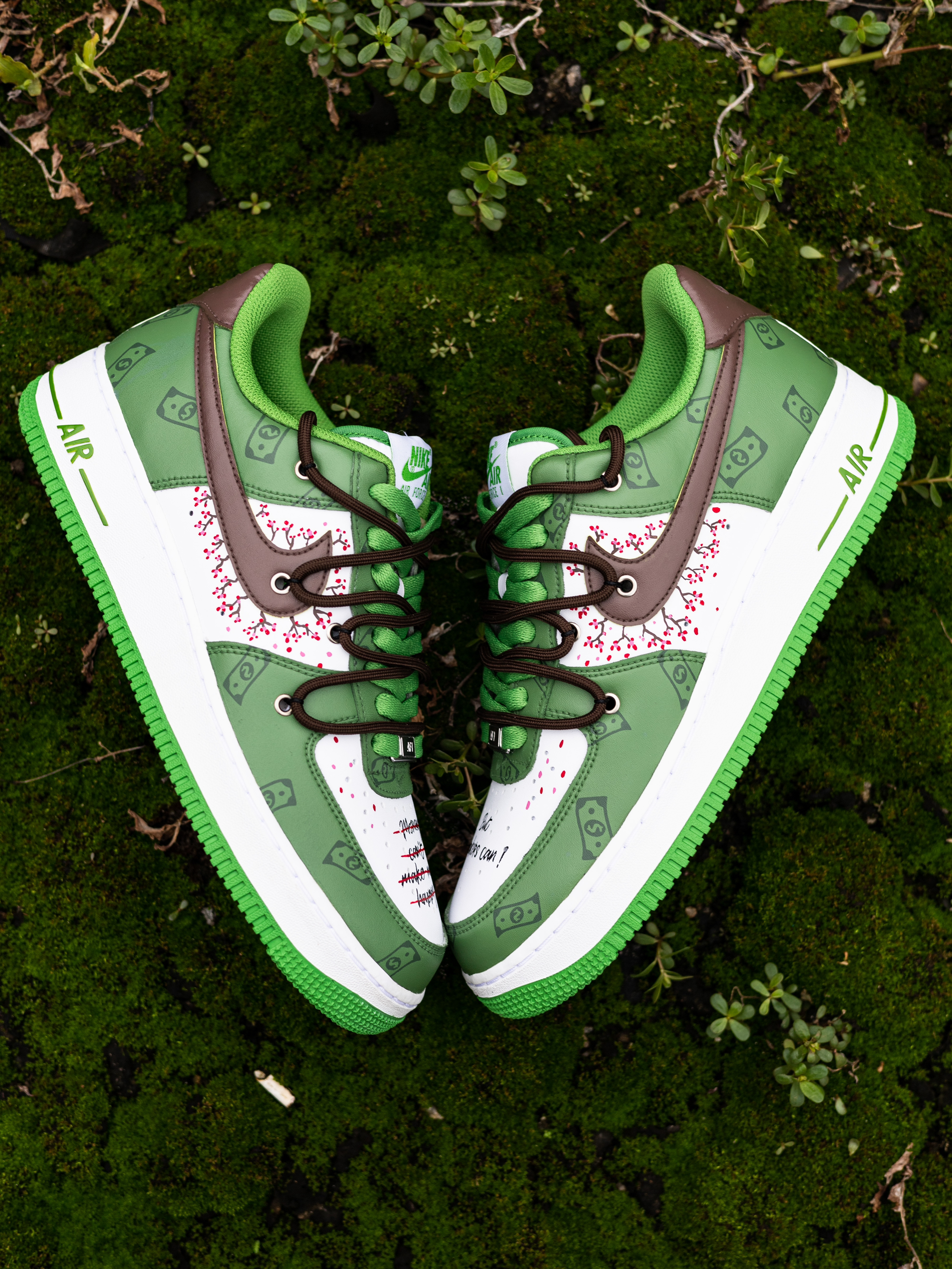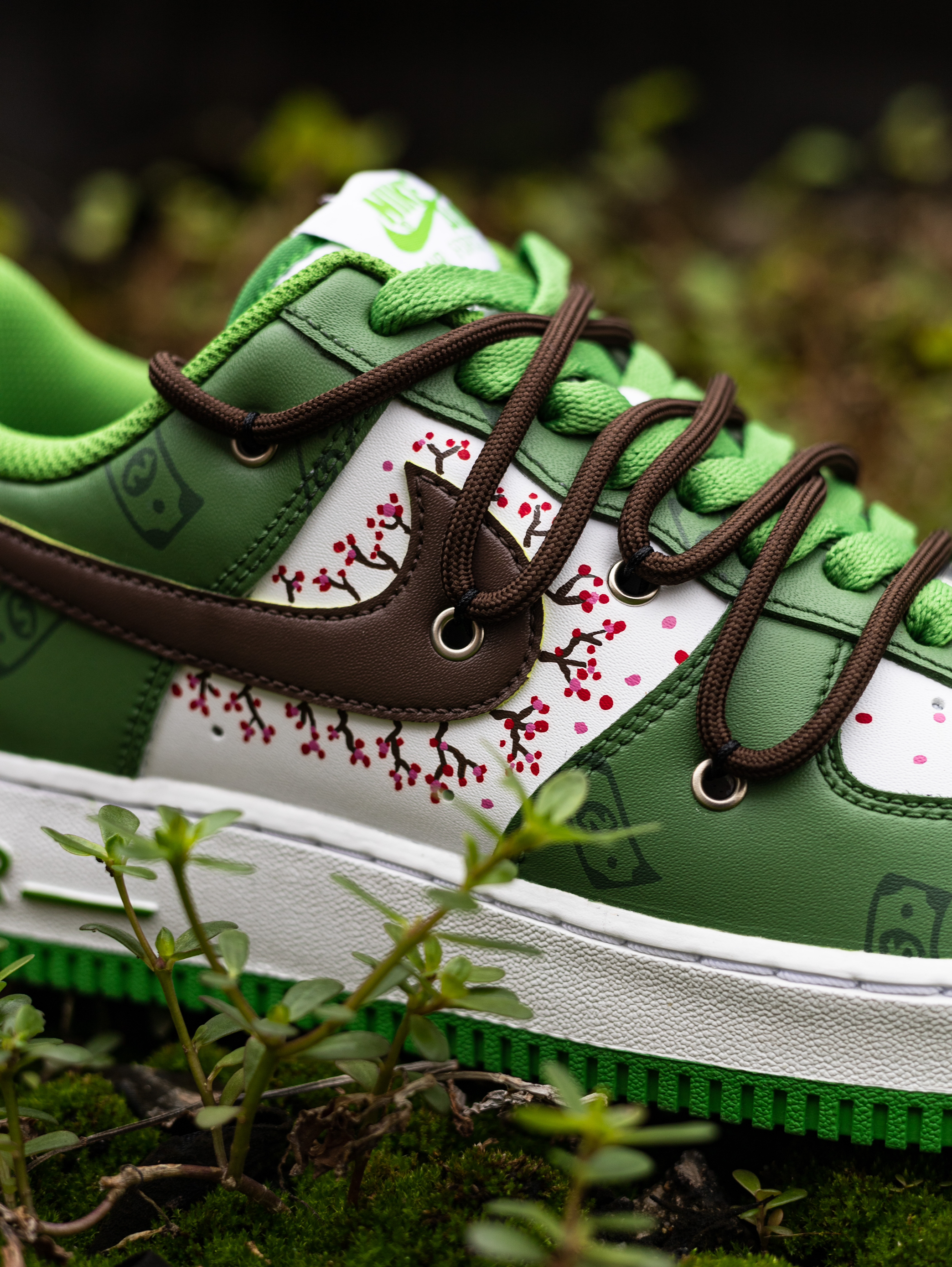 开箱即分享、今天为大家带来一款在平台刚入的空军一号?相比较市面上大部分传统的、这款可有点与众不同哦!实物面对面还是蛮惊艳的!废话不多说、让我们一起沉浸式体验一下: 鞋子大部分采用了翠绿色以及棕色点缀、配色还是比较的高级、视觉体验还是蛮不错的!鞋面做了大量的美元彩绘、尽显潮流时尚感!双解构设计的鞋带也是一个靓点!Swoosh处则是做了樱花绽放的涂鸦、让人眼前一亮的同时也寓意着:花开富贵的美好祝福!...