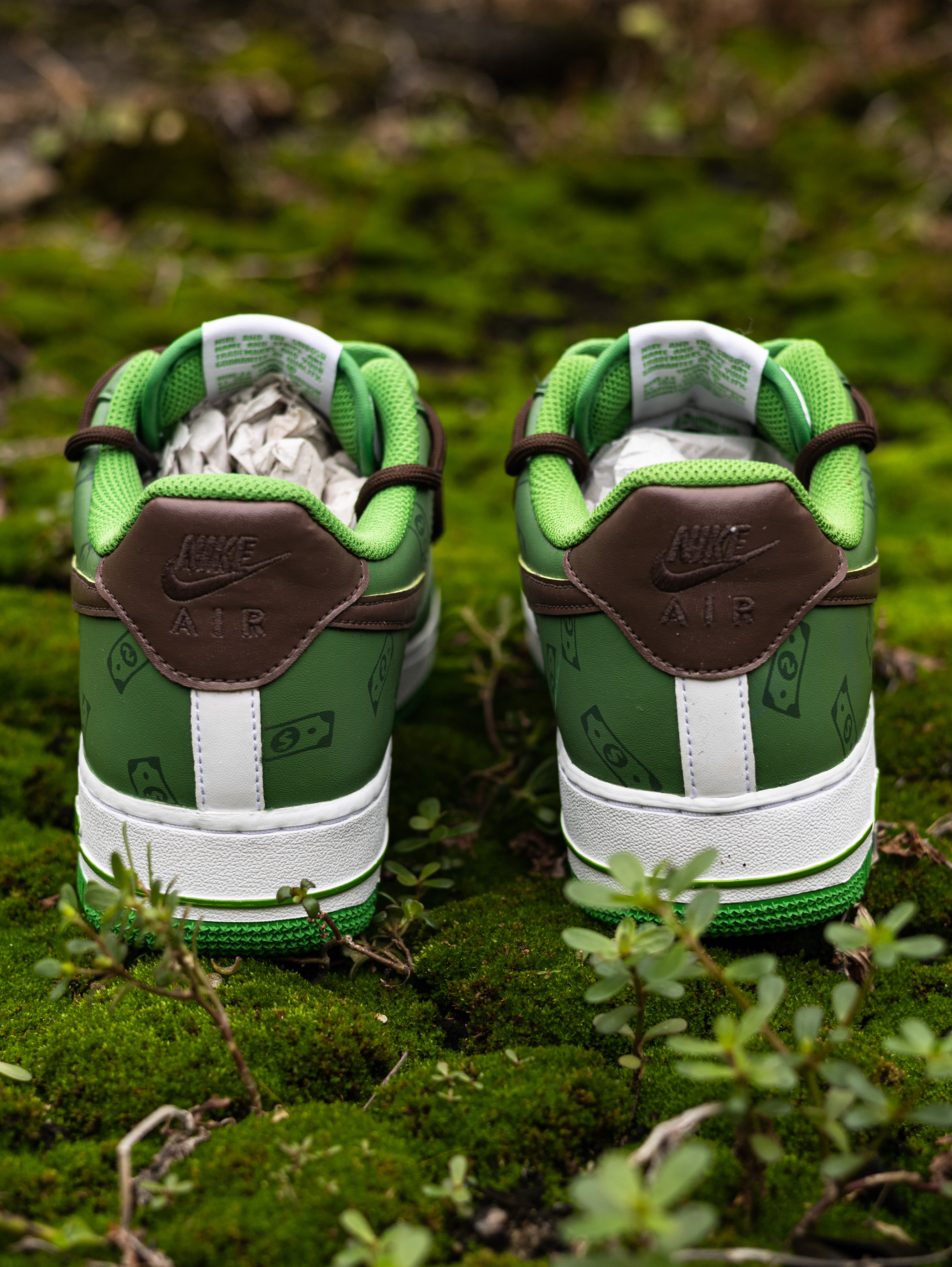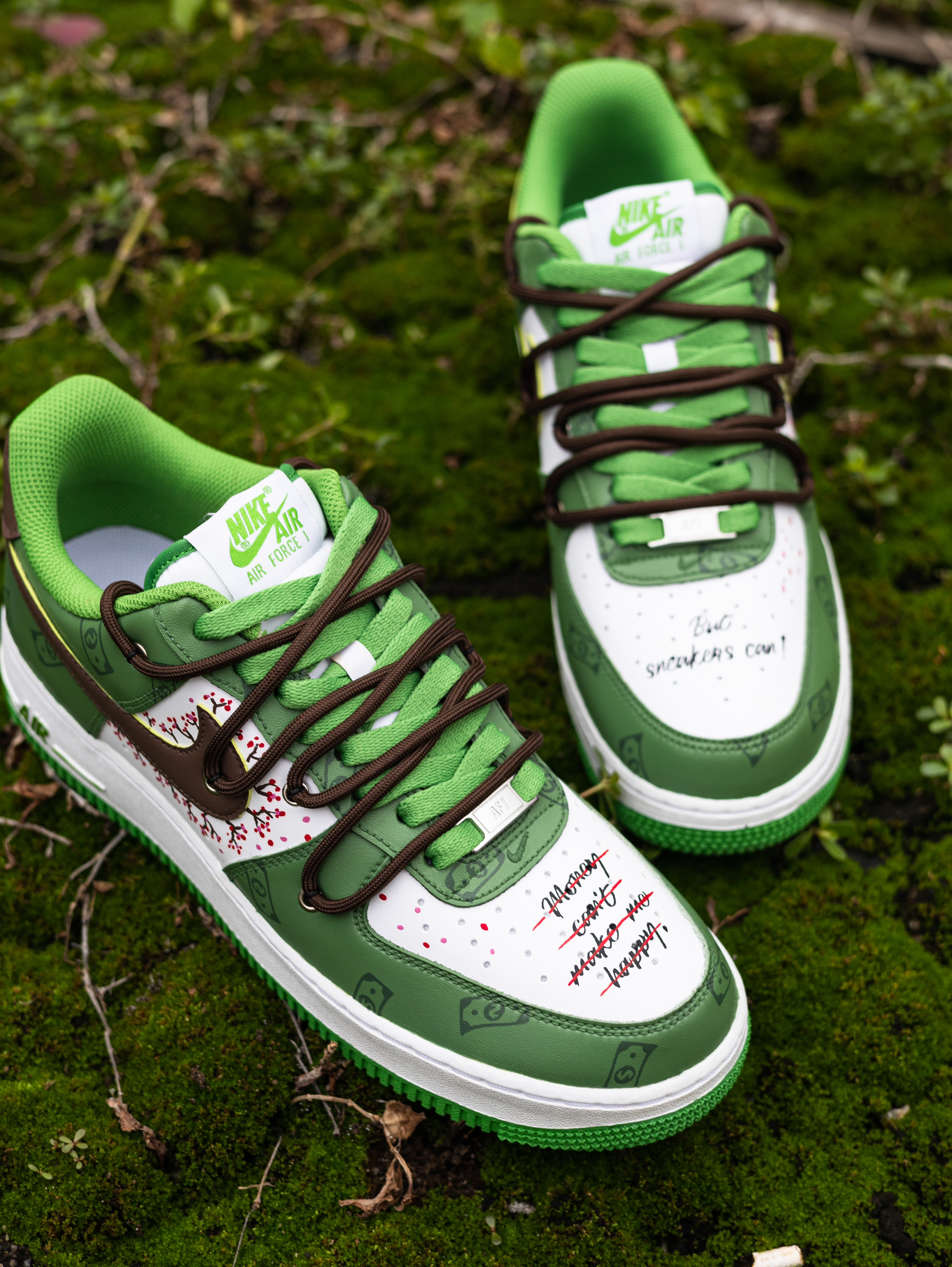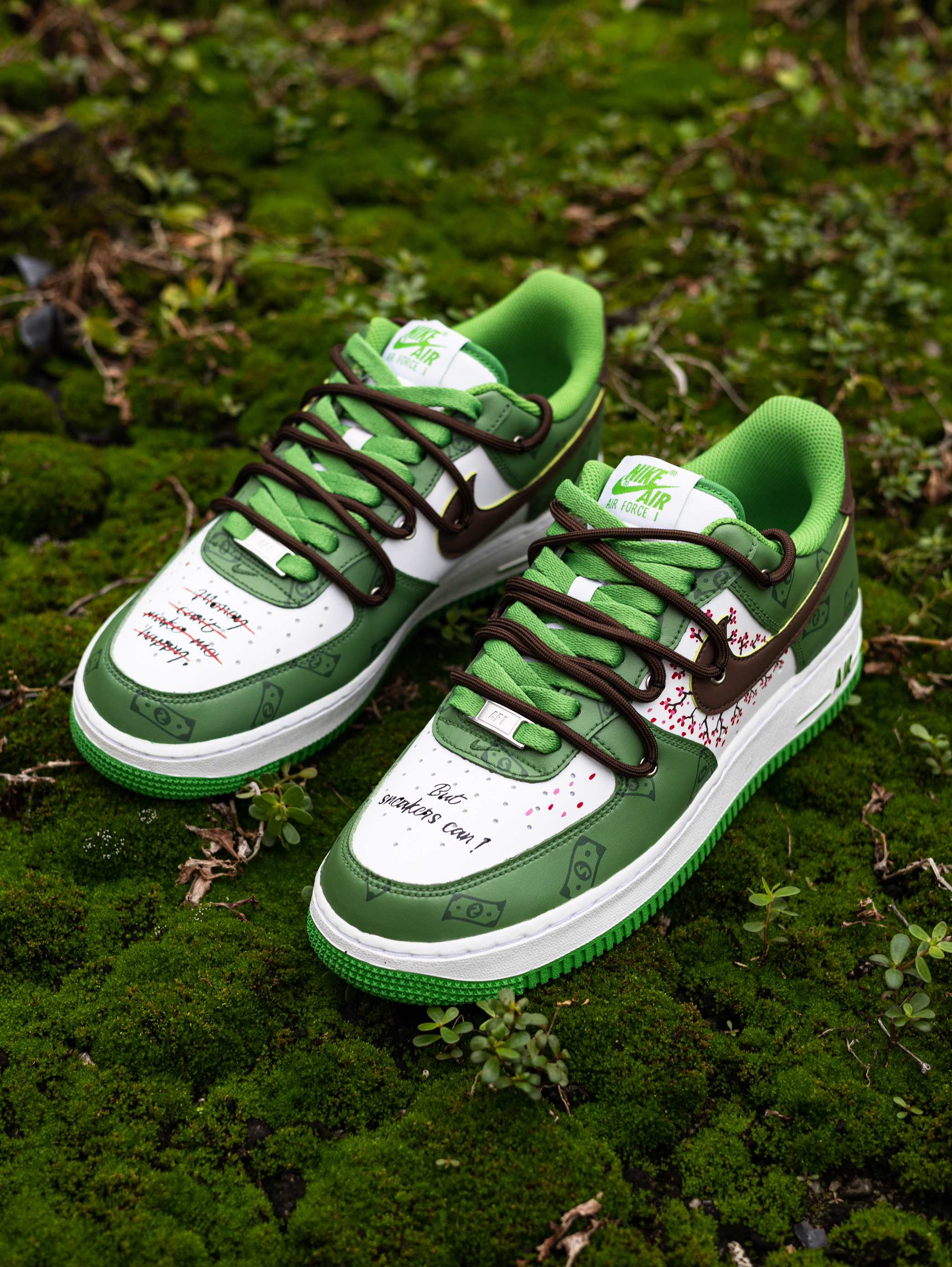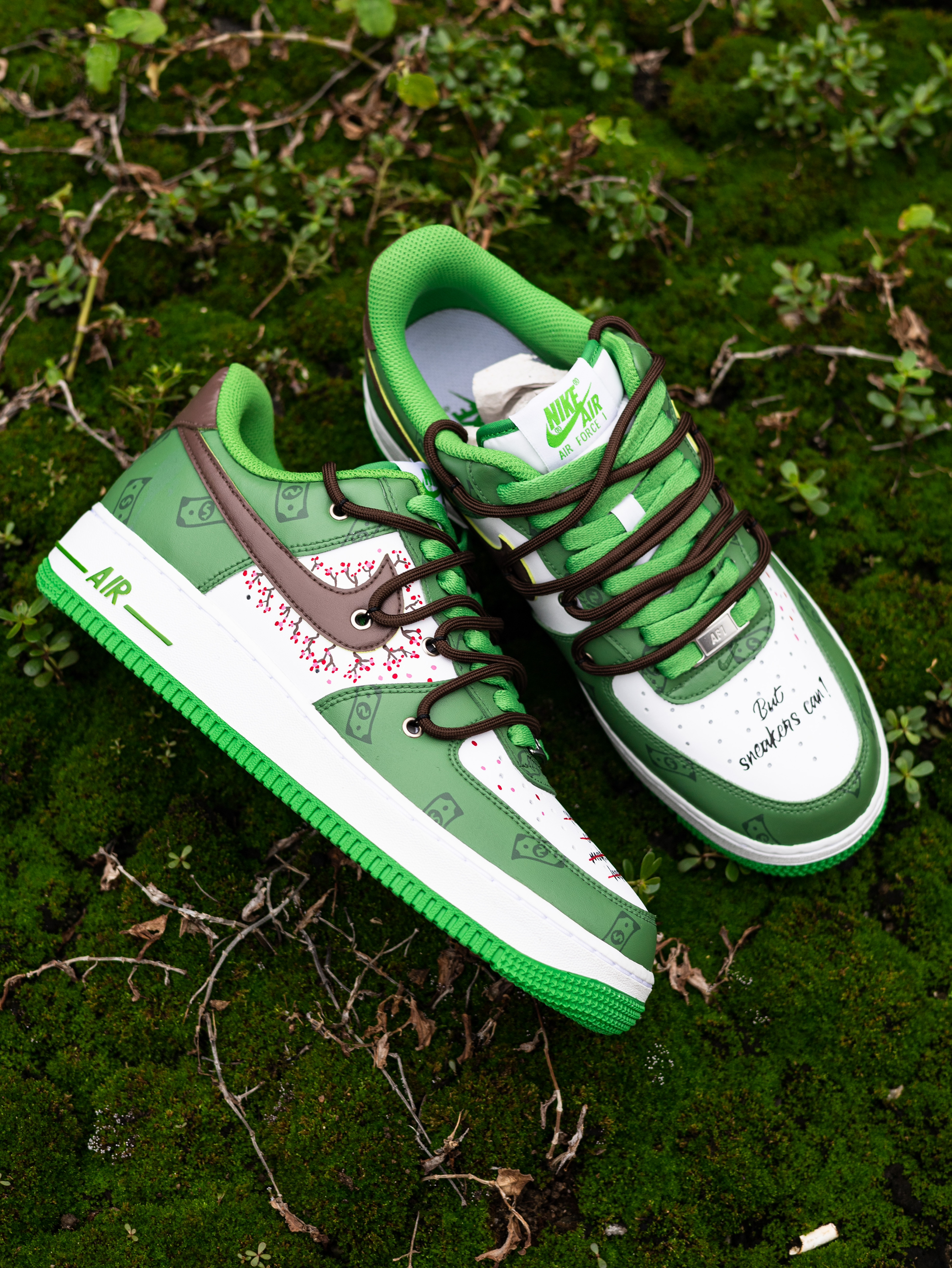 开箱即分享、今天为大家带来一款在平台刚入的空军一号?相比较市面上大部分传统的、这款可有点与众不同哦!实物面对面还是蛮惊艳的!废话不多说、让我们一起沉浸式体验一下: 鞋子大部分采用了翠绿色以及棕色点缀、配色还是比较的高级、视觉体验还是蛮不错的!鞋面做了大量的美元彩绘、尽显潮流时尚感!双解构设计的鞋带也是一个靓点!Swoosh处则是做了樱花绽放的涂鸦、让人眼前一亮的同时也寓意着:花开富贵的美好祝福!...