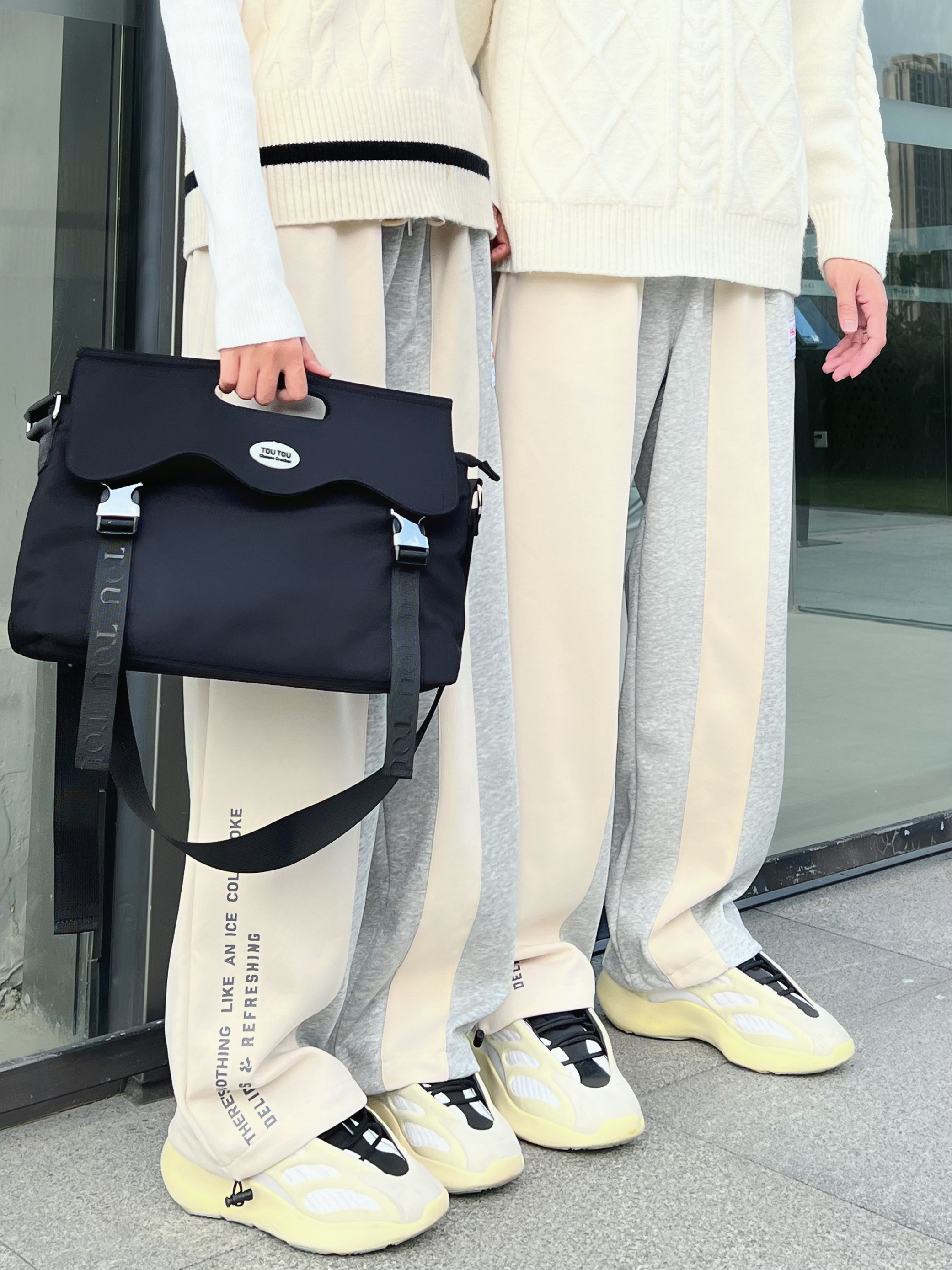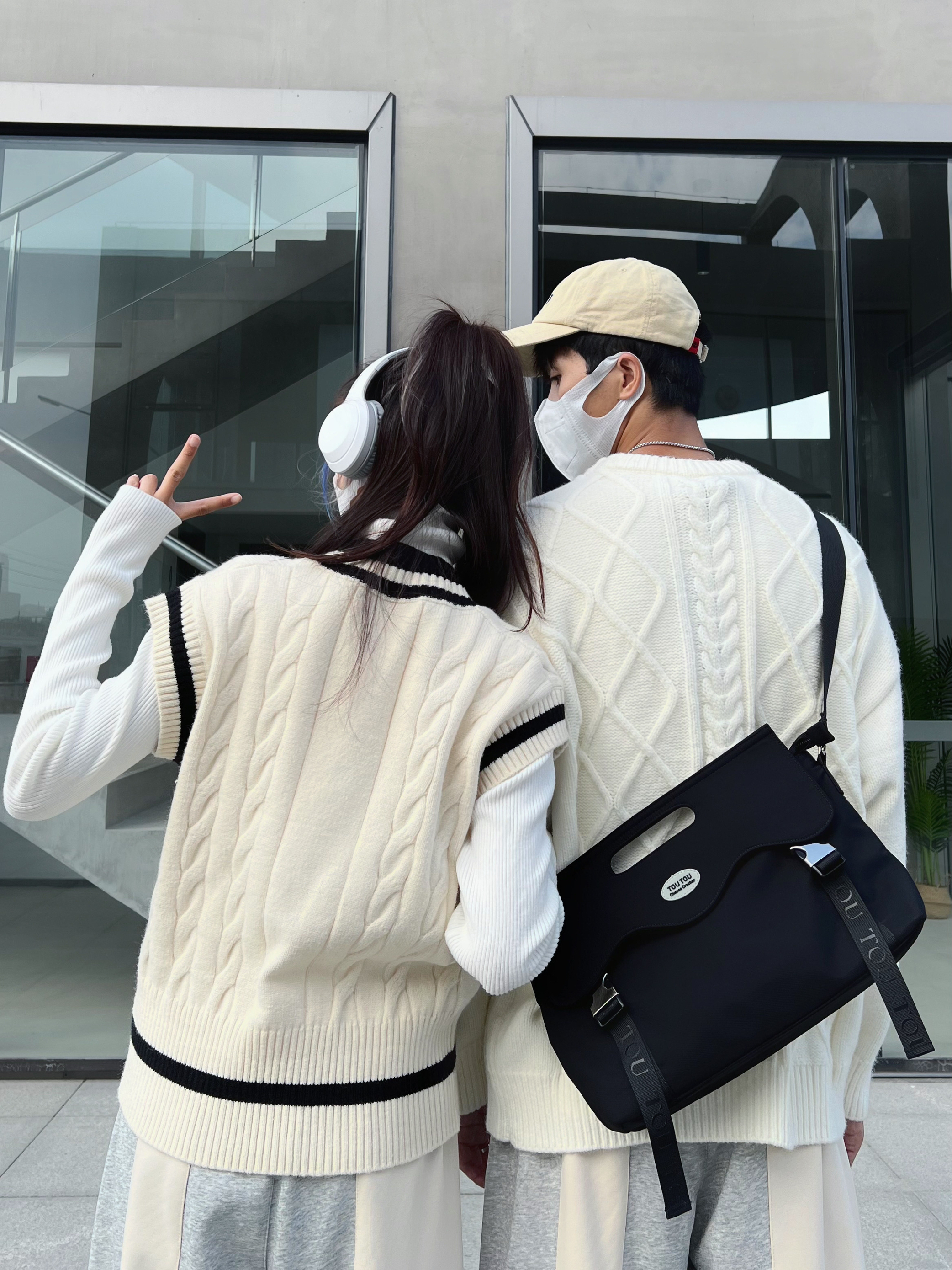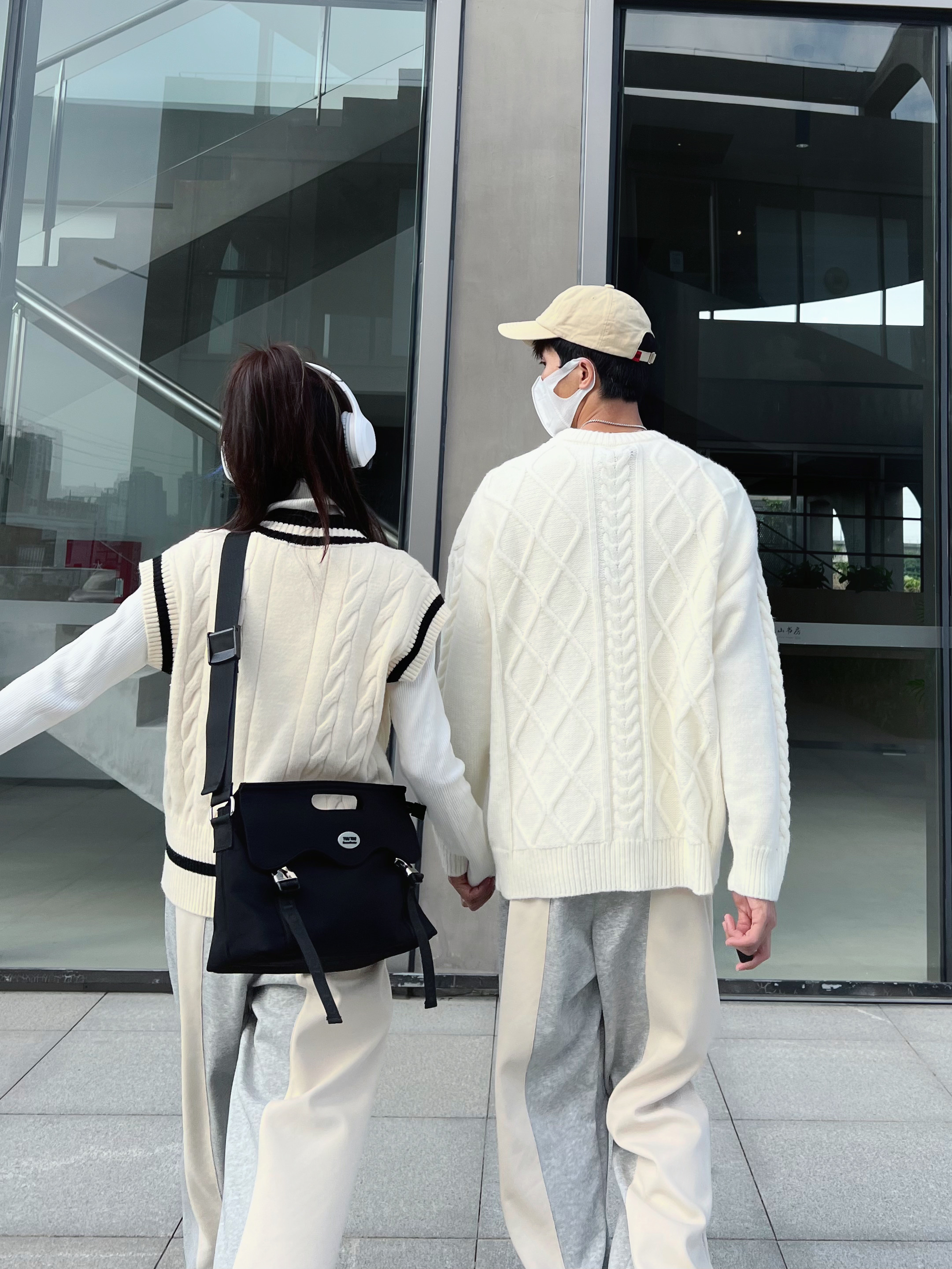 浅色系穿搭也很好看呢🏻 今天这套还用韩系的~ 米白色毛衣搭配可口可乐的撞色休闲裤 同样也是浅色系的 米白拼浅灰色也很养眼~ 配饰上来一只黑色的斜挎包 toutou这款男女同款的斜挎包还蛮百搭的 女友和我都能用!是很实用的一款包没错啦! 方形的设计还带点学院风的感觉~ 跟今天这套韩系休闲风还蛮搭的! 容量挺大的 出门完全够用☑️