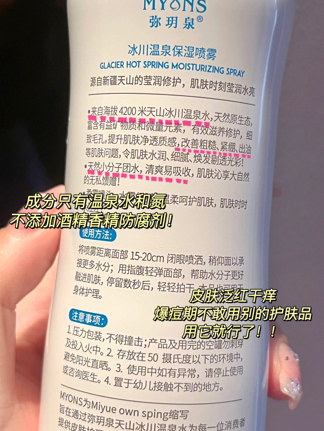 不藏了不藏了! 天天呆在空调房里 皮肤敏感又泛红 什么功效型的护肤品都不敢用了 只敢用这种活泉取水的补水喷雾了!🥰 U1S1!自从用过就不想换别的了! 尤其在妆前喷一喷 弥玥泉补水喷雾 底妆都服帖很多! - 它成分可不是普通的水嗷! 是来自新疆天山4200米冰川温泉水💦 不含酒精香精防腐剂! 成分精简到不行! 就算是烂脸爆痘期也没在怕的😌 用着好安心! - 出雾也很细腻! 细到喷在脸上都不会挂水珠...