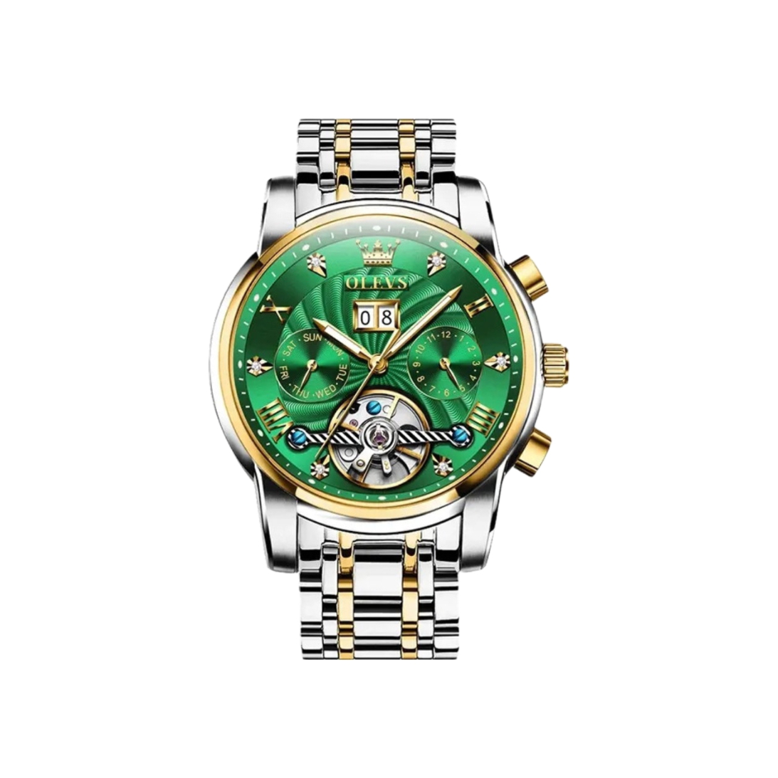 本篇笔记关联了OLEVS/欧利时 瑞士认证品牌双日历黑科技高档钢带霸气多功能夜光防水运动镂空机械男士手表 间金绿面等商品,为用户提供真实的使用体验和购买参考。
