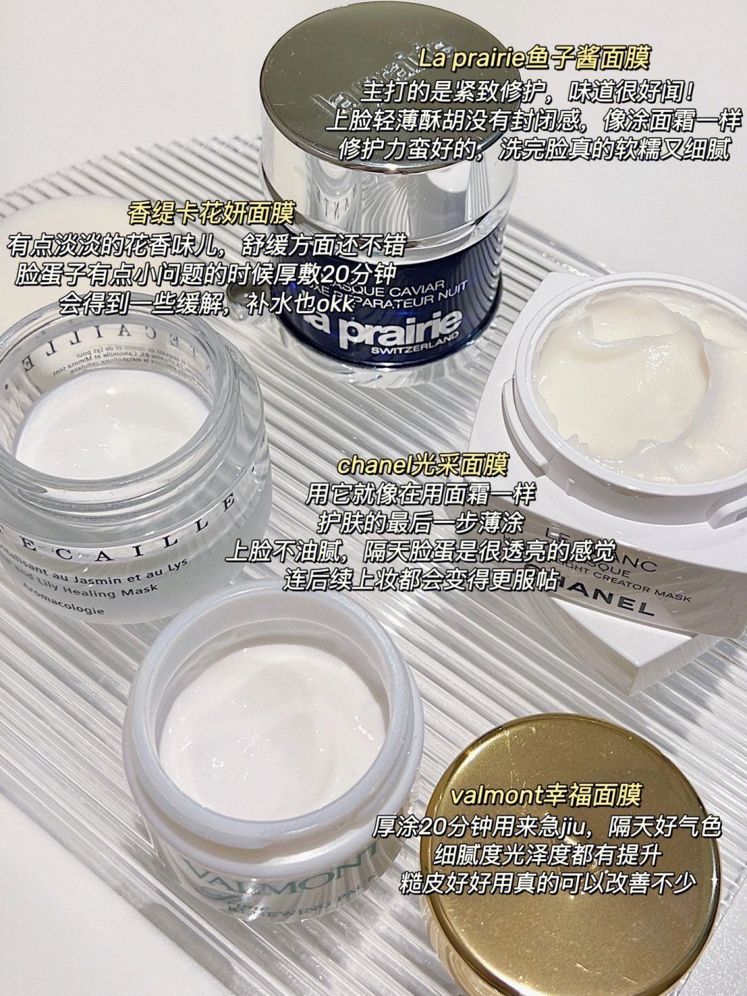 参考皮肤:夏天混合皮/冬天混干皮/T区爱出油/也会冒闭口/偶尔长do子 我日常是很爱用涂抹面膜的 给我感觉其实比贴片方便,可以不用一直躺着!涂抹完之后可以做别的事情,省时间! 手里的这些都是日常常用的!很多都空罐了 简单来share一下我的一些使用心得! valmont幸福面膜 chanel光采面膜 香缇卡花妍面膜 La prairie鱼子酱面膜 evelom急救面膜 伊菲丹超...