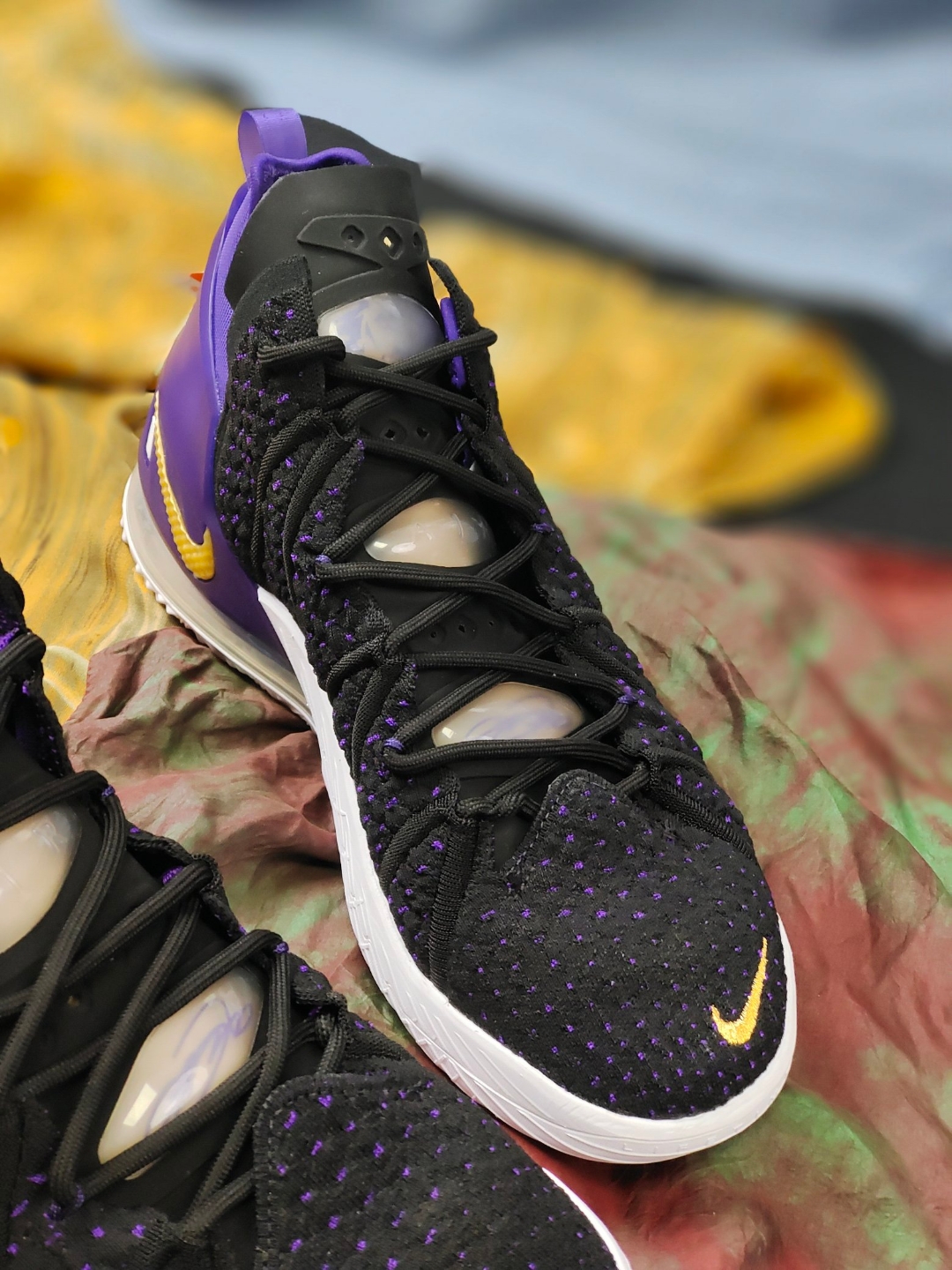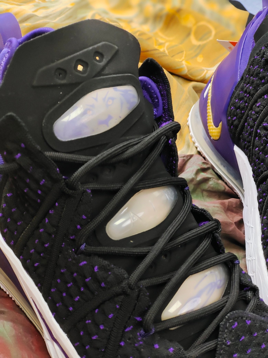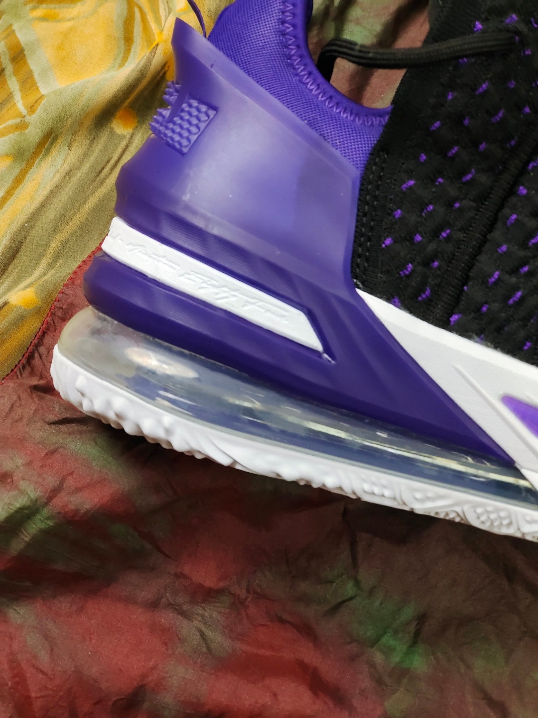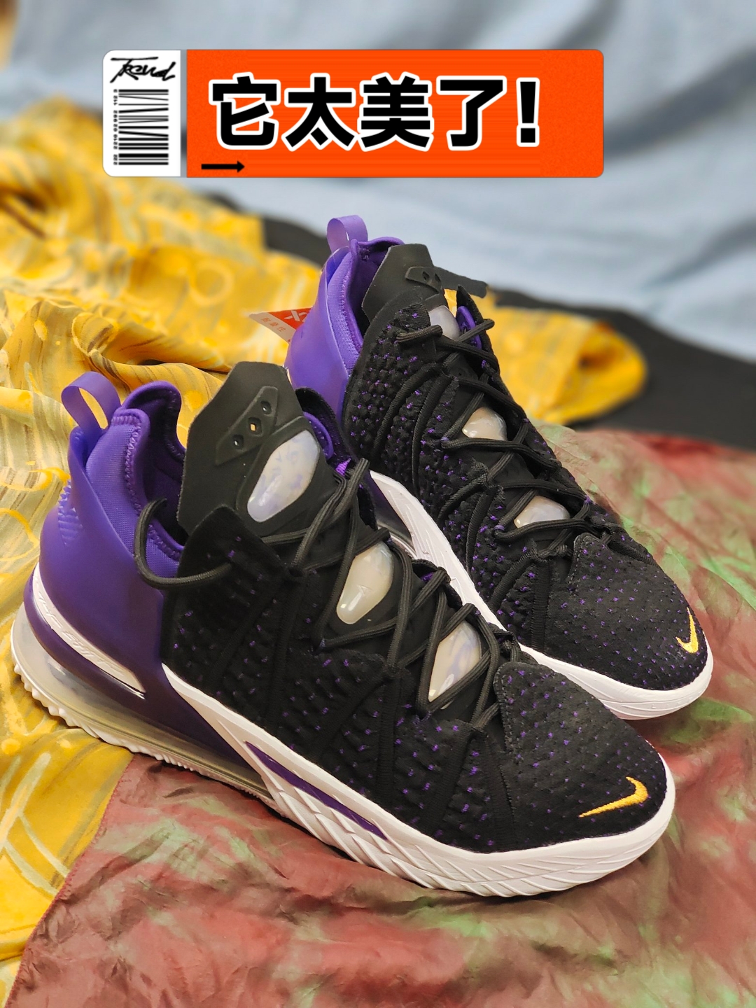 大家好,今天给大家分享这双勒布朗詹姆詹姆斯18代的湖人黑紫配色 这双鞋子拿到手上给我的感觉就是非常高贵,给人一种低调奢华的感觉,很复杂的编织纹路鞋面,鞋舌上面的三个气囊基本上每个配色都差不多,后跟的硬质tpu上面有皇冠詹姆斯logo,后跟位置有提鞋绳,方便穿脱 外底做了上提处理,可以把你的后跟位置牢牢固定住,前掌防侧翻还可以,但是这双鞋子体重比较轻的话,不推荐,重心实在是非常高 白色橡胶大底纹路真...