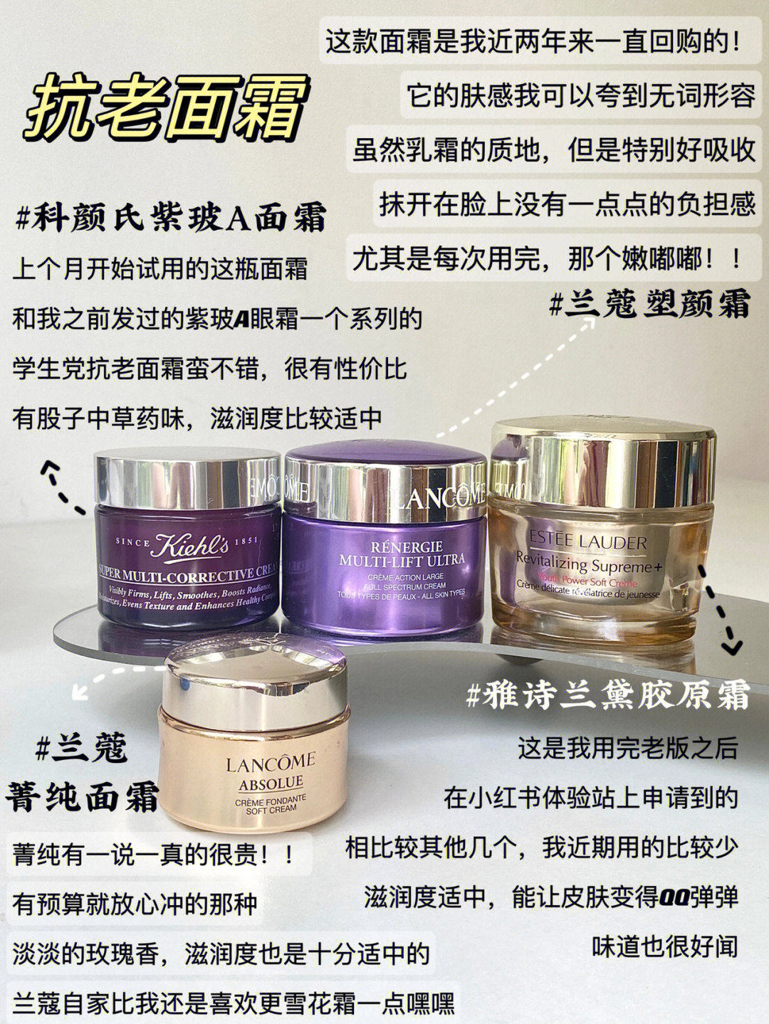 感谢🙏雅诗兰黛的产品赞助,谢谢谢谢谢谢谢谢谢 👀Part1:保湿修护面霜 科颜氏高保湿霜/科颜氏果冻面霜 混合皮秋冬滋润版,春秋清爽版 大油皮一年四季清爽版,干皮滋润版 👀Part2:抗老面霜 科颜氏紫玻A面霜/雅诗兰黛胶原霜 兰蔻塑颜霜 /兰蔻菁纯面霜 新手入门可以选科颜氏,注重肤感可以选雪花霜 菁纯和胶原霜暂时没有比较出很大的区别 👀Part3:妆前面霜 Nars大白霜/芭比布朗橘子面...